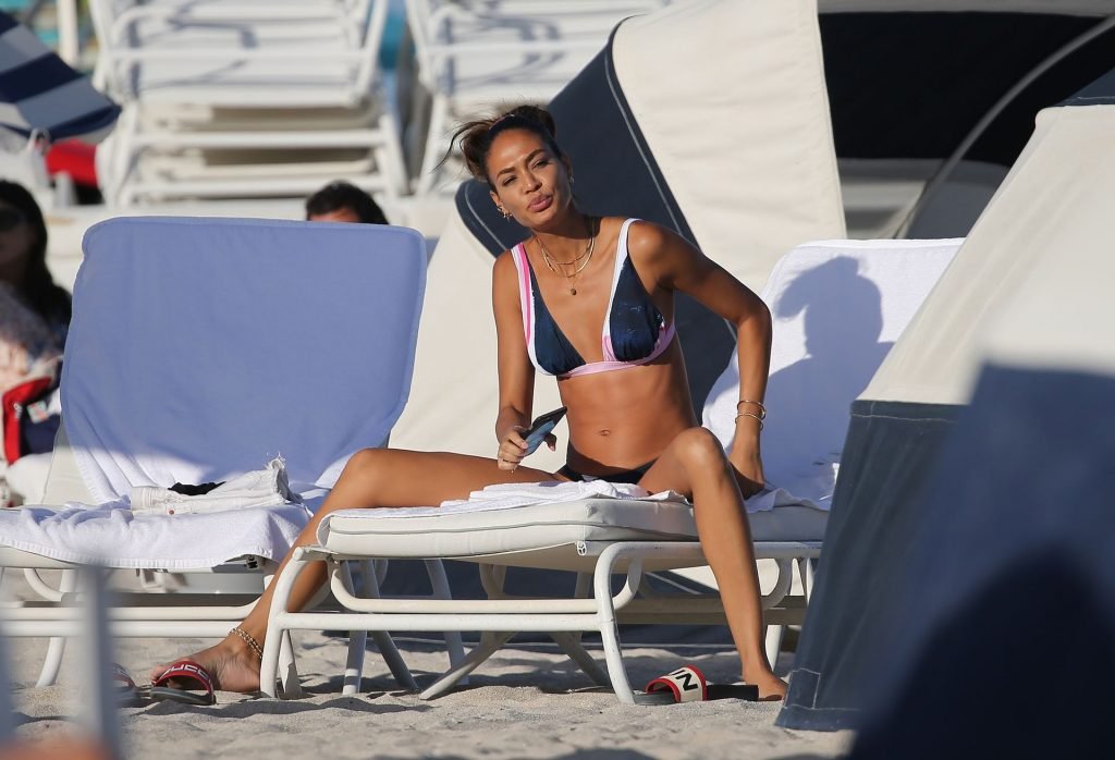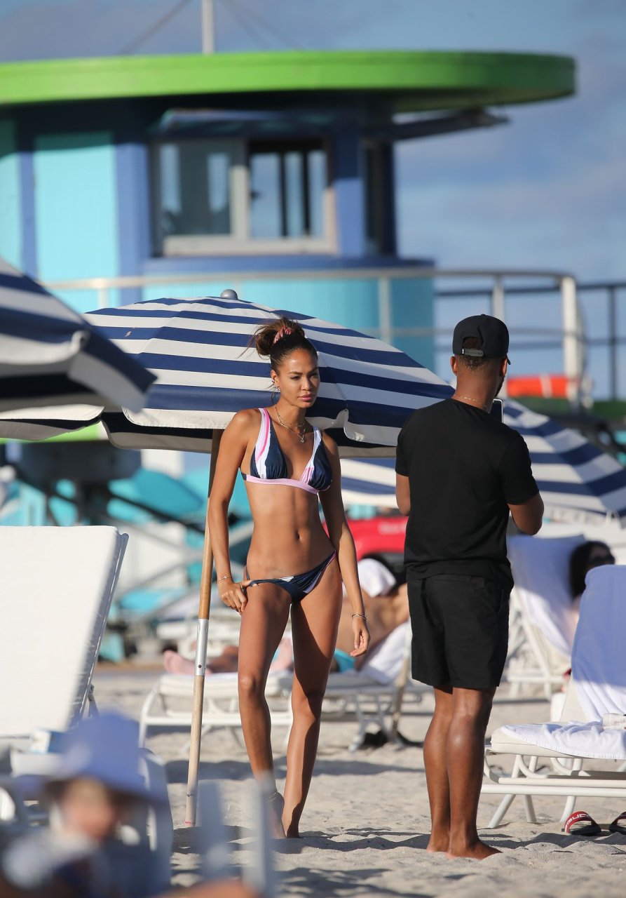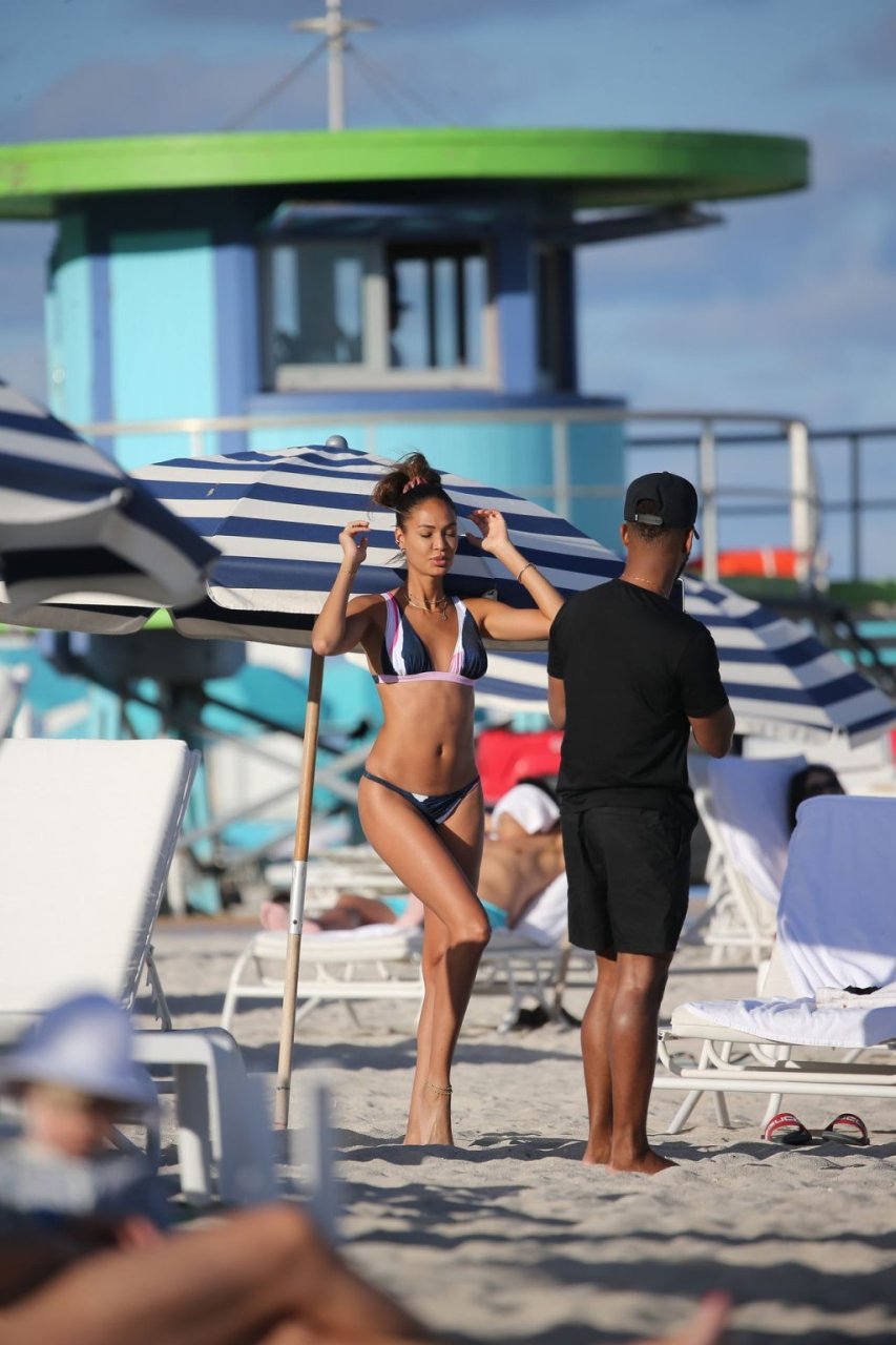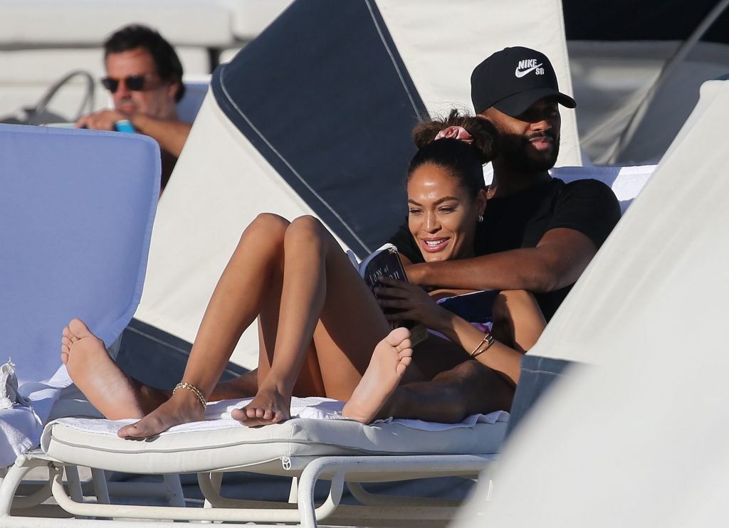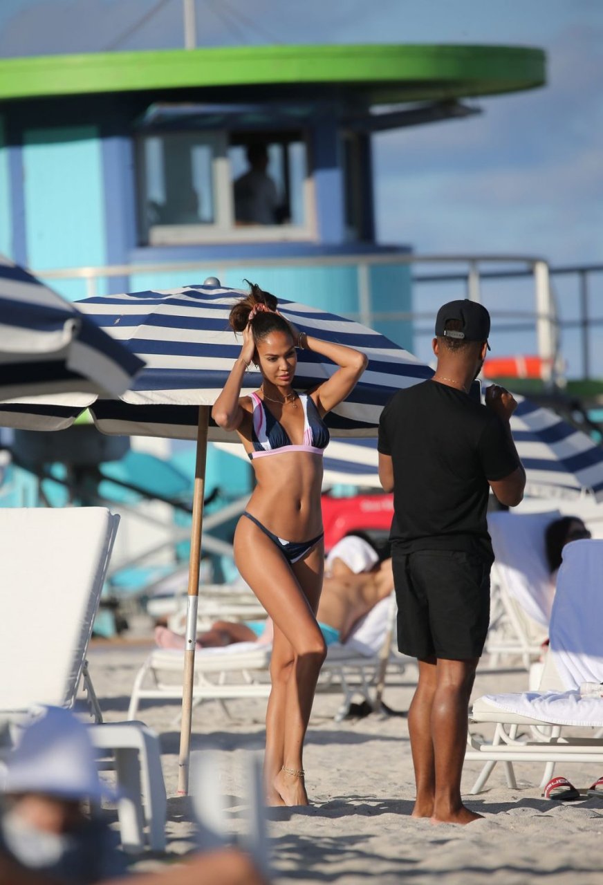 Model Joan Smalls recluta a su novio Bernard Smith como fotógrafo mientras posa seductoramente en bikini en la playa de Miami.