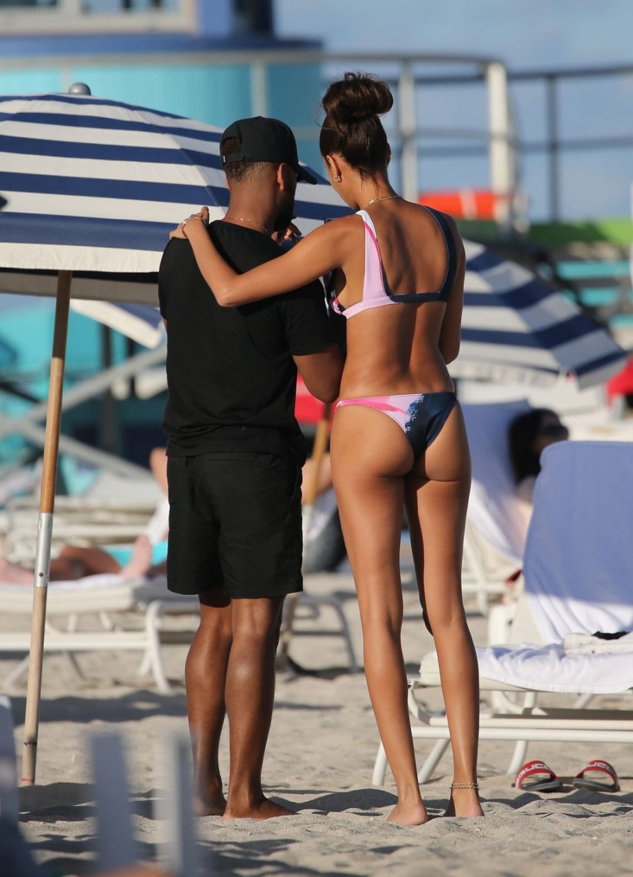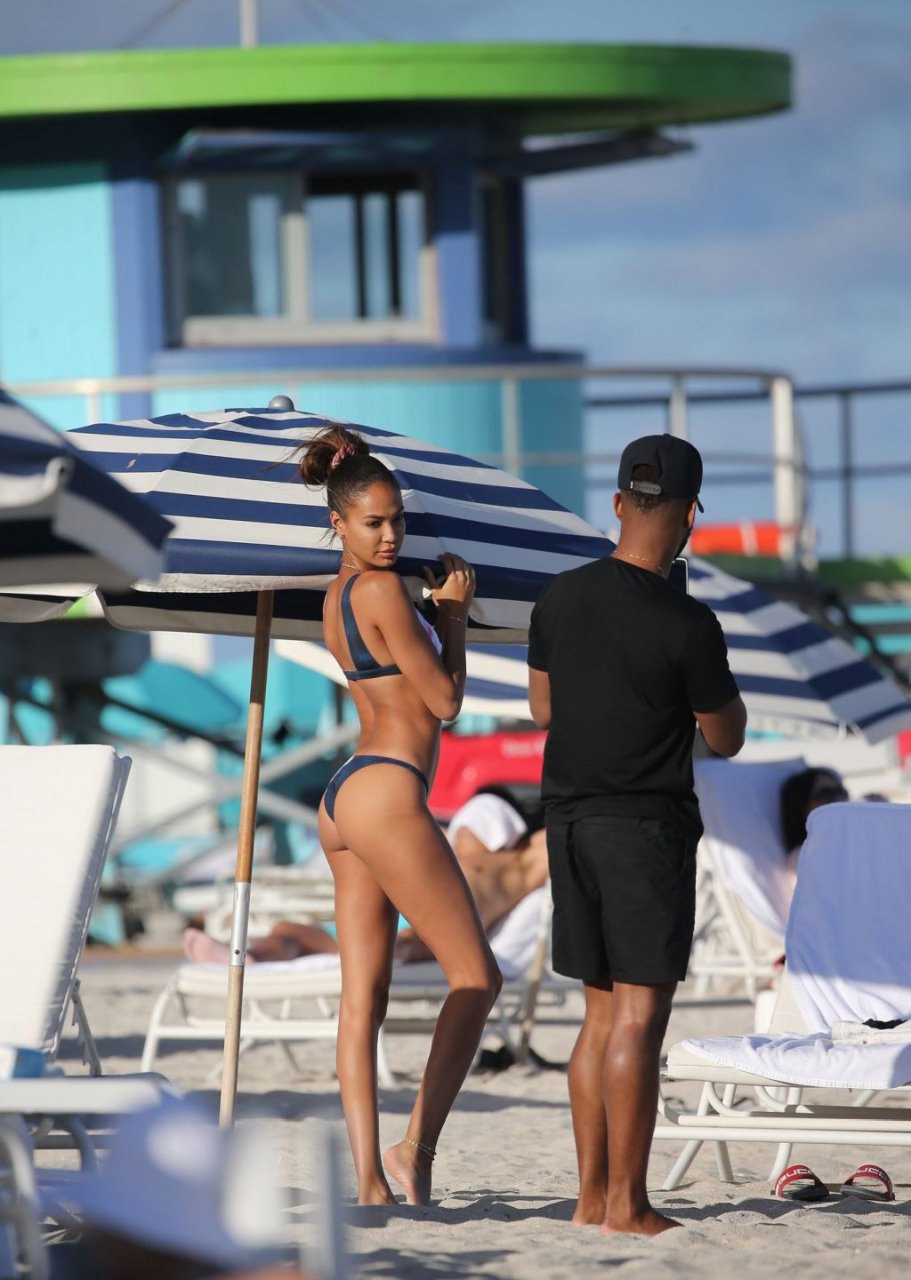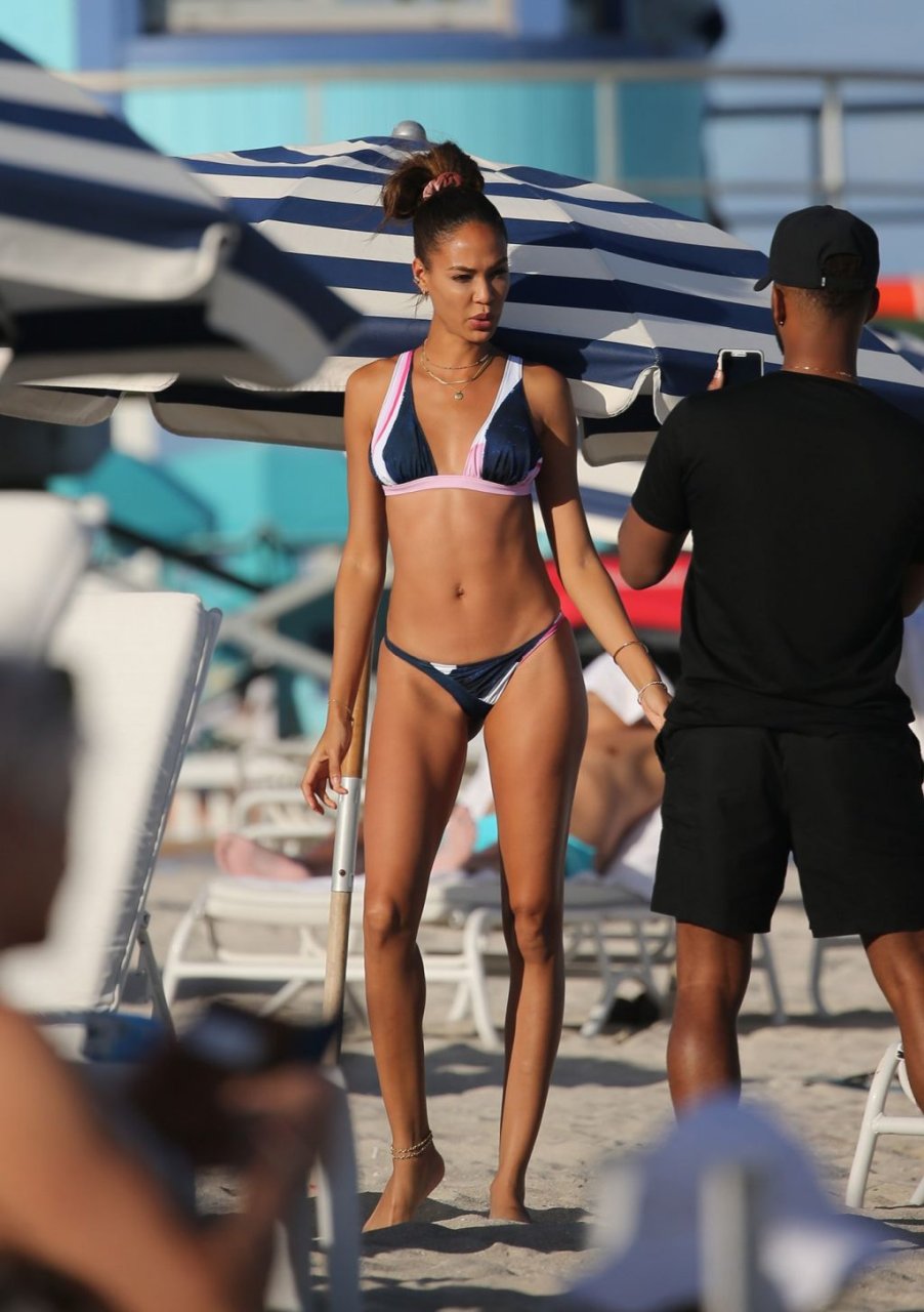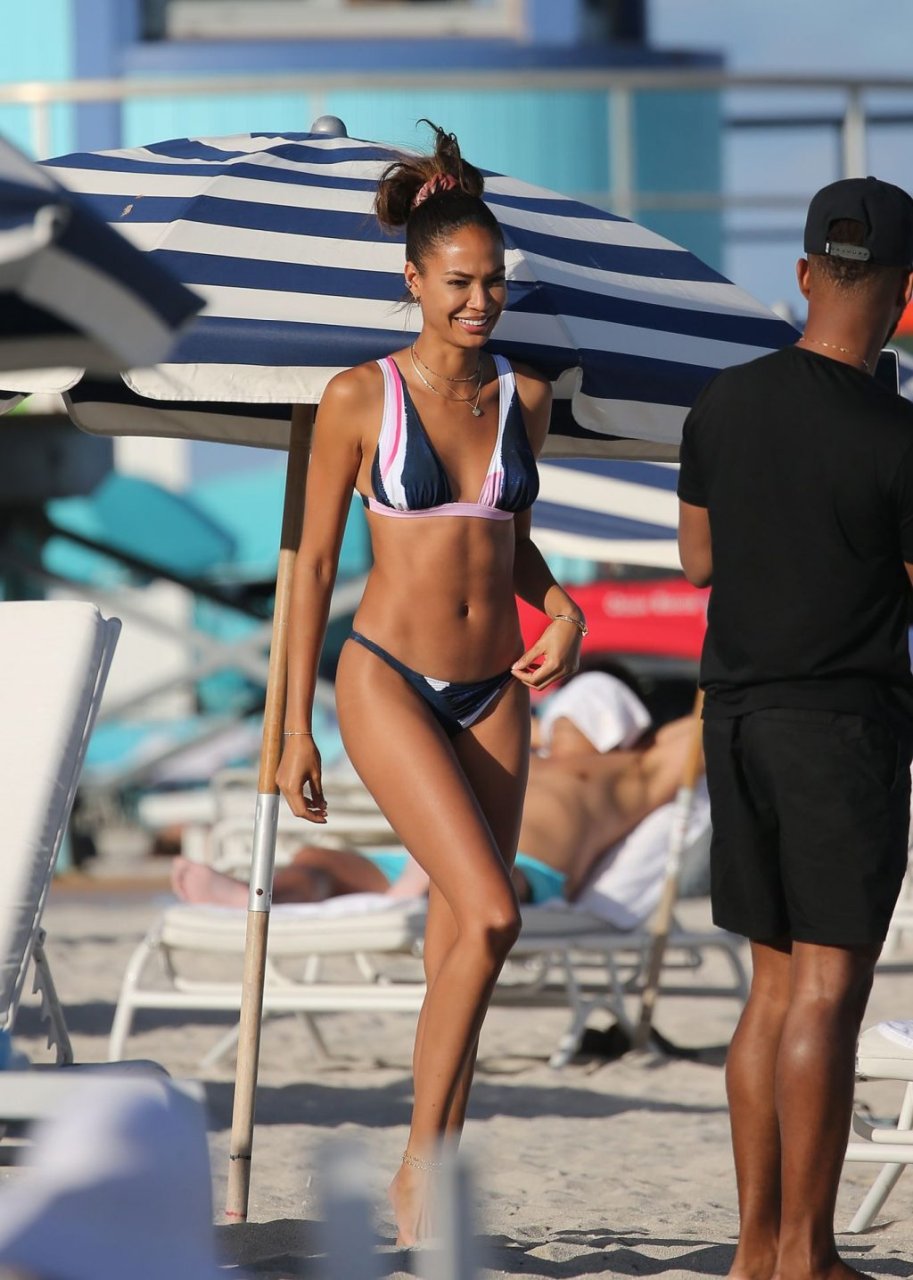 Model Joan Smalls recluta a su novio Bernard Smith como fotógrafo mientras posa seductoramente en bikini en la playa de Miami.