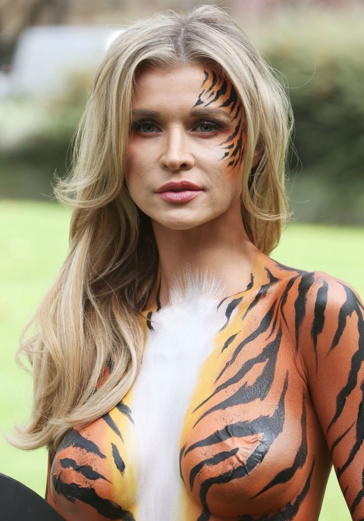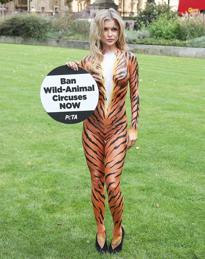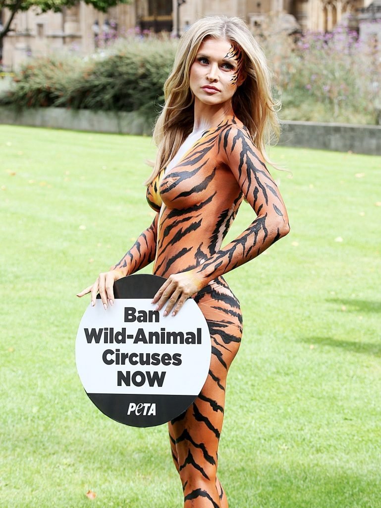 Pintada como un tigre, la supermodelo Joanna Krupa, 38, se une a PETA fuera de Westminster, Londres, 11/09/2017.
