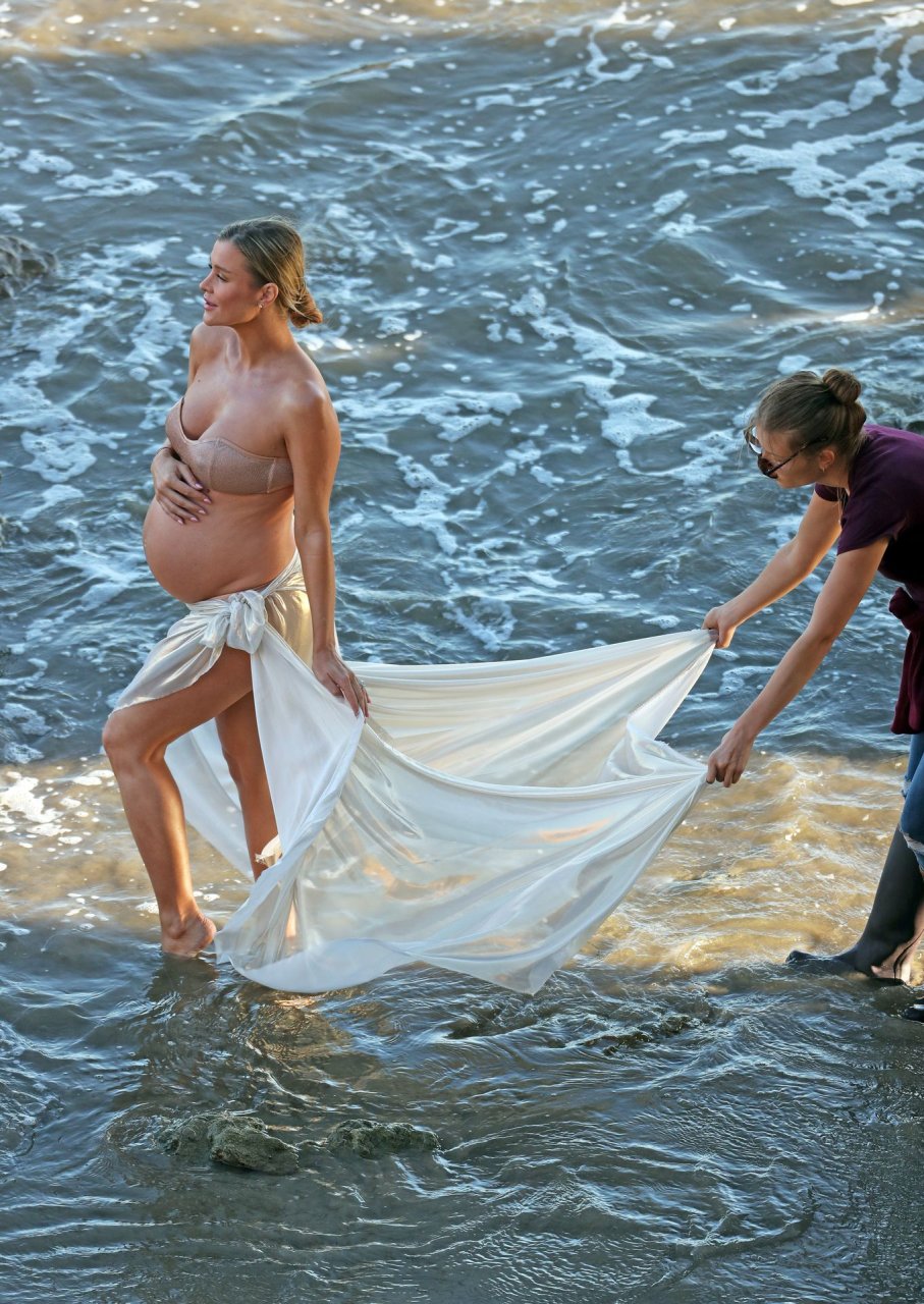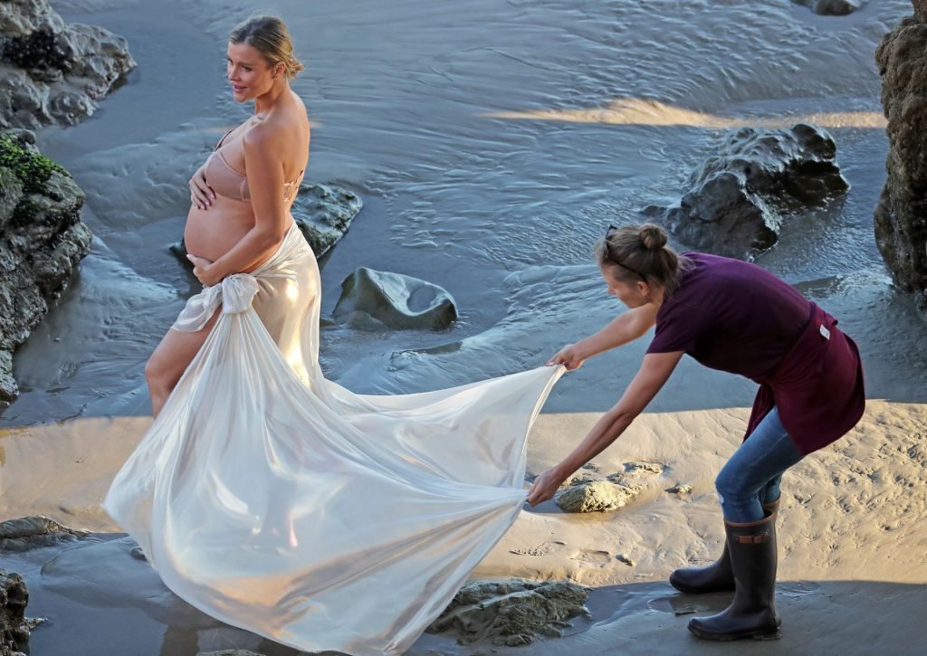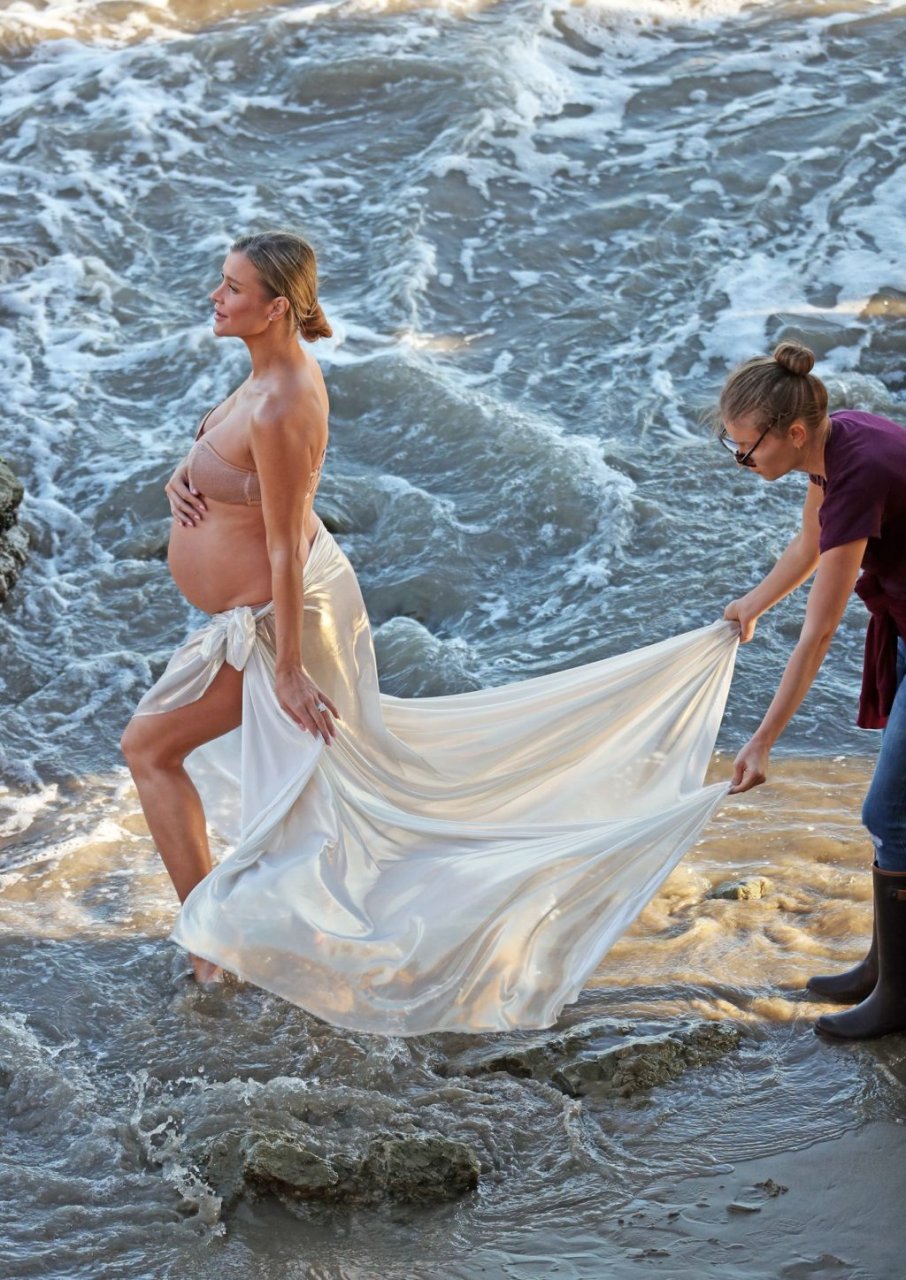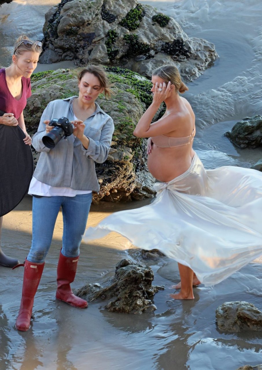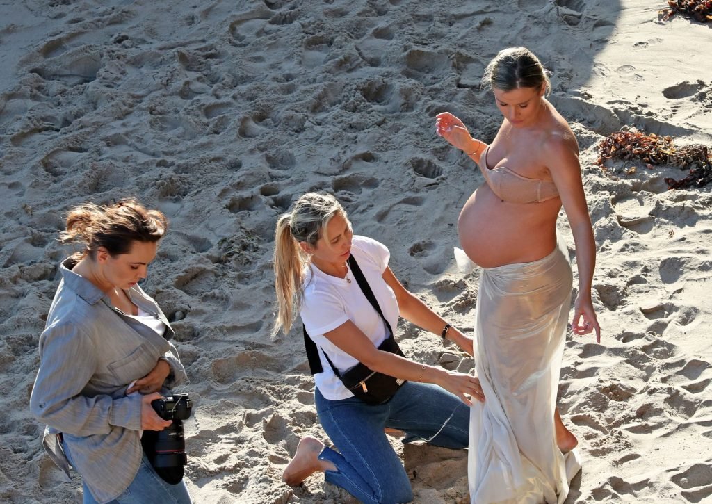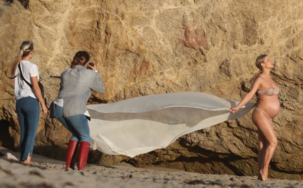 La presentadora de televisión nacida en Polonia, que espera a su primer hijo, una hija, con su nuevo esposo Doug Nunes, posó con un bikini sin tirantes color champán brillante y un envoltorio de seda para la icónica sesión en Malibu.