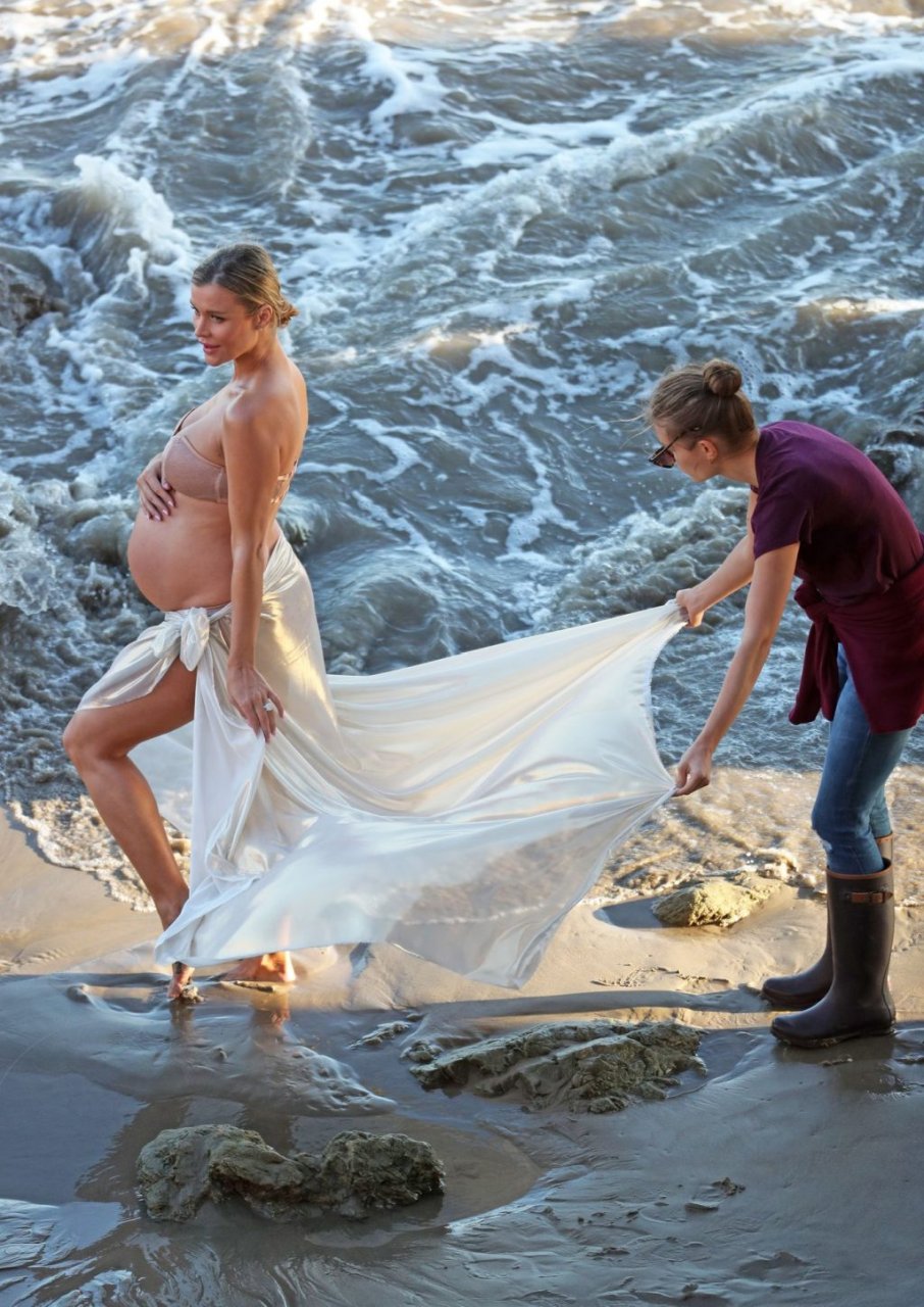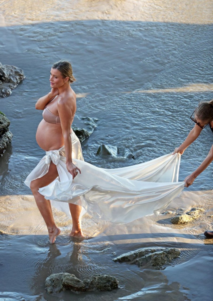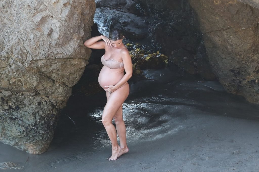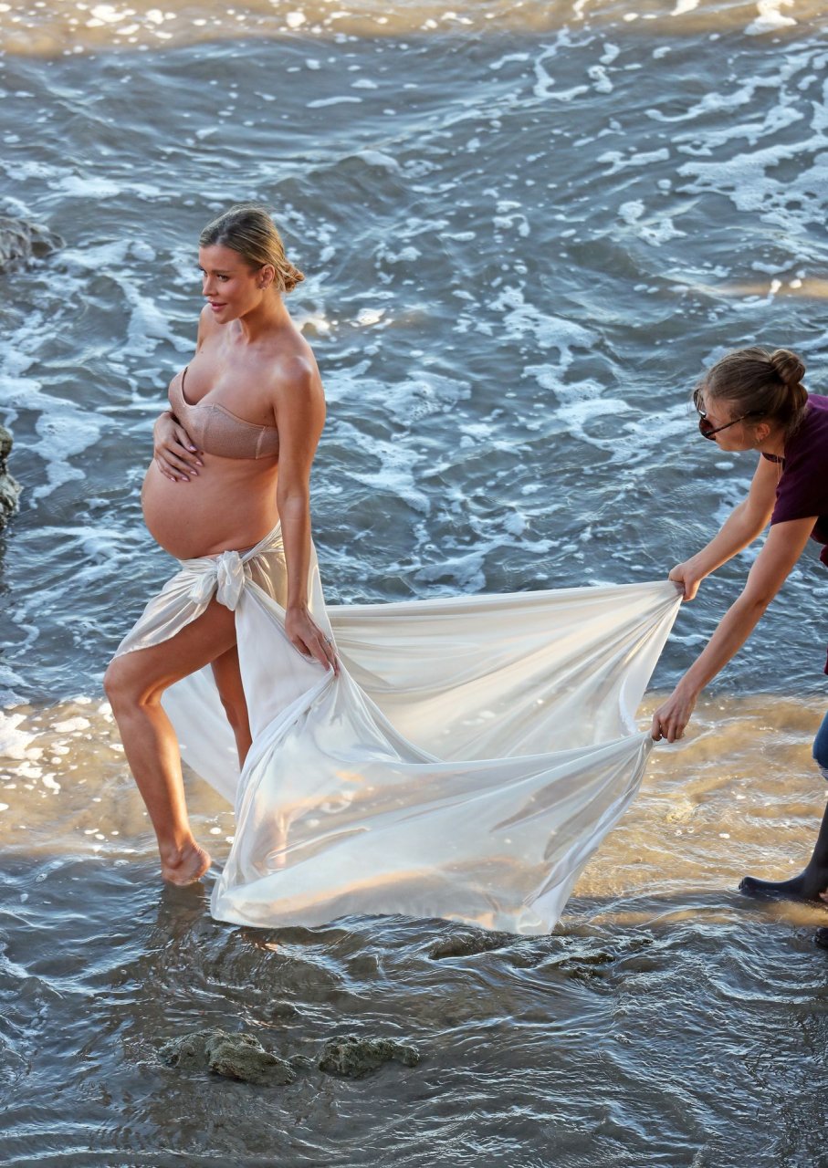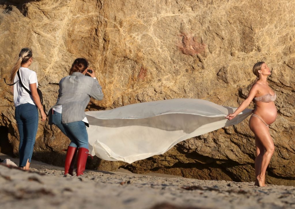 La presentadora de televisión nacida en Polonia, que espera a su primer hijo, una hija, con su nuevo esposo Doug Nunes, posó con un bikini sin tirantes color champán brillante y un envoltorio de seda para la icónica sesión en Malibu.