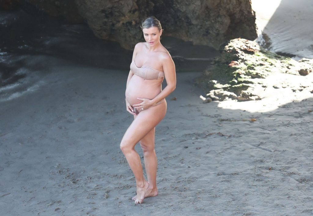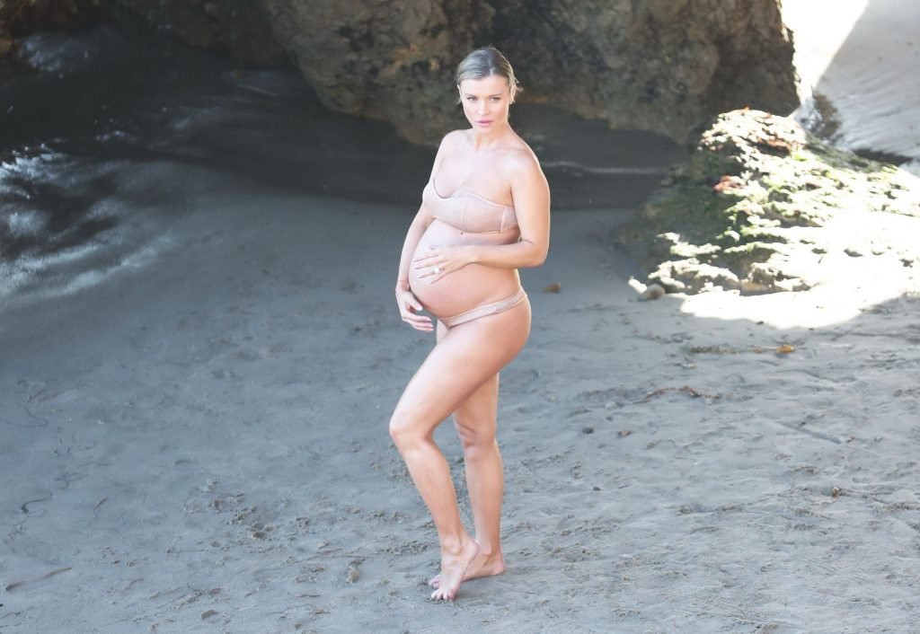 La supermodelo embarazada Joanna Krupa luce soñadora durante una sesión de fotos en la playa al atardecer mientras celebra su creciente barriga, 17/09/2019.