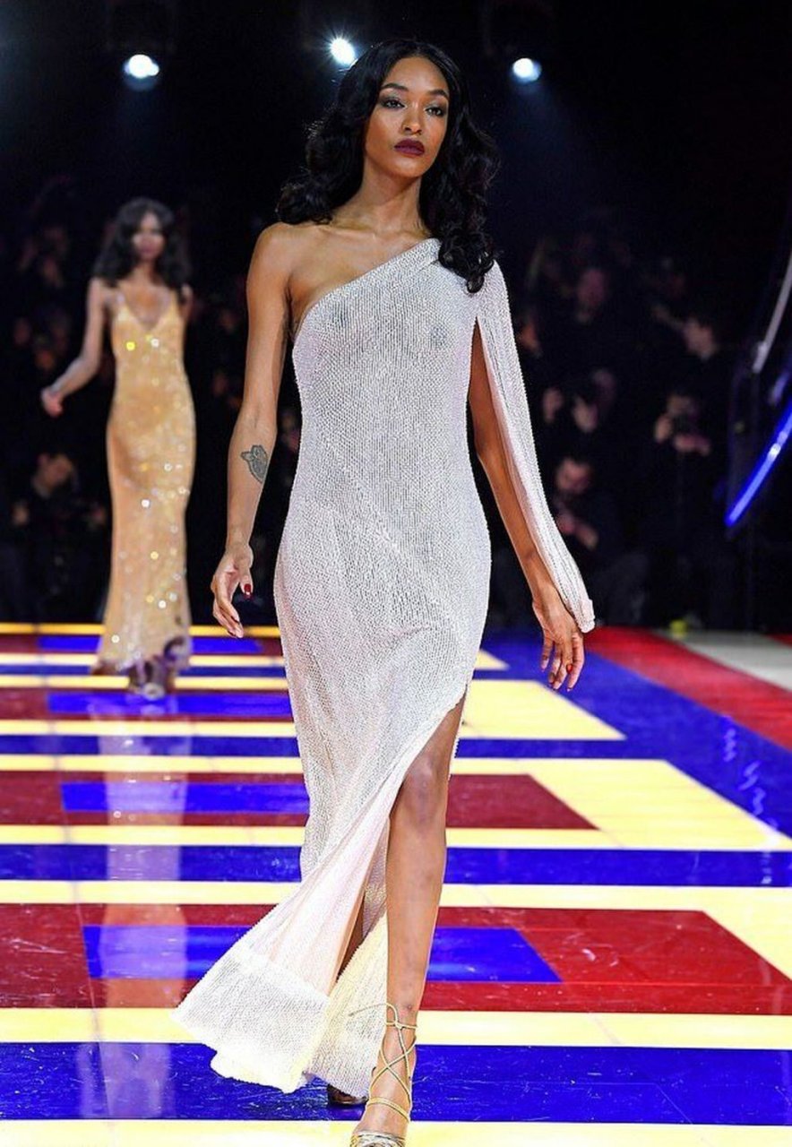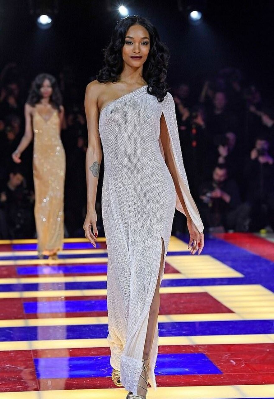 Model Jourdan Dunn camina por la pasarela con un vestido transparente en el desfile de moda Tommy X Zendaya Primavera/Verano 2019 durante la Semana de la Moda de París, 02/03/2019.