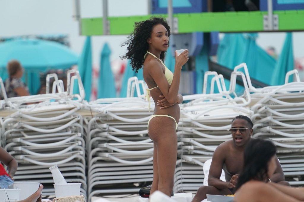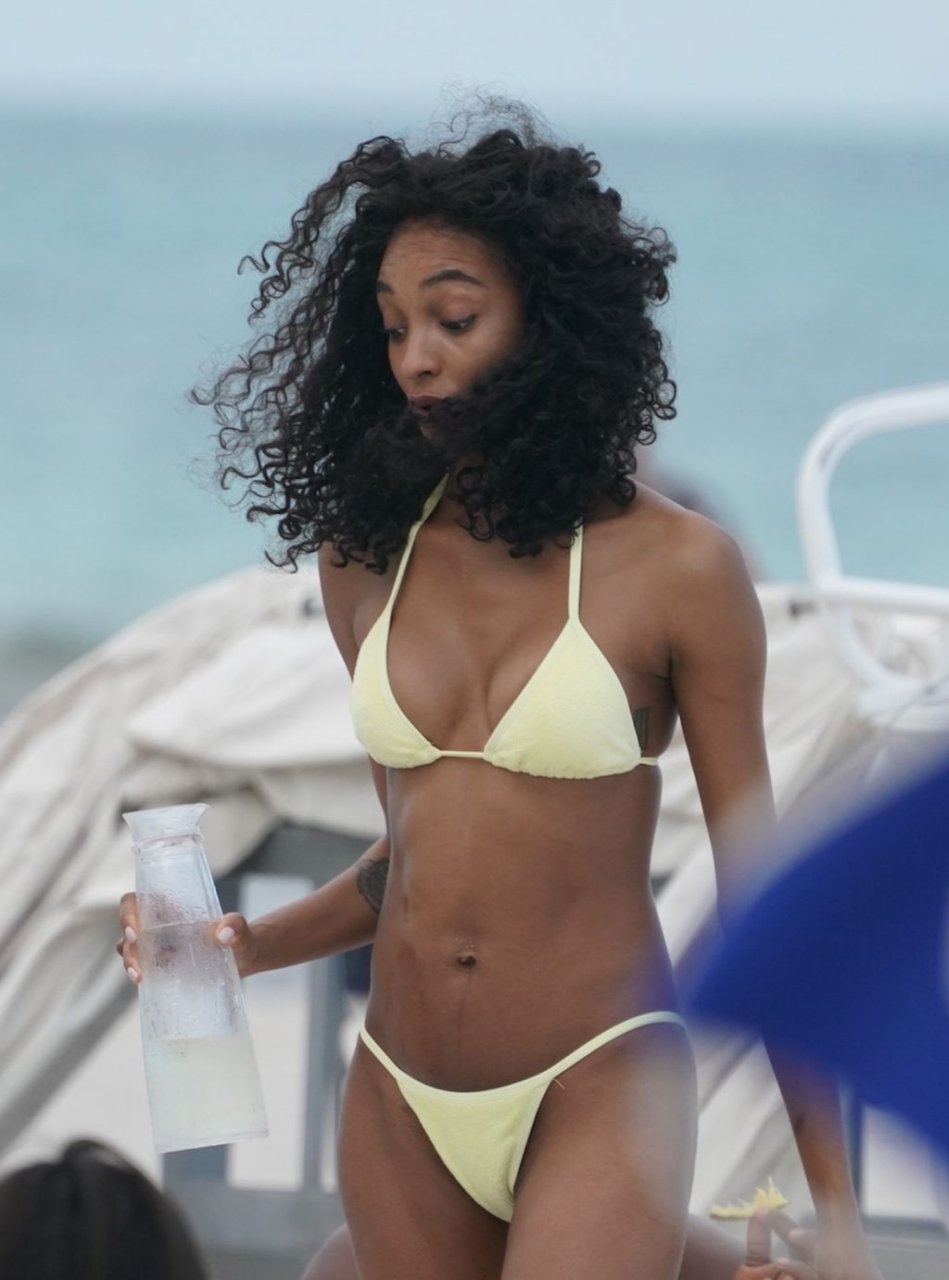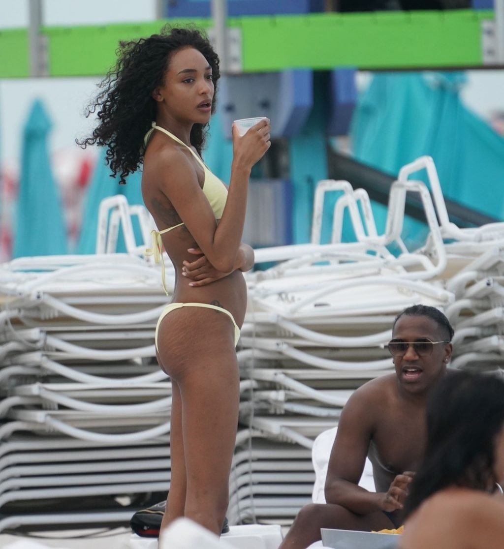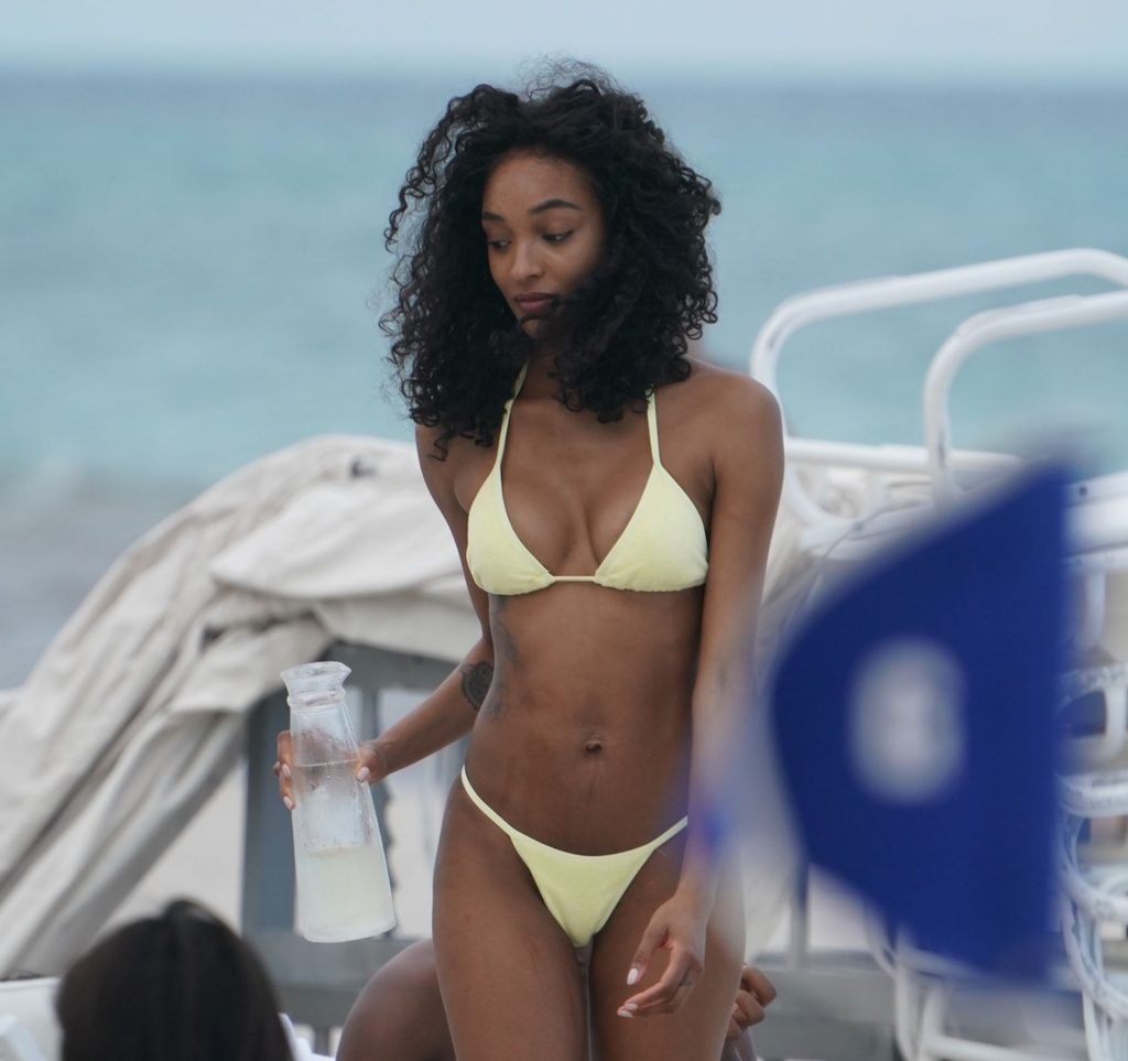 Model Jourdan Dunn fue vista en un bikini amarillo con amigos en la playa de Miami Beach, 12/05/2019.