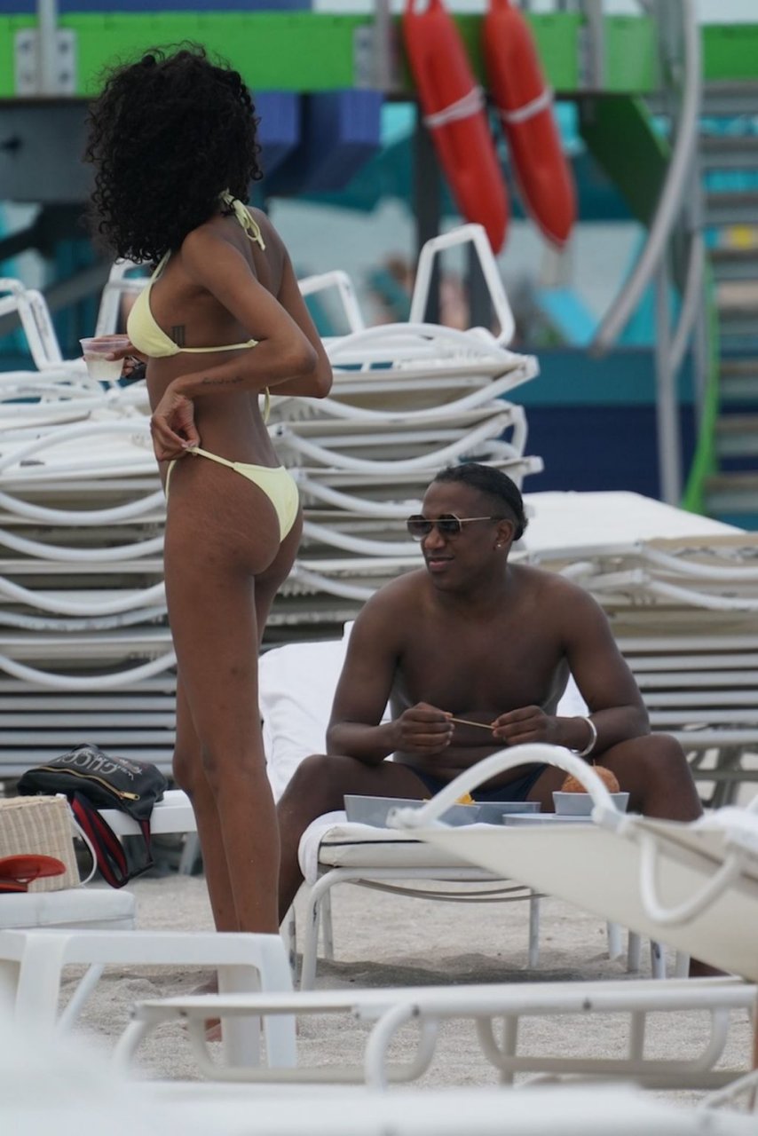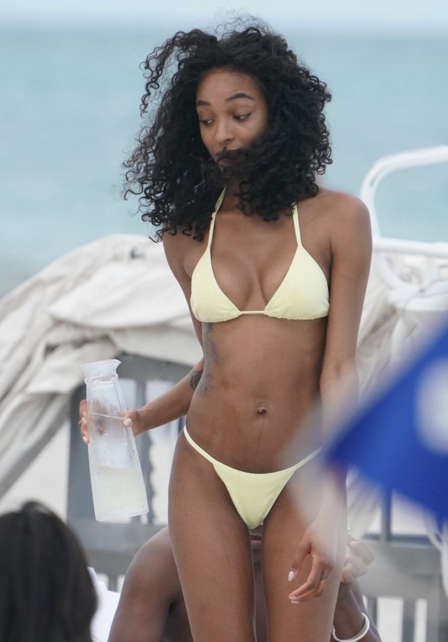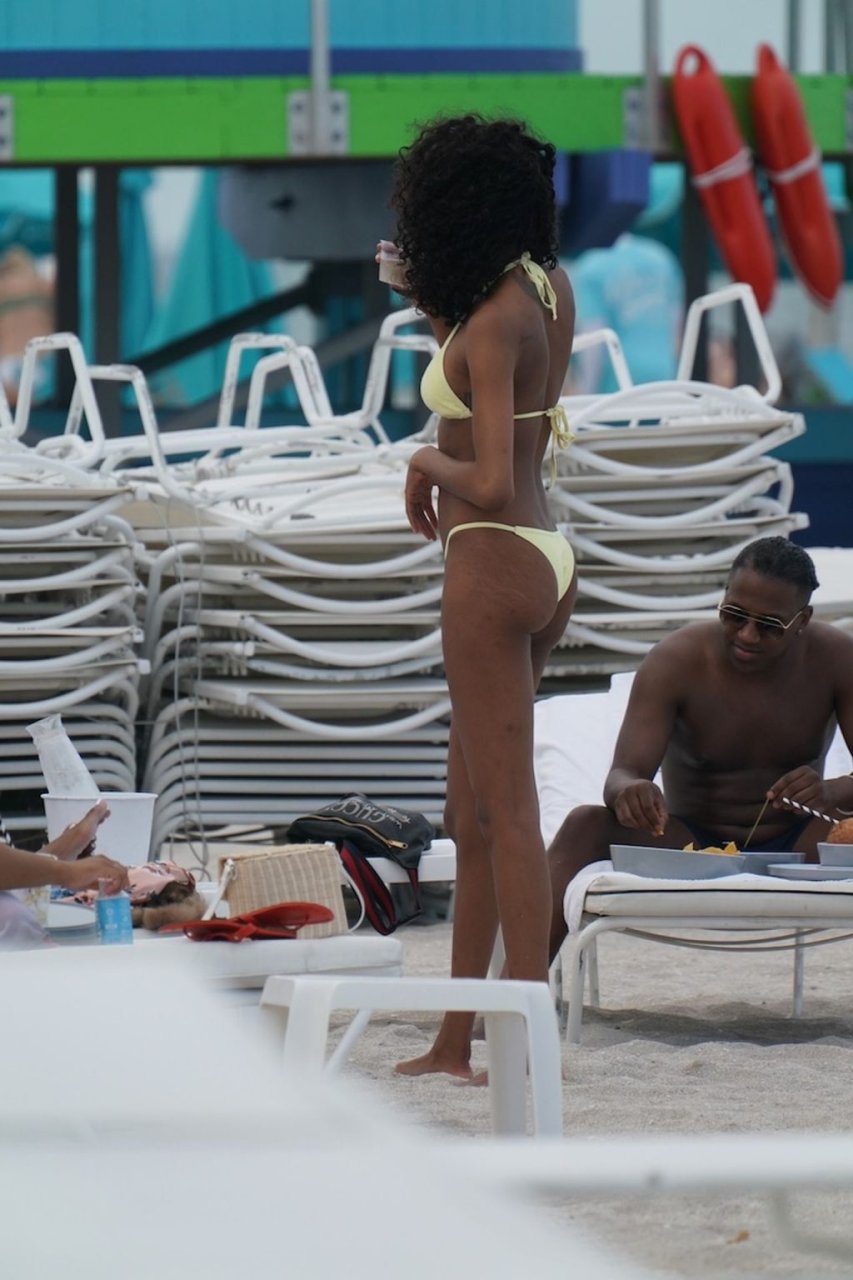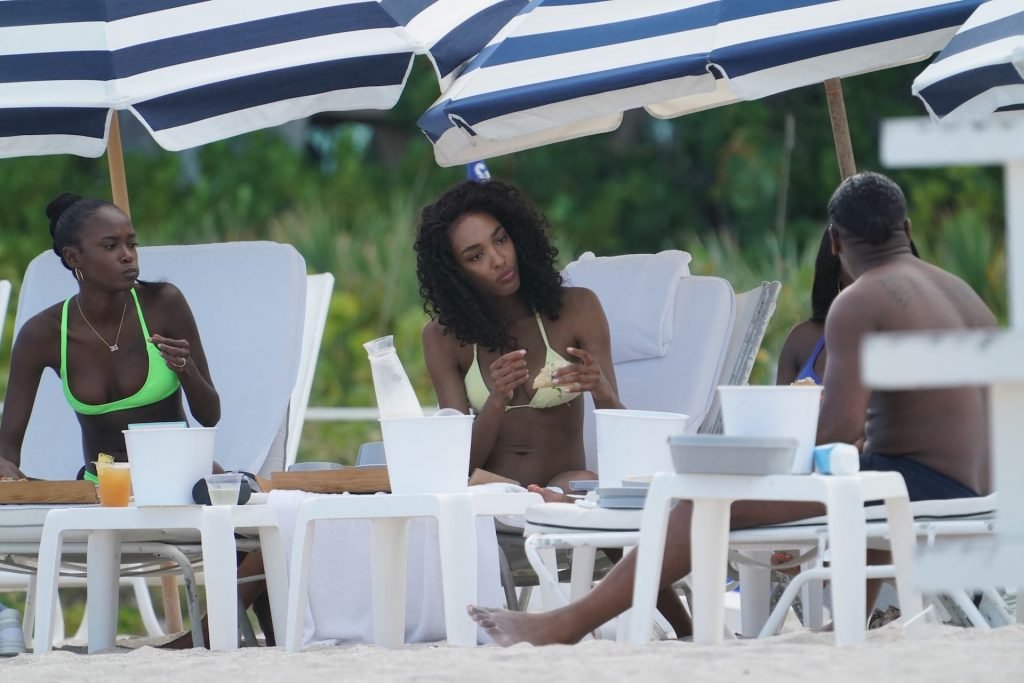 Model Jourdan Dunn fue vista en un bikini amarillo con amigos en la playa de Miami Beach, 12/05/2019.