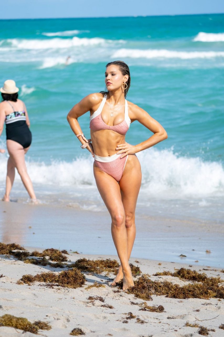 Joy Corrigan disfruta de un día soleado en la playa de Miami, 12/08/2018. La hermosa modelo americana de 23 años mostró su cuerpo bronceado con un bikini blanco-rosado.