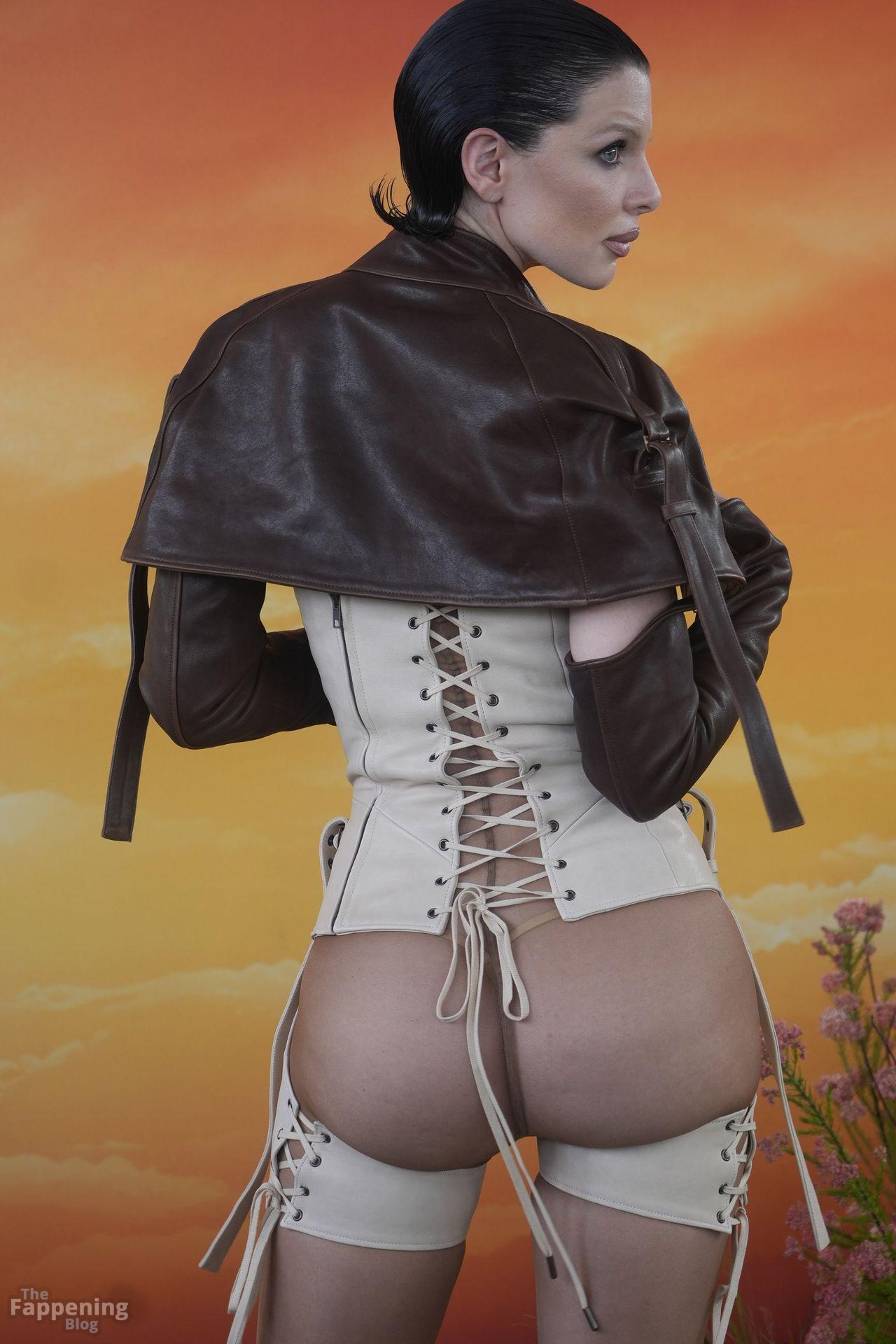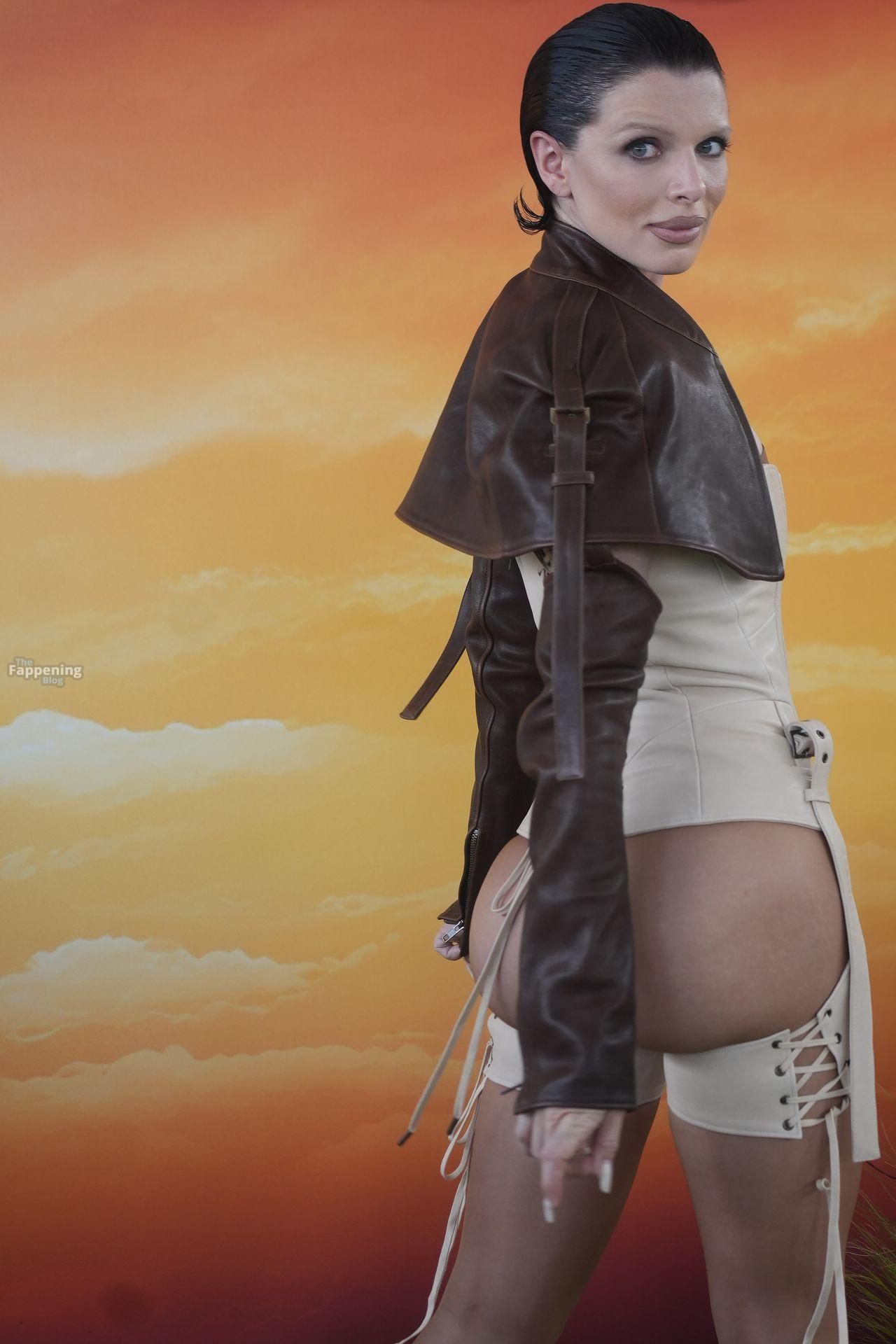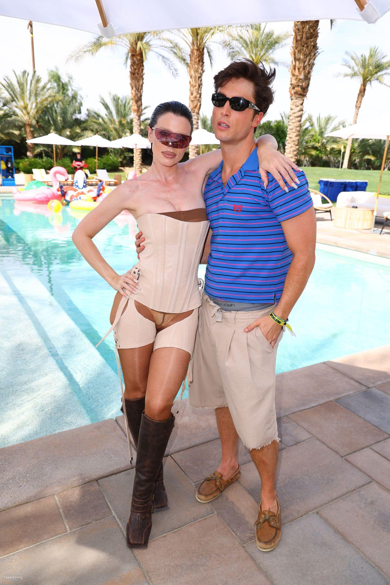 Julia Fox estuvo en el Revolve Festival Desert Mirage Experience en Thermal, California, durante el fin de semana de Coachella, luciendo un bustier diminuto, medias, una chaqueta corta de cuero y guantes largos.