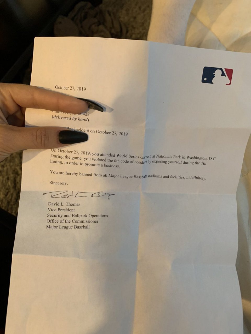 Modelos Julia Rose y Lauren Summer prohibidas en la MLB por mostrar los pechos en el Nationals Park en Washington, D. C. (octubre de 2019).