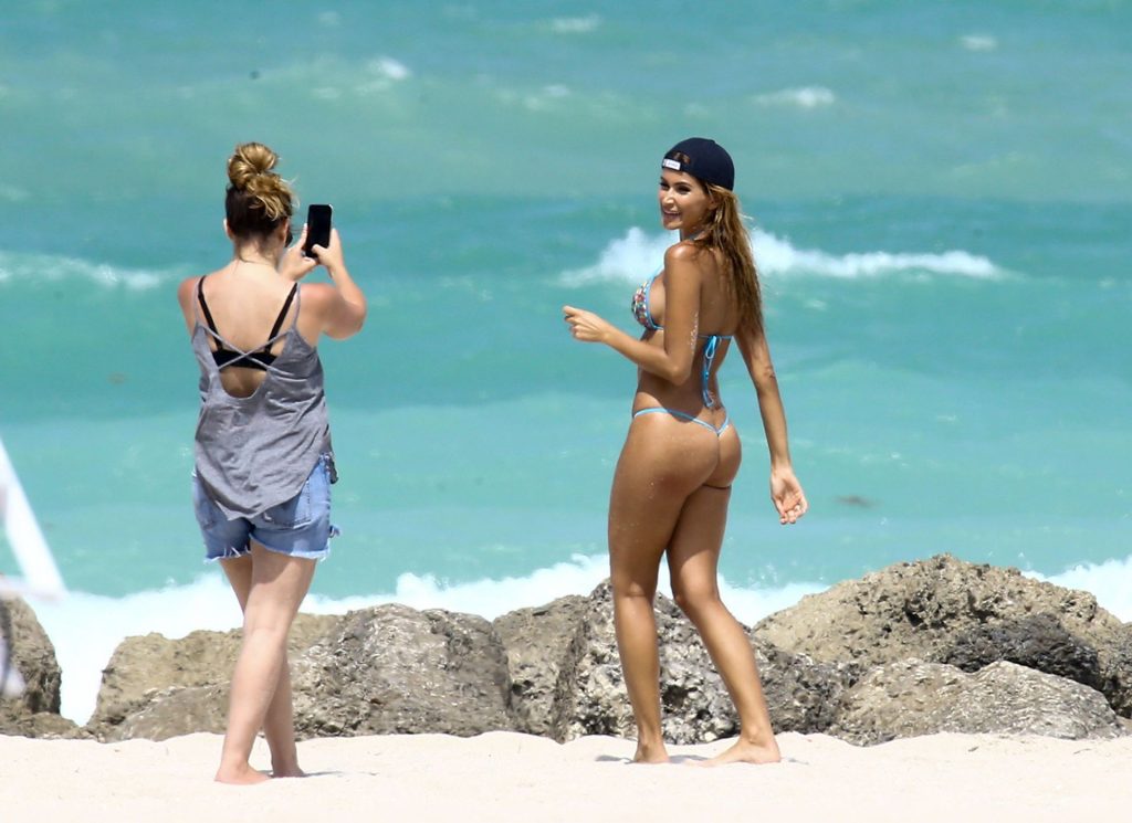 Modelo colombo-estadounidense Juliana Proven (Provenzano) muestra su impresionante cuerpo durante una sesión de fotos en bikini en la playa de Malibu, 20/06/2016.