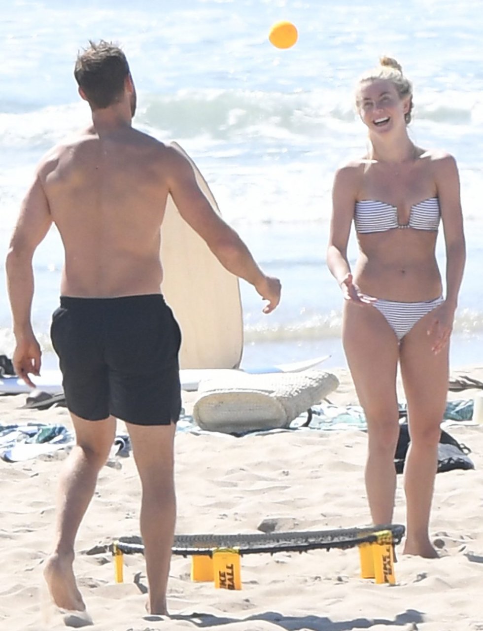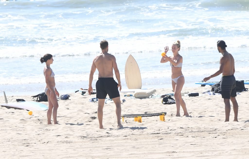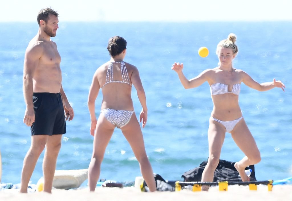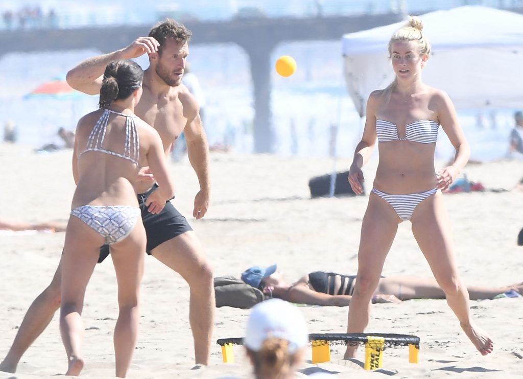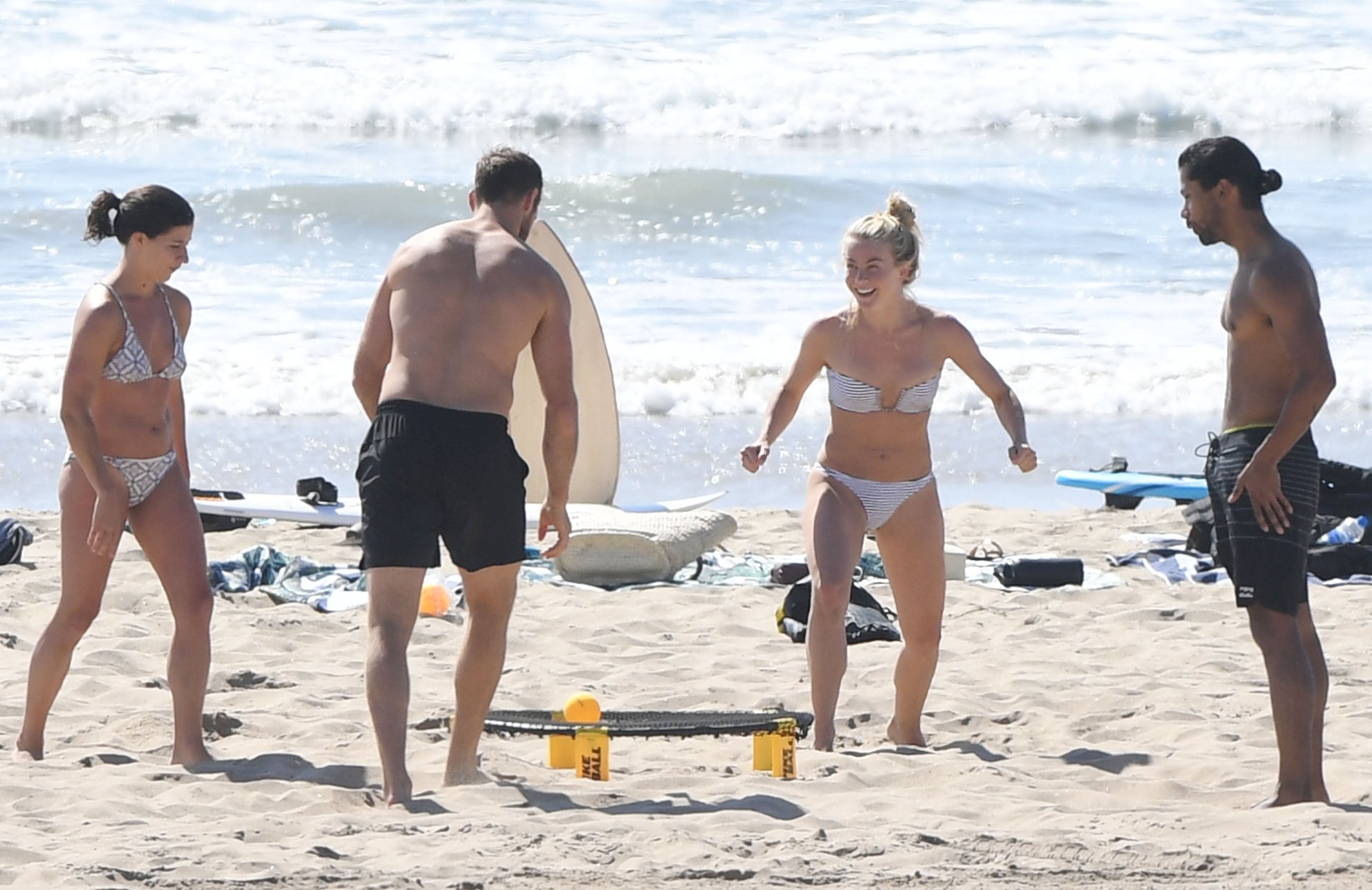 Bailarina/cantante/actriz Julianne Hough (30) y su esposo juegan Spike Ball con amigos en la playa de Newport Beach, California, 23/09/2018. Brooks y Julianne se unieron a dos amigos para un día deportivo en la playa donde los cuatro surfeaban y jugaban juntos un juego de playa llamado Spike Ball.