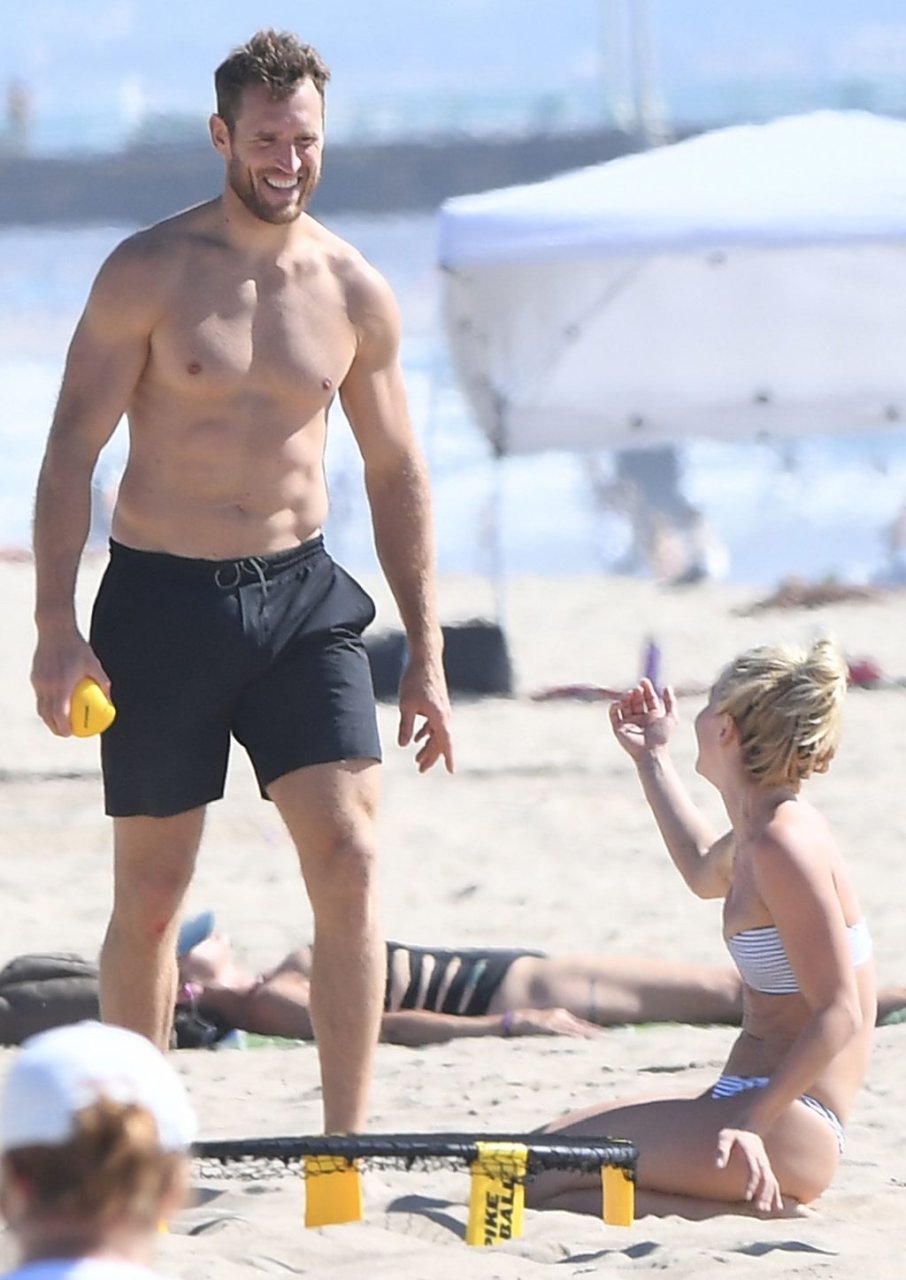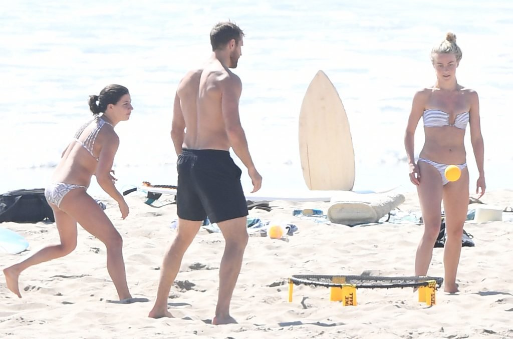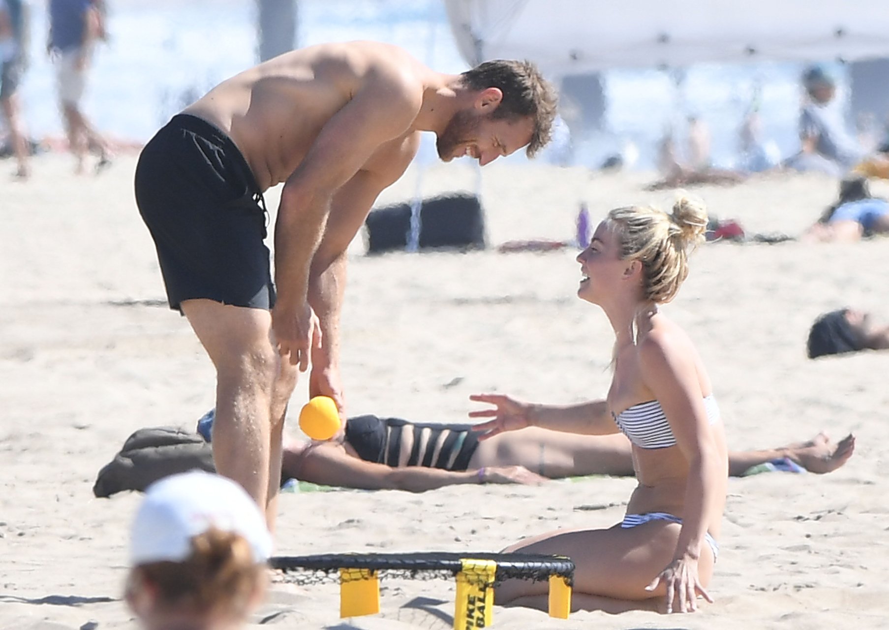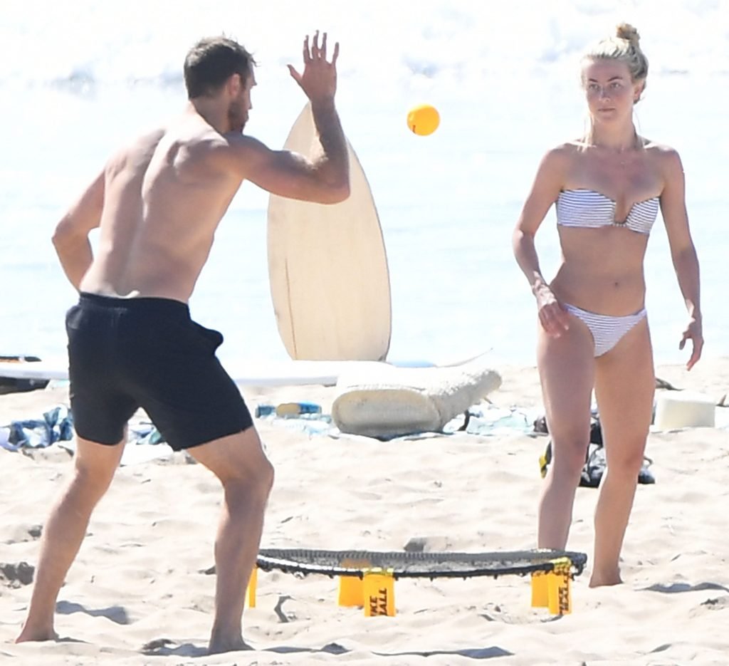 Bailarina/cantante/actriz Julianne Hough (30) y su esposo juegan Spike Ball con amigos en la playa de Newport Beach, California, 23/09/2018. Brooks y Julianne se unieron a dos amigos para un día deportivo en la playa donde los cuatro surfeaban y jugaban juntos un juego de playa llamado Spike Ball.