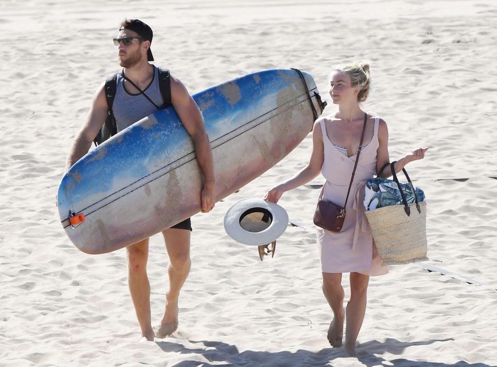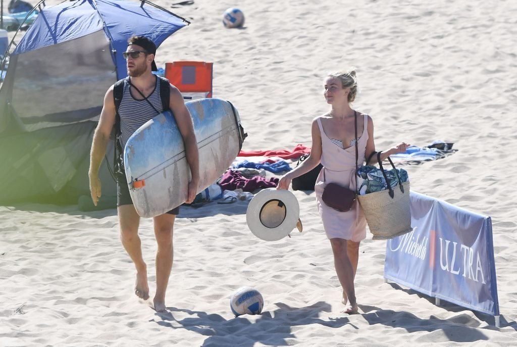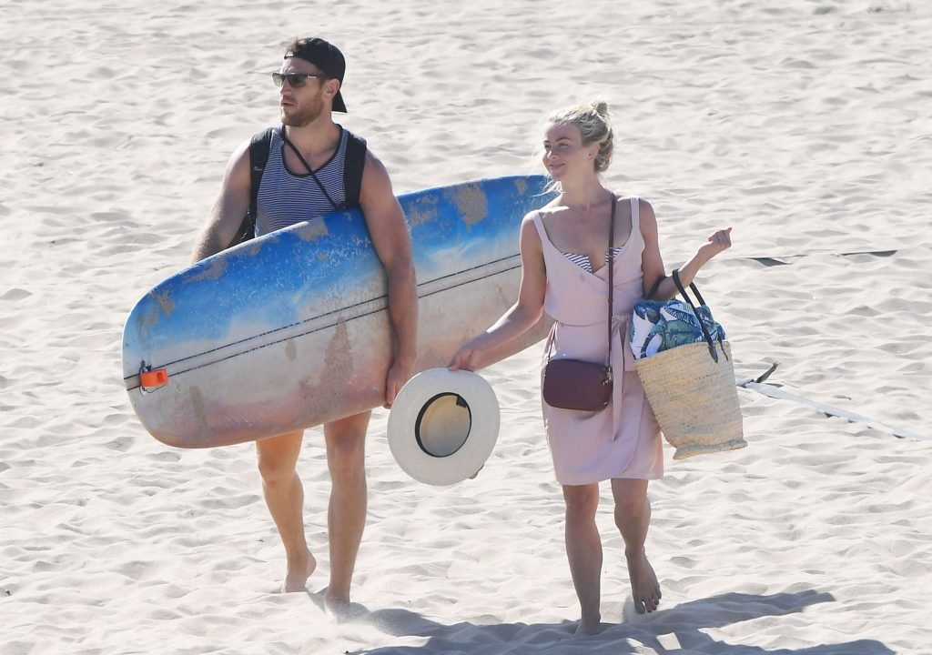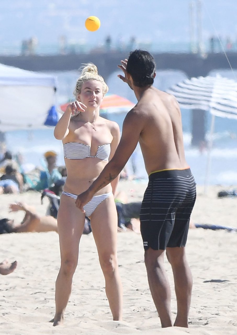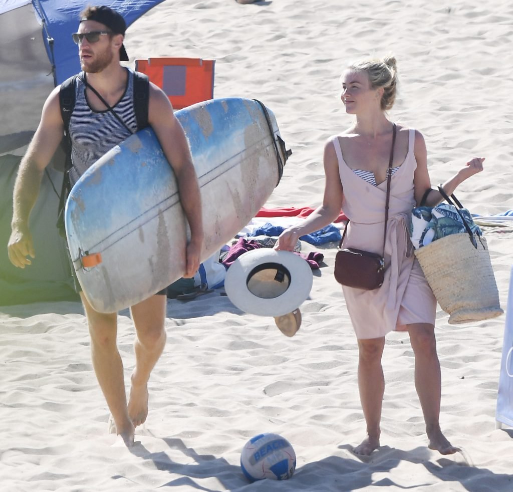 Bailarina/cantante/actriz Julianne Hough (30) y su esposo juegan Spike Ball con amigos en la playa de Newport Beach, California, 23/09/2018. Brooks y Julianne se unieron a dos amigos para un día deportivo en la playa donde los cuatro surfeaban y jugaban juntos un juego de playa llamado Spike Ball.
