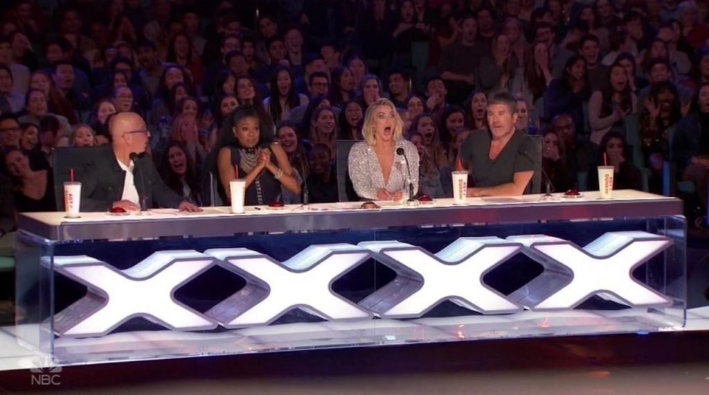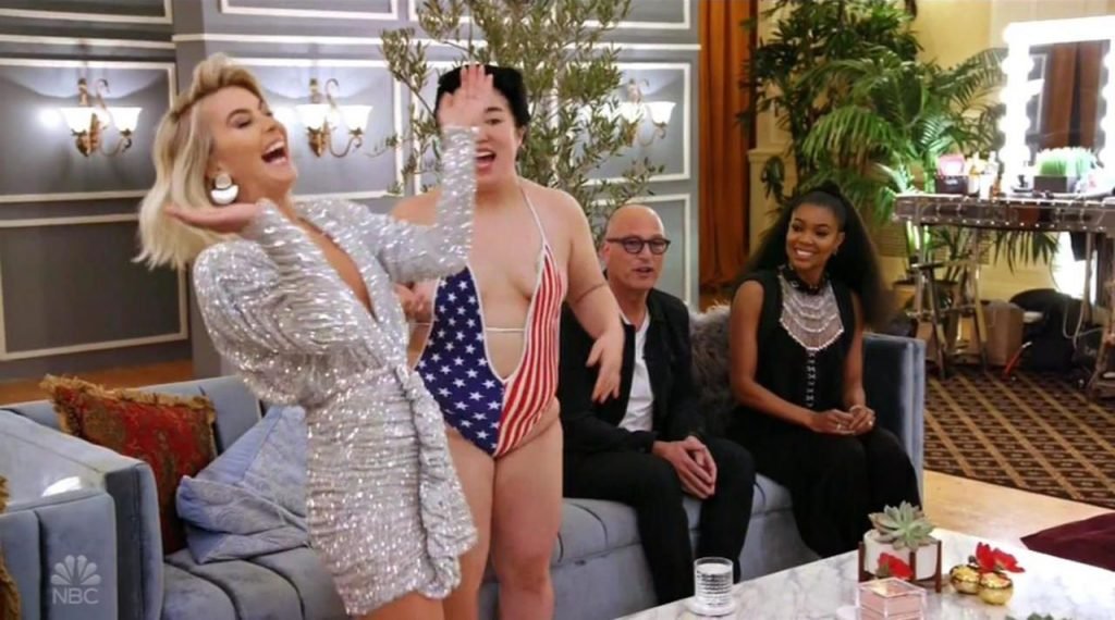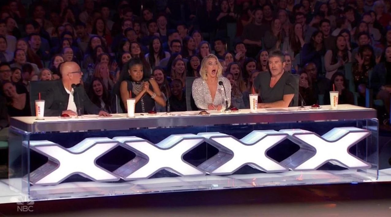 Yuriyan Retriever dejó a los jueces – Hough, Cowell, Gabrielle Union, Howie Mandel – y al público atónitos cuando salió al escenario – y luego se quitó su gruesa sudadera con capucha y reveló su traje de baño de una pieza con la bandera americana muy escaso.