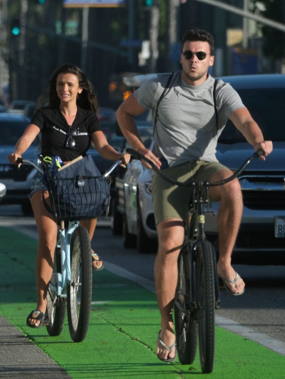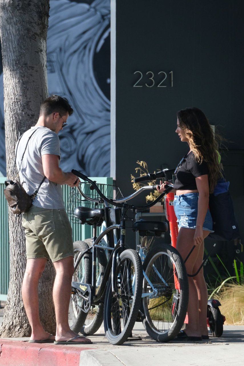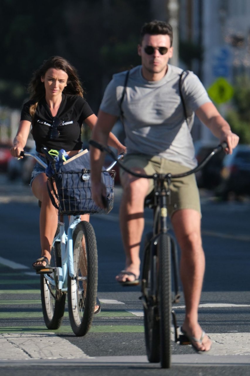 “La estrella de “Love Island” Kady McDermott lleva un par de cortos shorts de mezclilla mientras comparte un beso con su novio Myles Barnett durante un romántico paseo en bicicleta en Venice Beach, 18/09/2019.