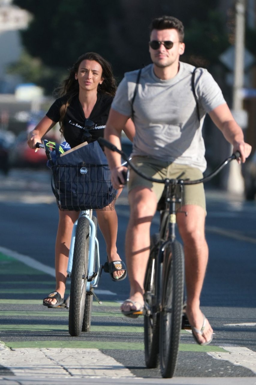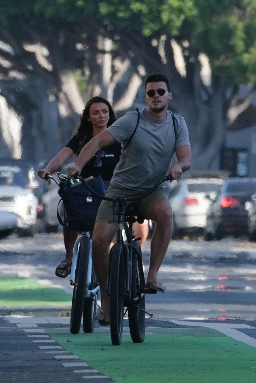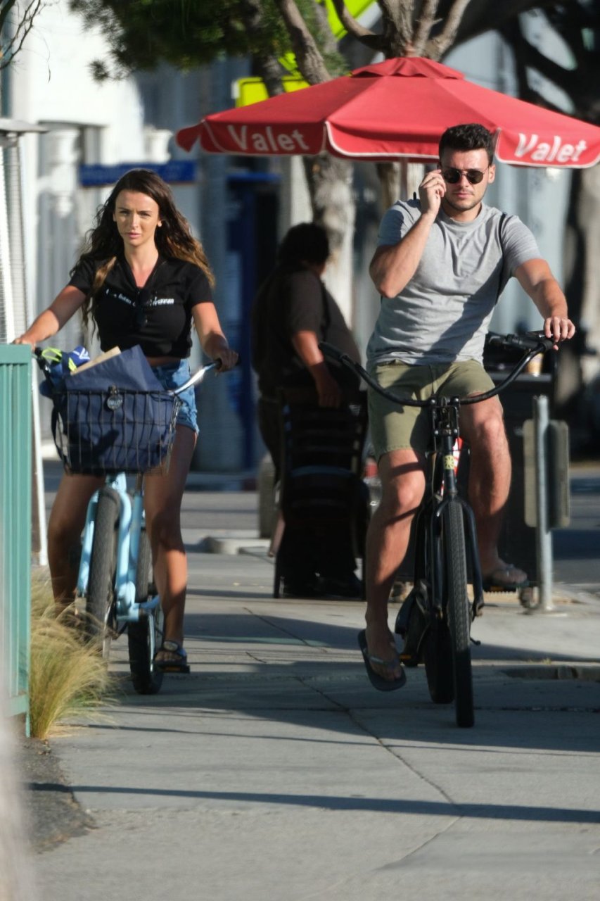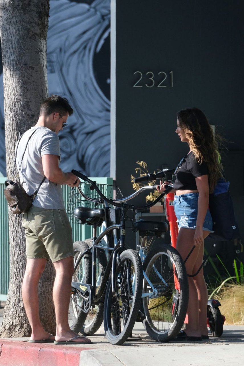 “La estrella de “Love Island” Kady McDermott lleva un par de cortos shorts de mezclilla mientras comparte un beso con su novio Myles Barnett durante un romántico paseo en bicicleta en Venice Beach, 18/09/2019.