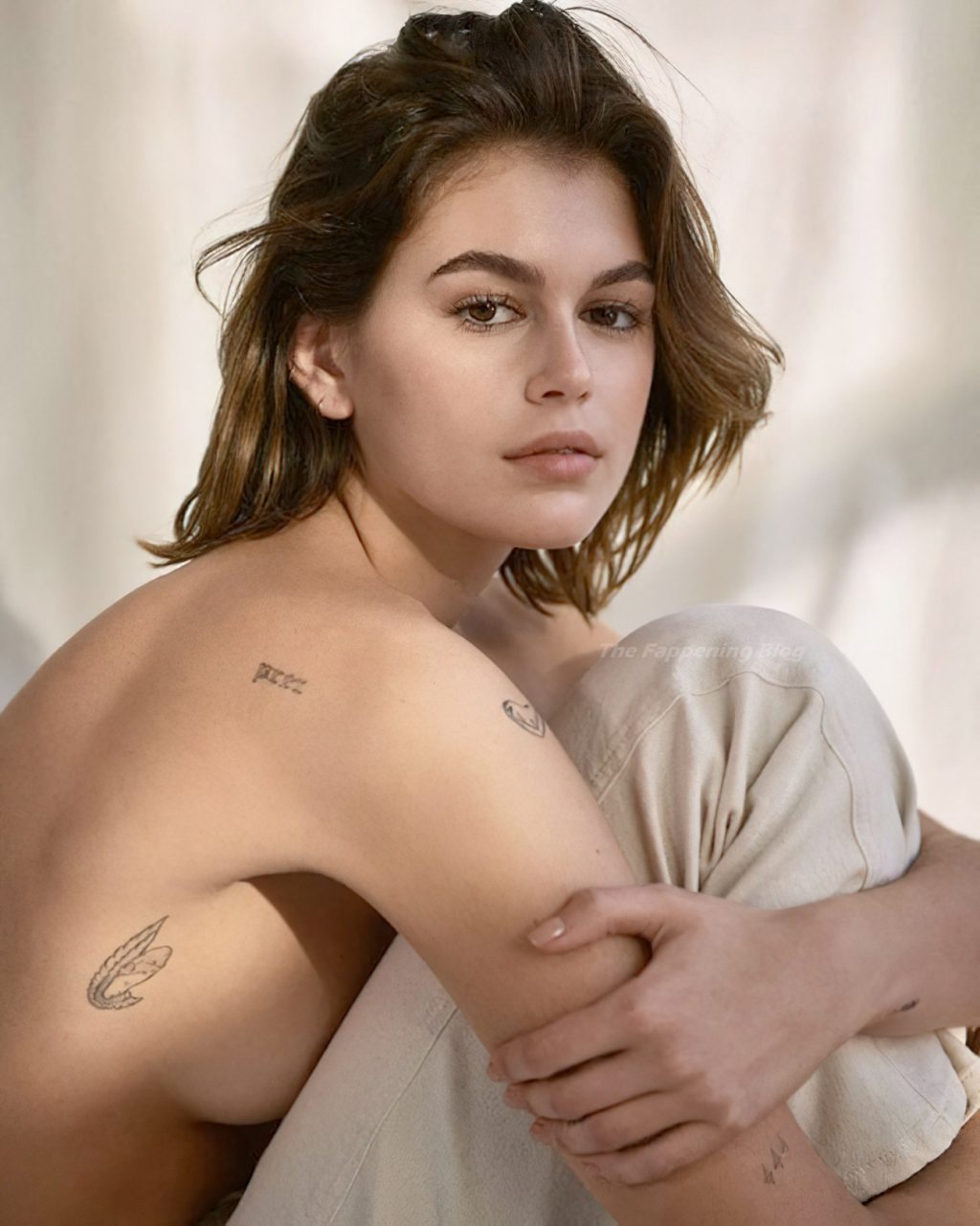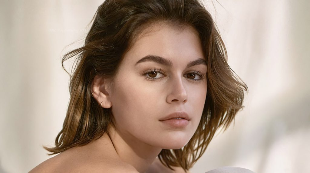 El estilo minimalista presenta a Kaia con su cabello corto en ondas despeinadas y maquillaje de aspecto natural. McGinley utiliza la luz y la sombra en las imágenes oníricas. Kaia muestra una selección que incluye shorts de jean, denim ajustado y bralettes para la sesión.