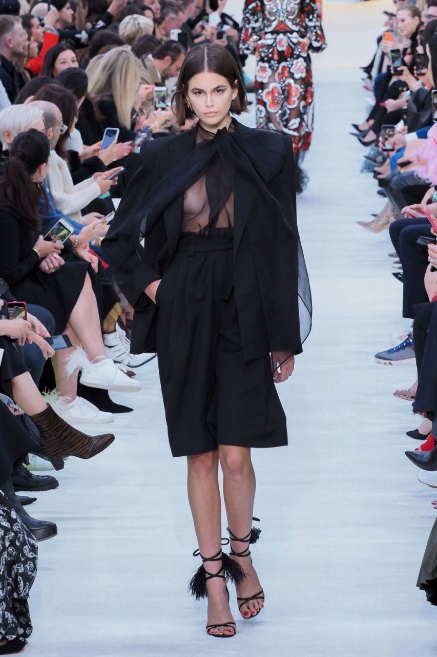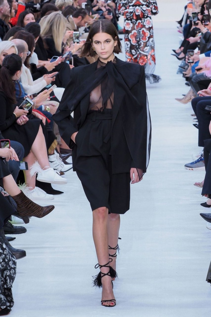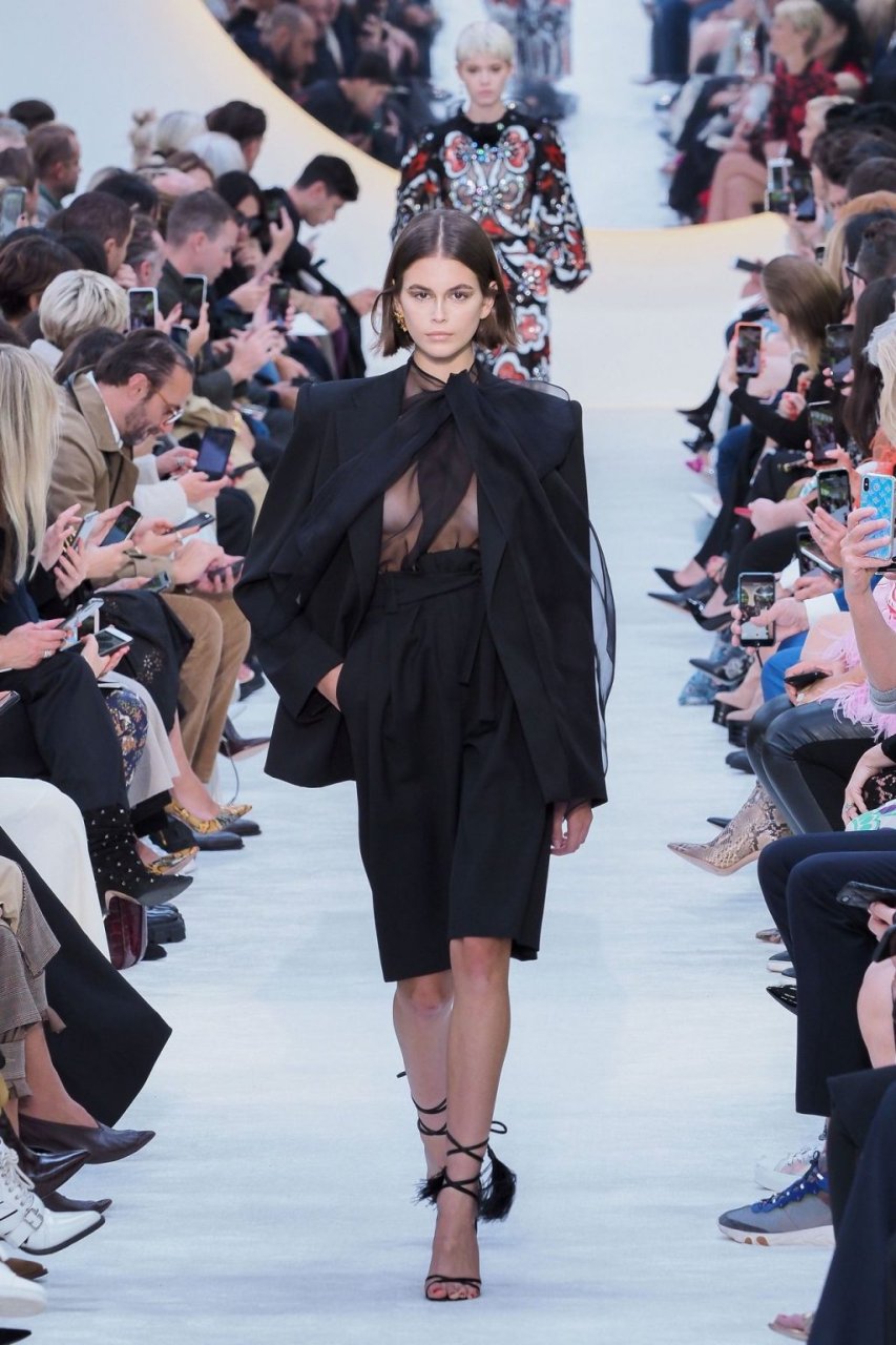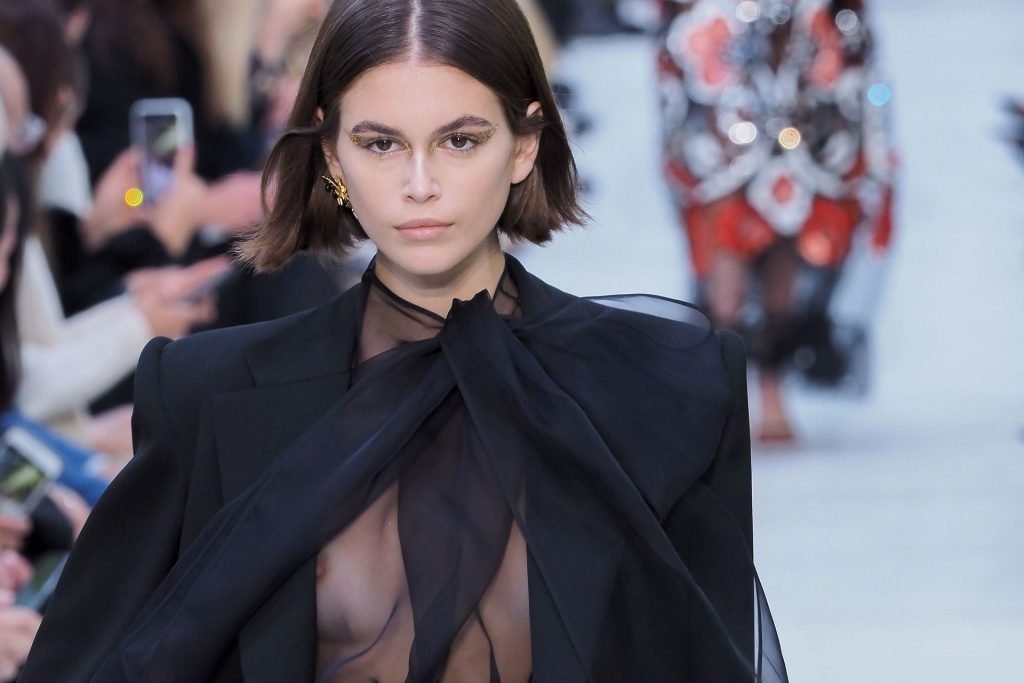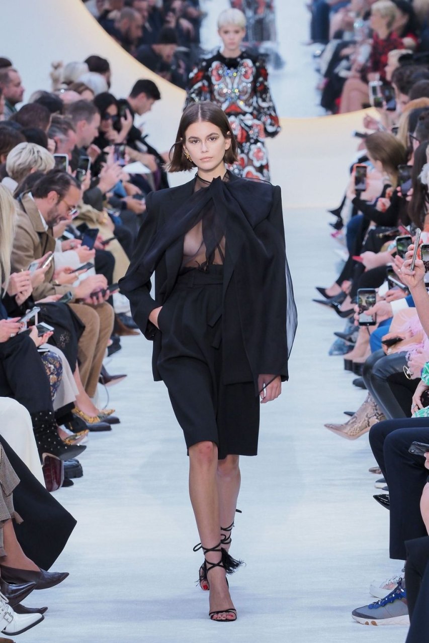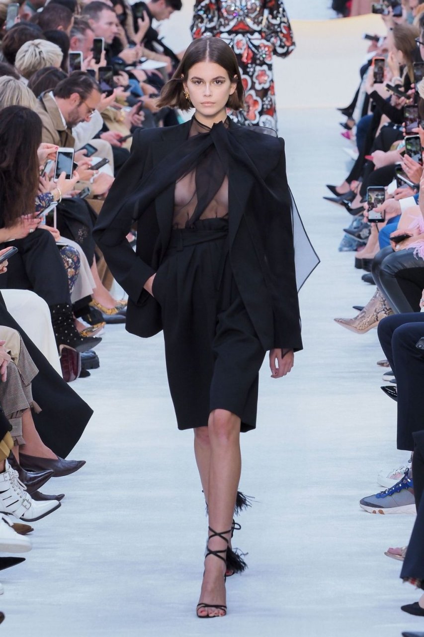 Model Kaia Gerber (18) desfila con una blusa transparente en el desfile de moda Valentino Primavera/Verano 2020 en París, 29/09/2019.