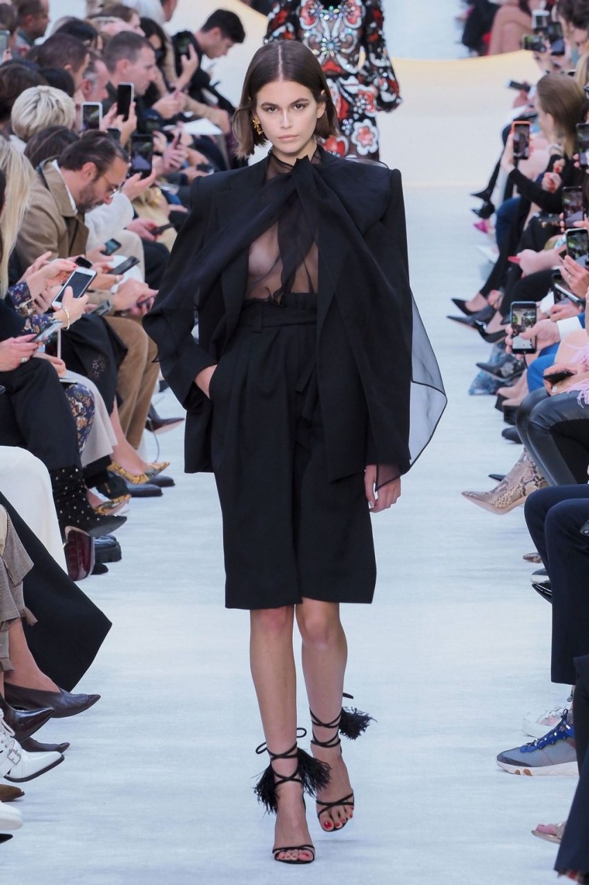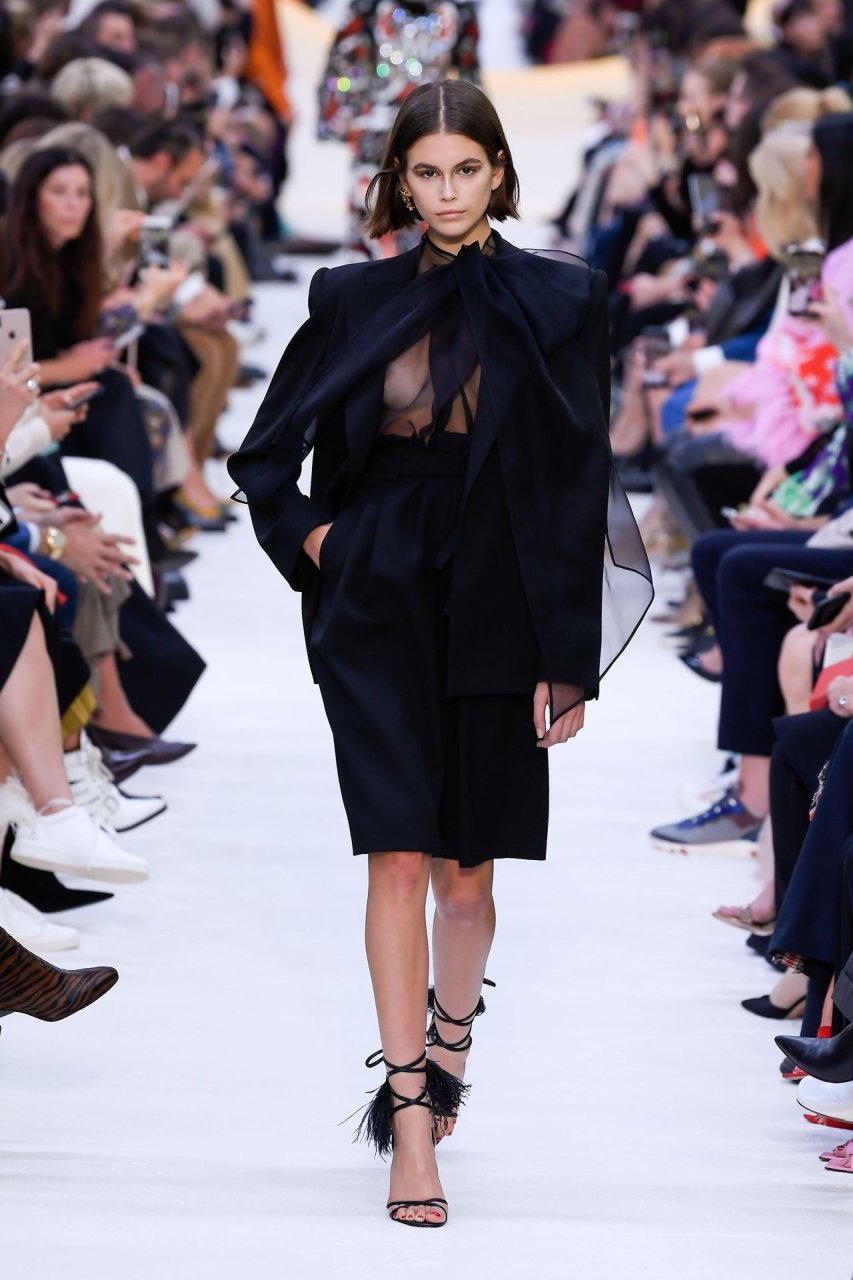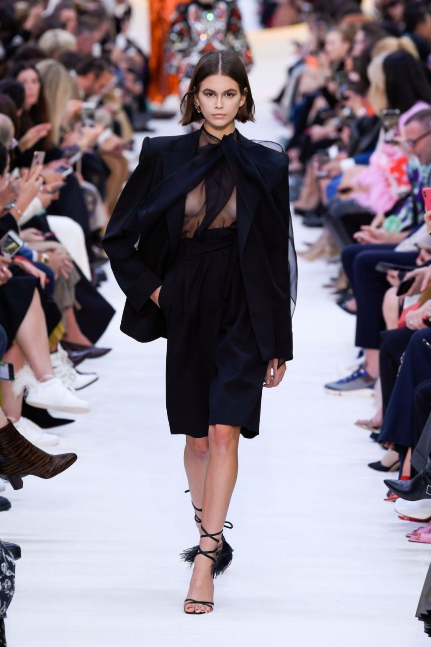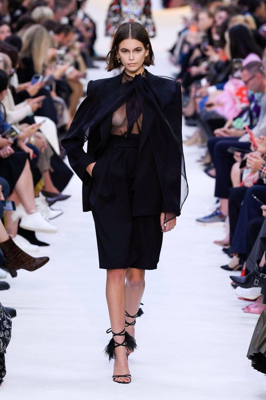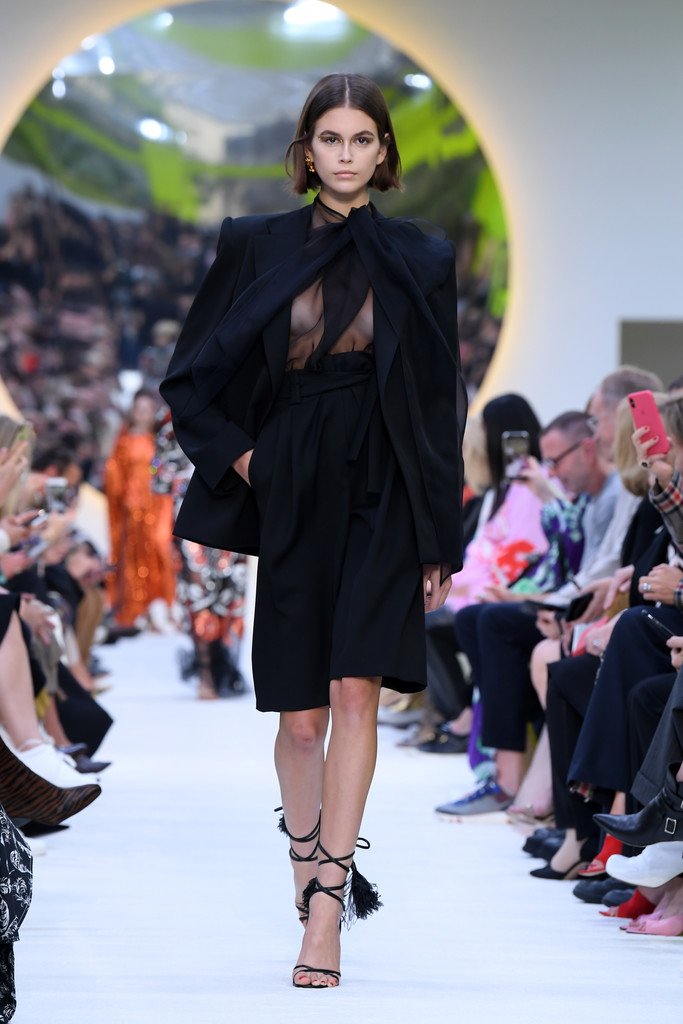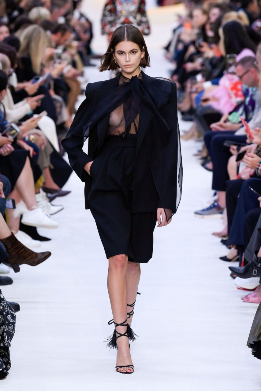 Model Kaia Gerber (18) desfila con una blusa transparente en el desfile de moda Valentino Primavera/Verano 2020 en París, 29/09/2019.