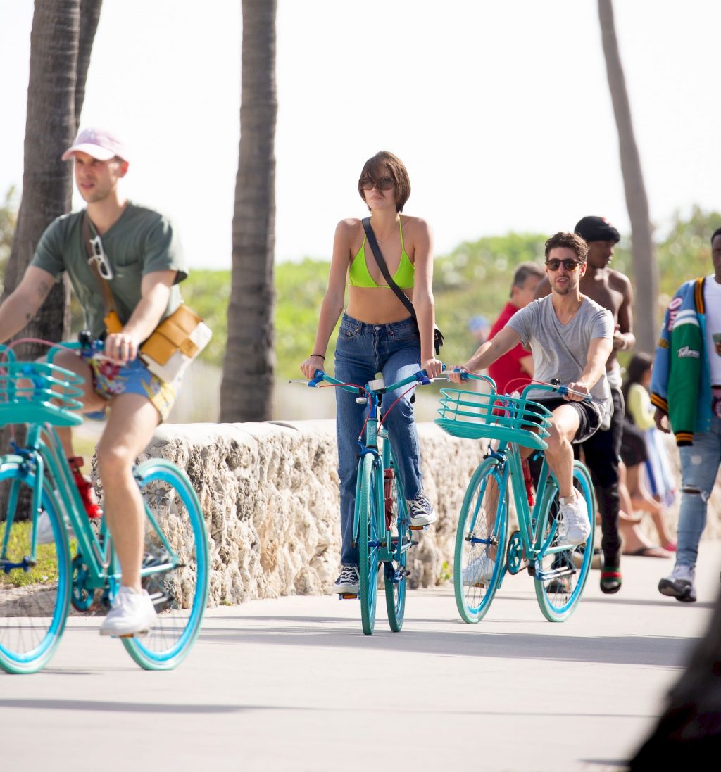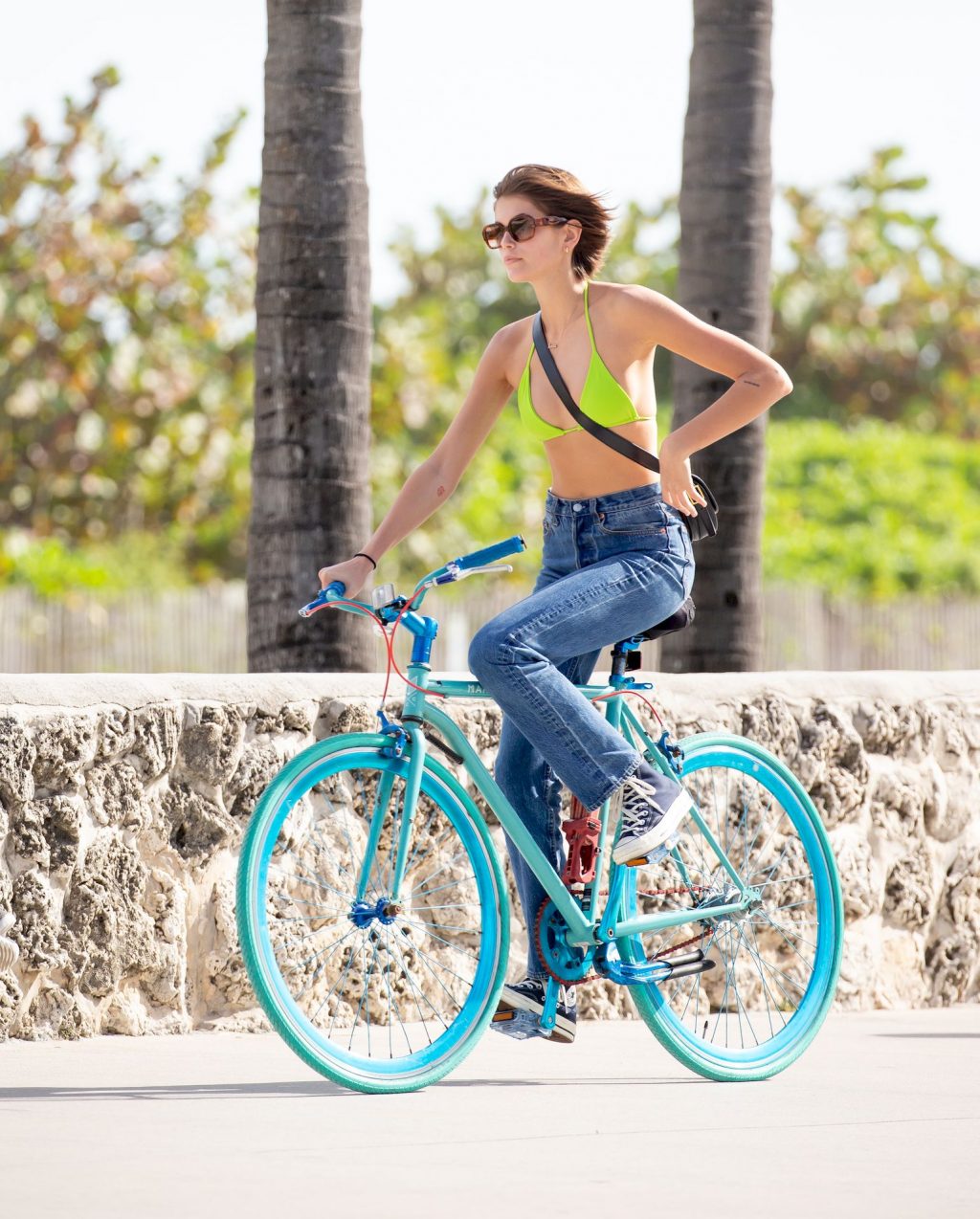 La supermodelo Kaia Gerber (18) parece despreocupada durante un paseo en bicicleta por Miami Beach con amigos de Hollywood, 13/01/2020.