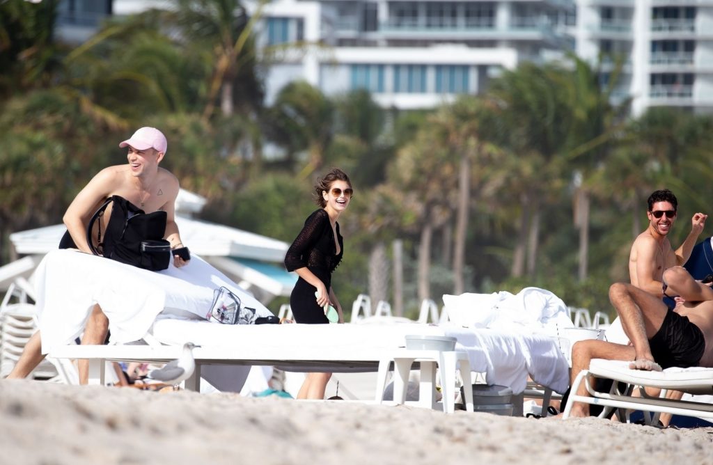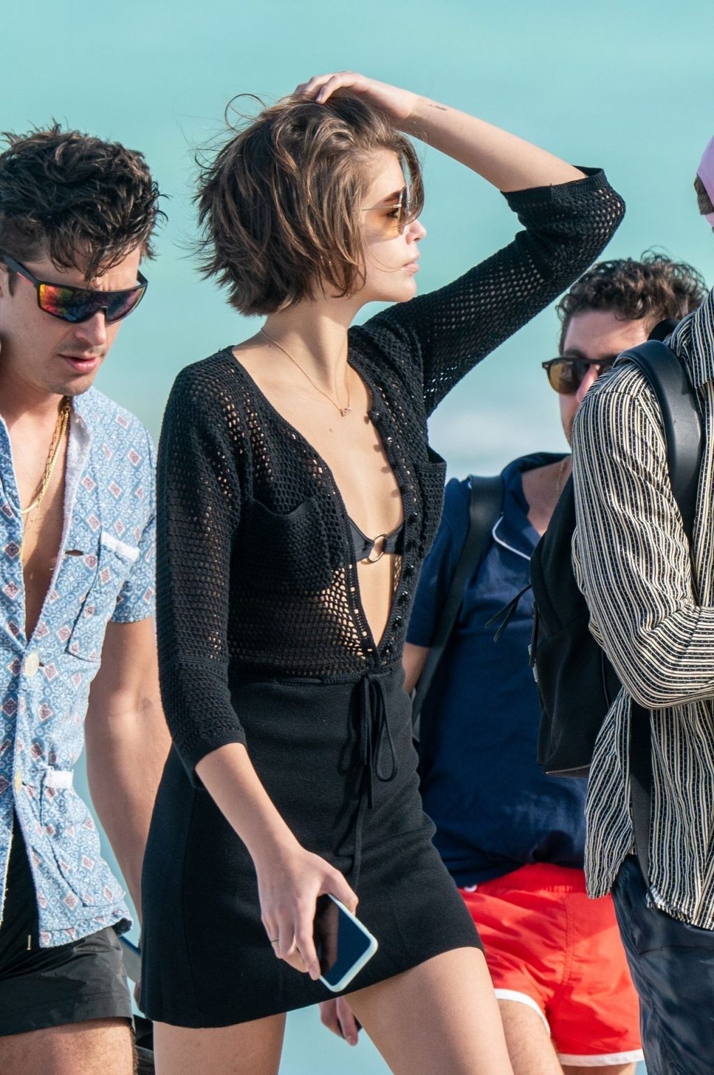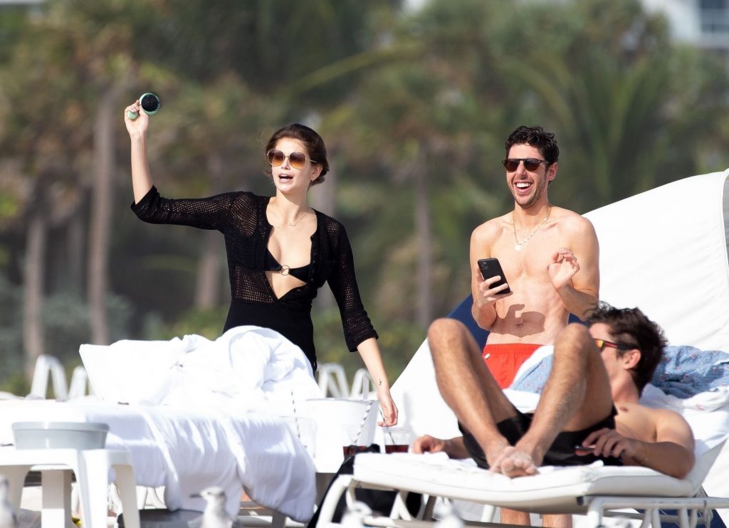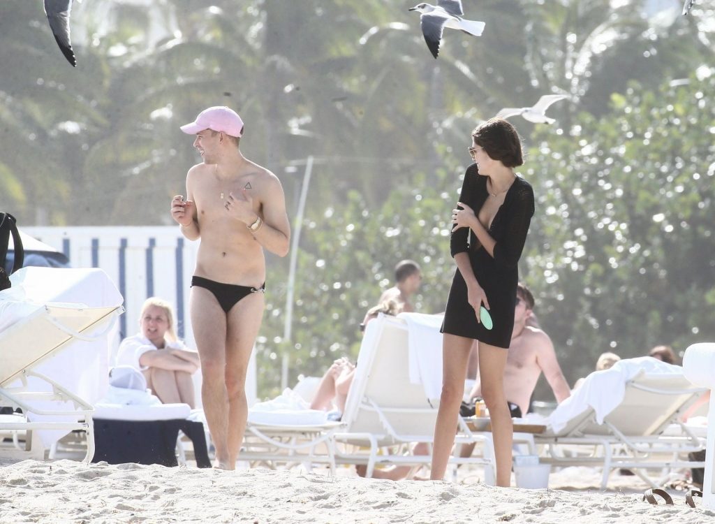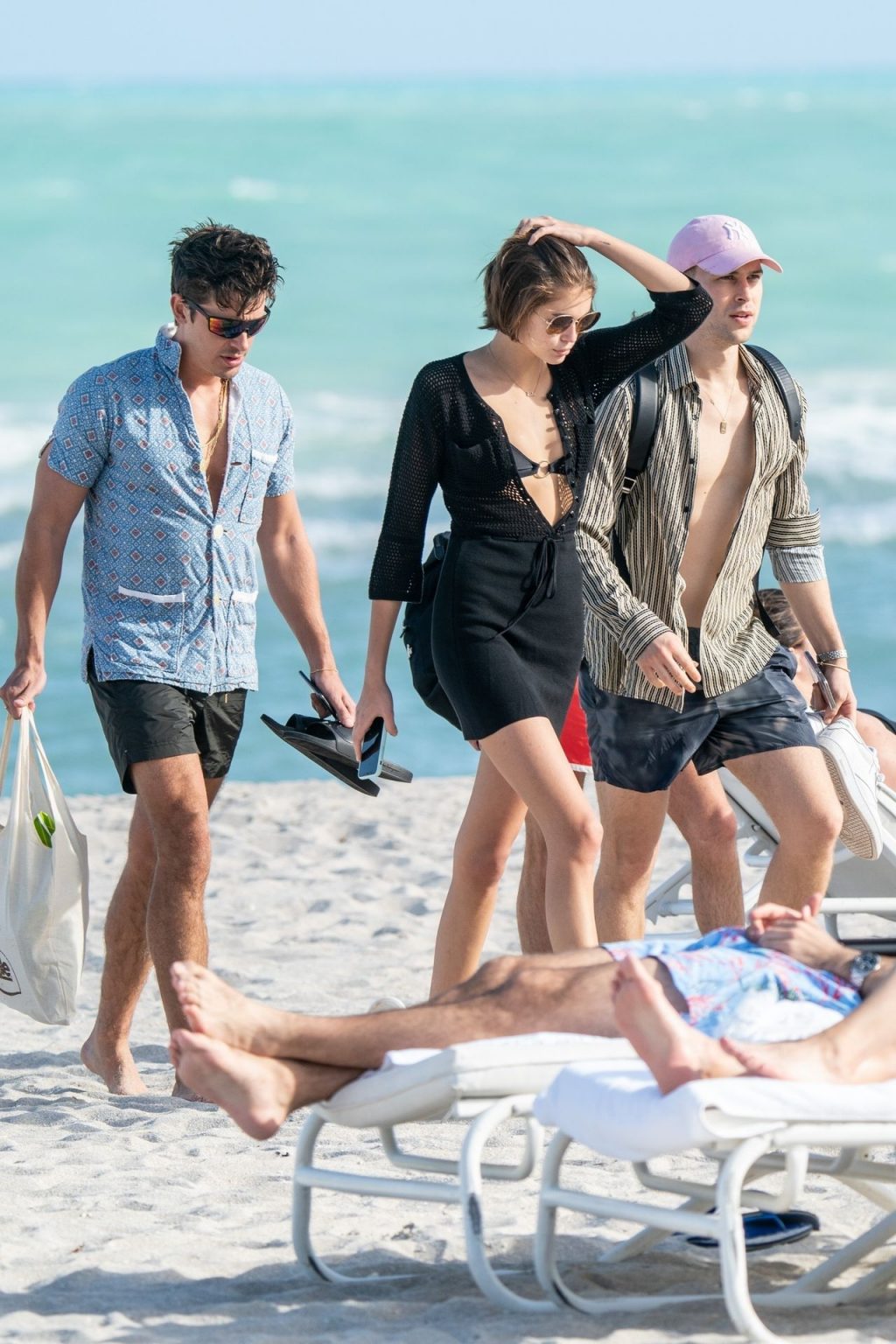 Kaia Gerber muestra sus pequeños pechos, dulce trasero y piernas sexys, mientras disfruta de un día en la playa en Miami Beach, 11/01/2020. Kaia luce genial con el conjunto negro mientras disfruta el día con amigos. A los chicos les gustaría ver un trío desnudo.