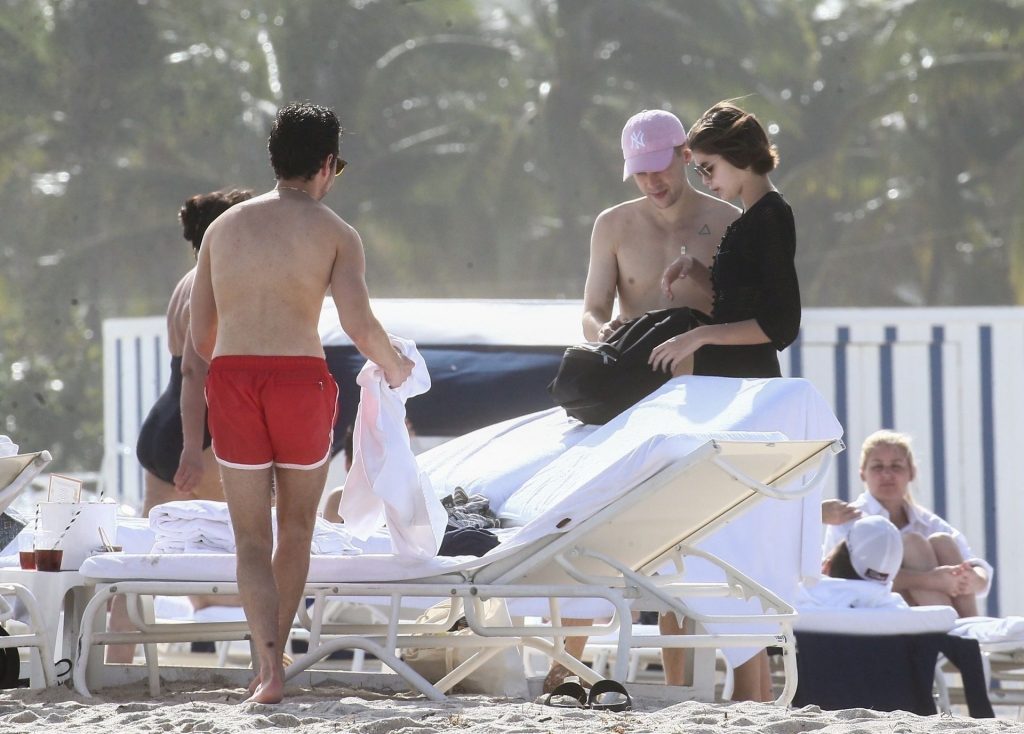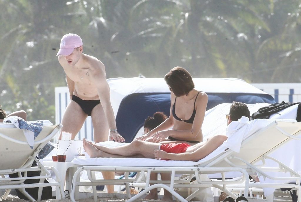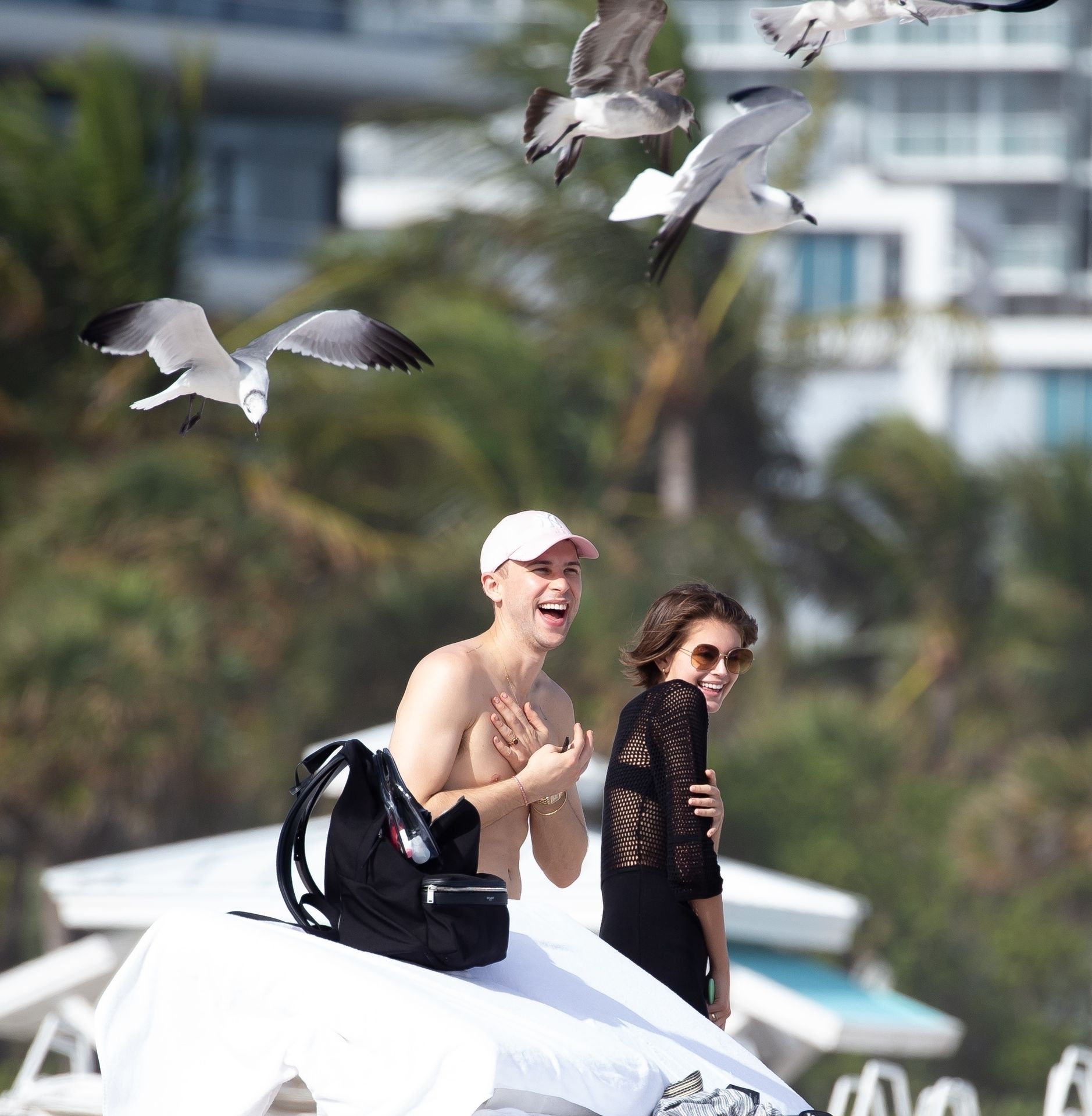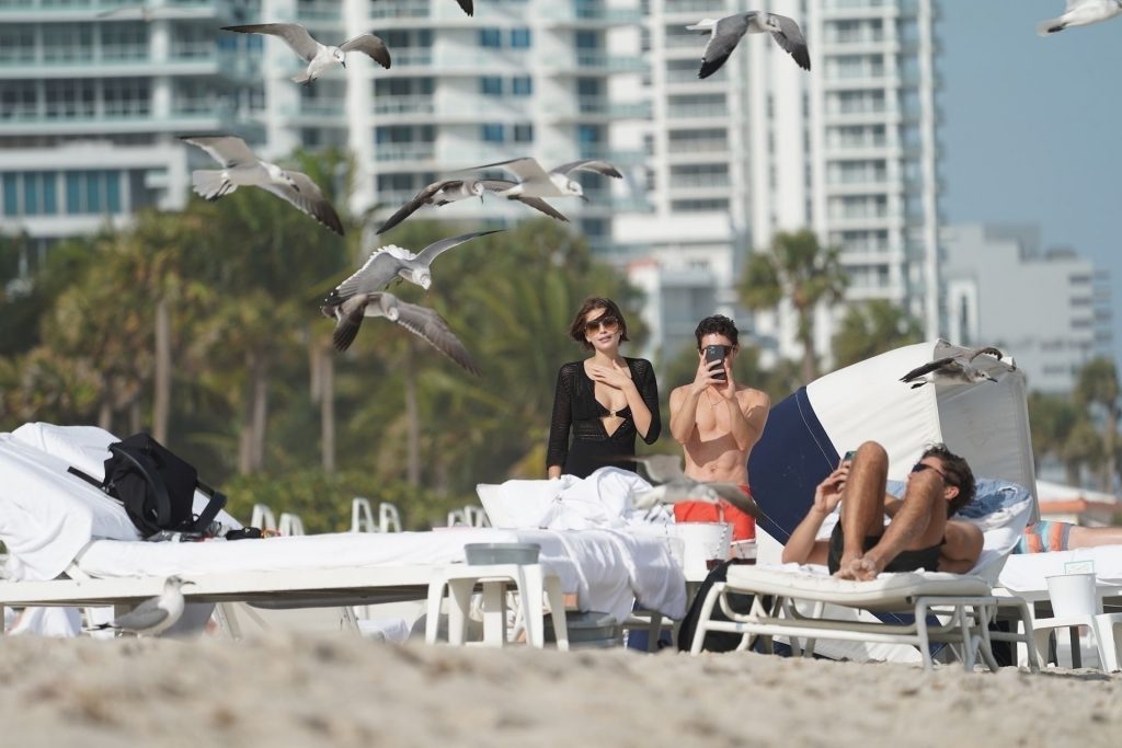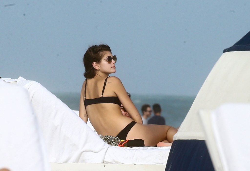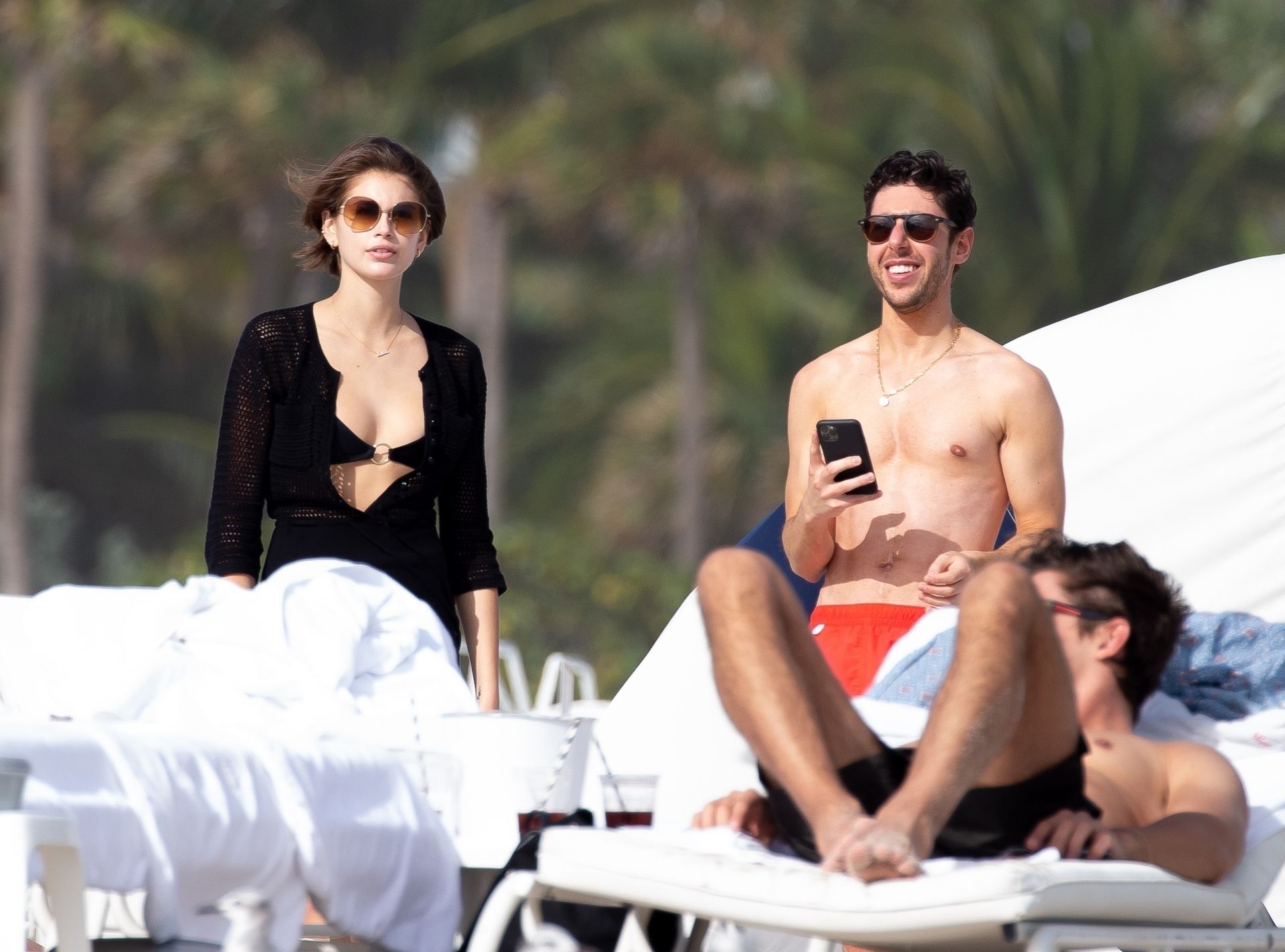 Kaia Gerber muestra sus pequeños pechos, dulce trasero y piernas sexys, mientras disfruta de un día en la playa en Miami Beach, 11/01/2020. Kaia luce genial con el conjunto negro mientras disfruta el día con amigos. A los chicos les gustaría ver un trío desnudo.