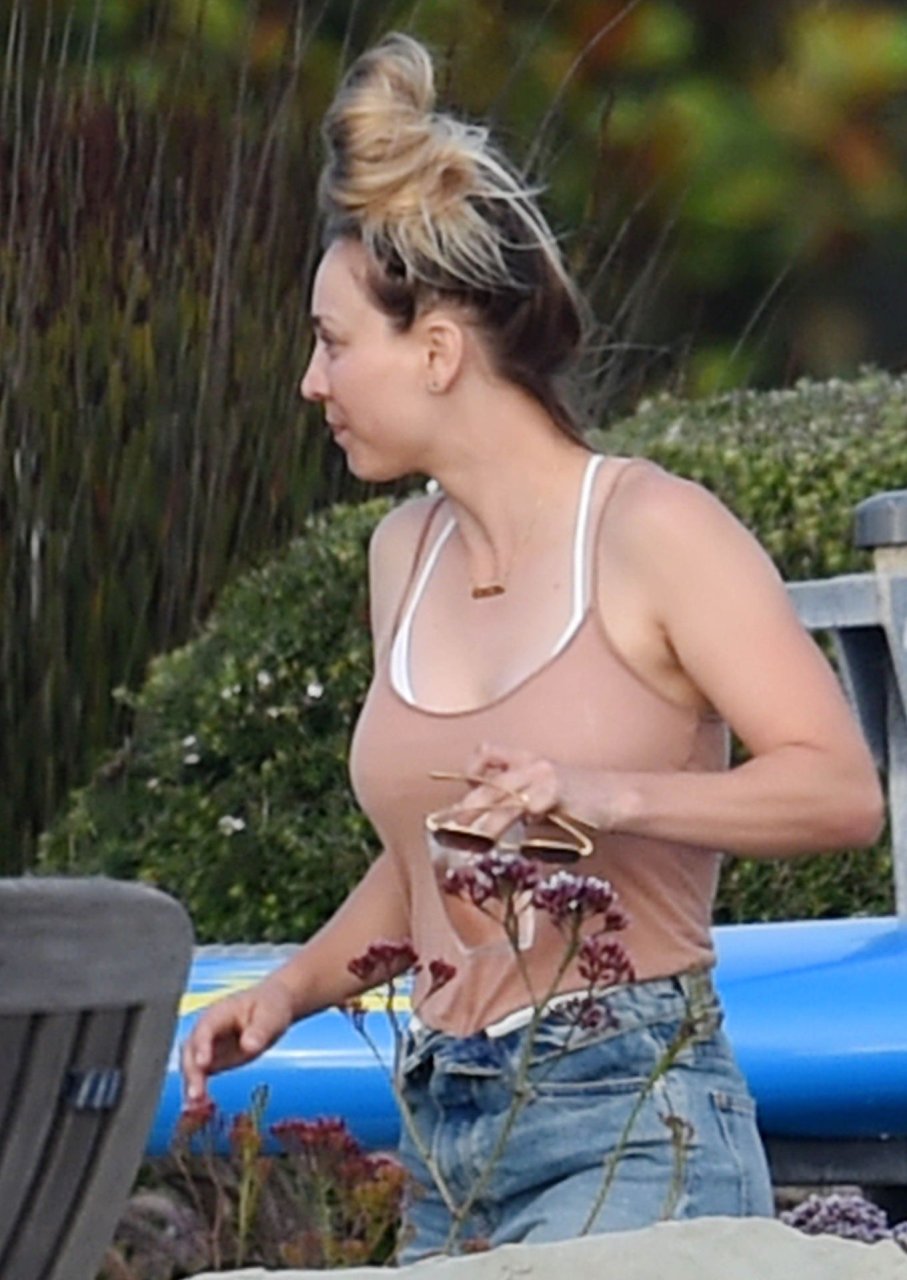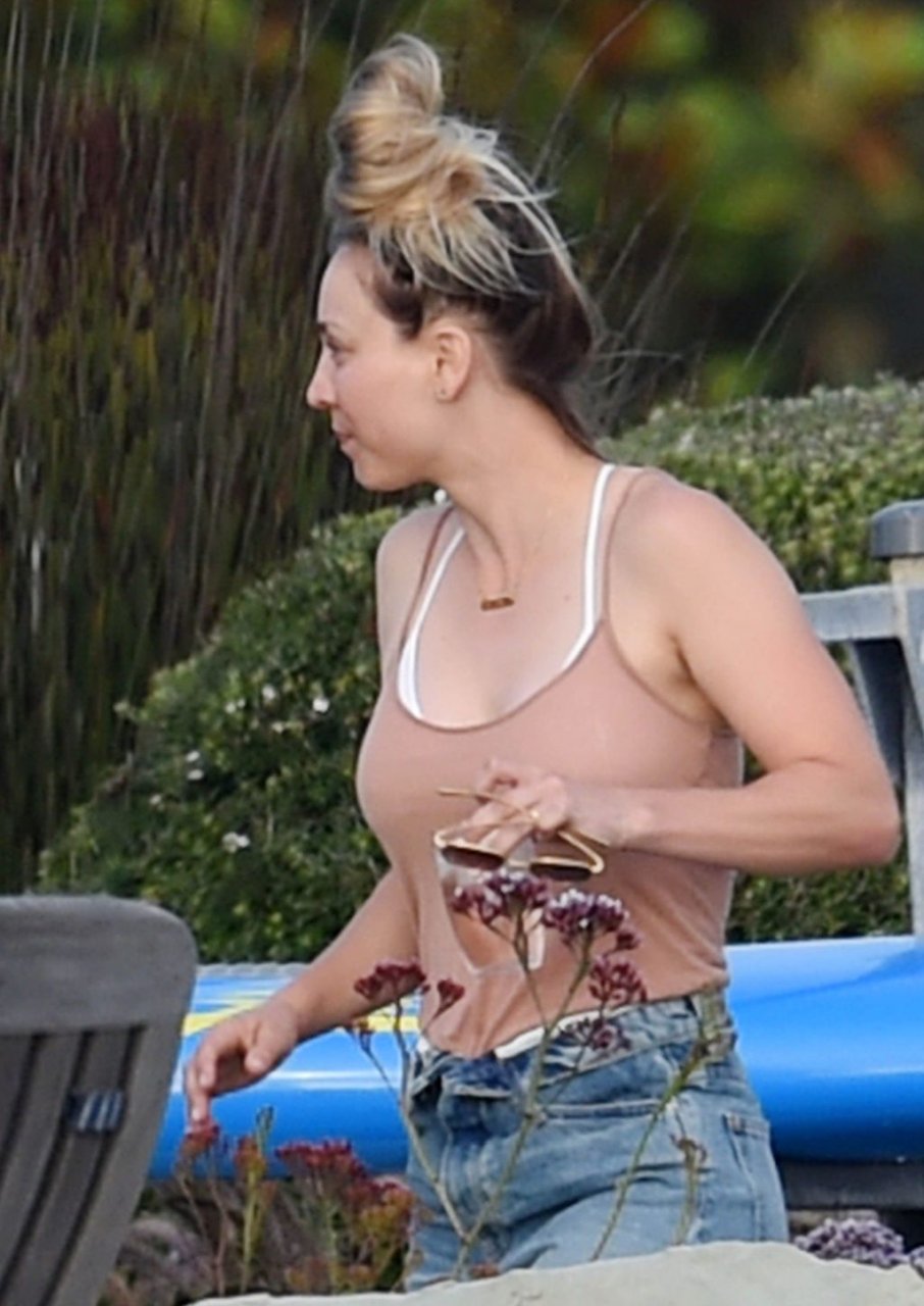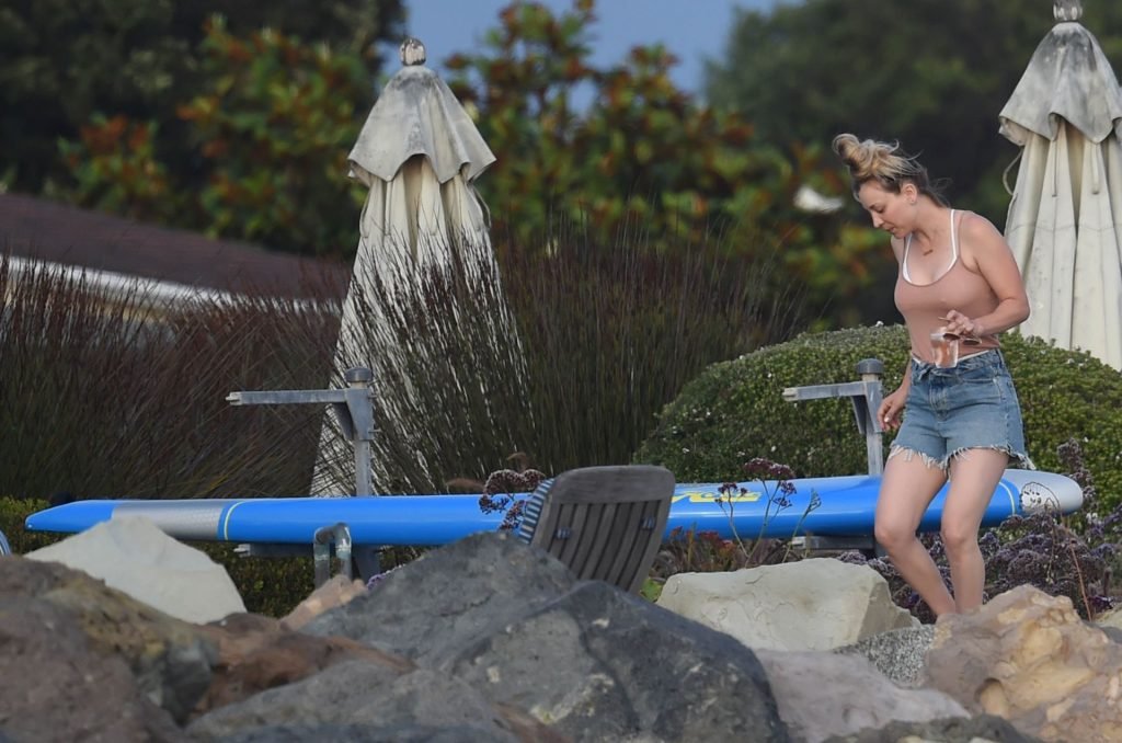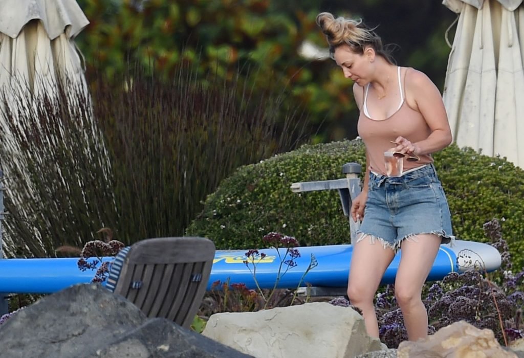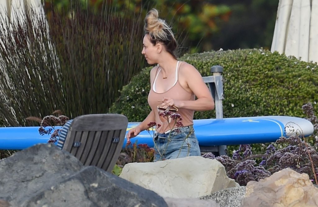 Kaley Cuoco va descalza con shorts de mezclilla mientras juega con amigos en una fiesta en la playa en una playa de Santa Bárbara el sábado, 07/09/2019.