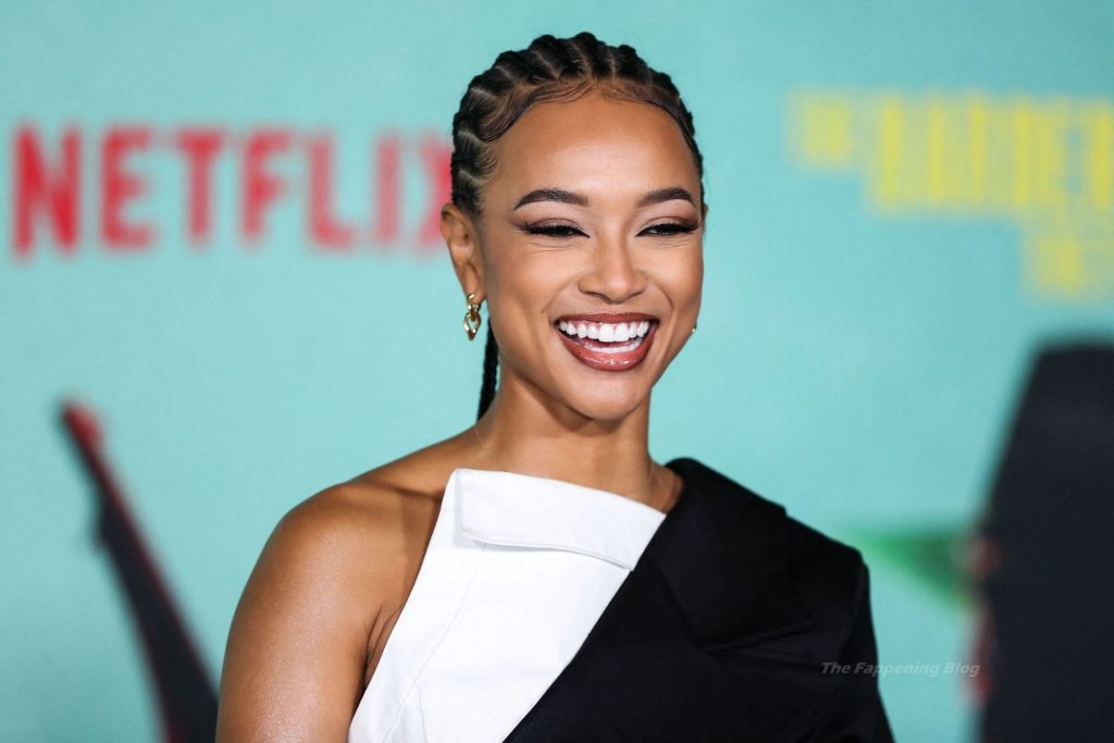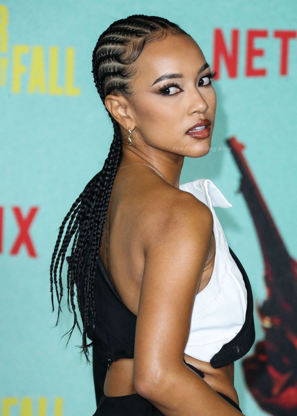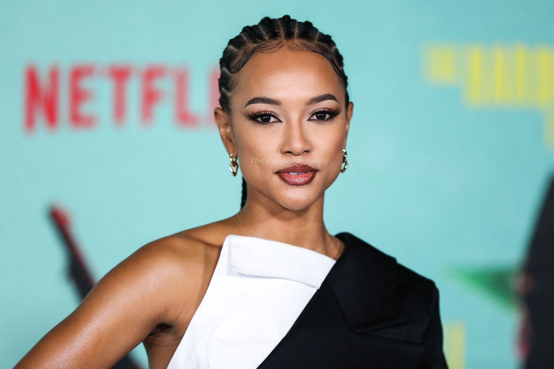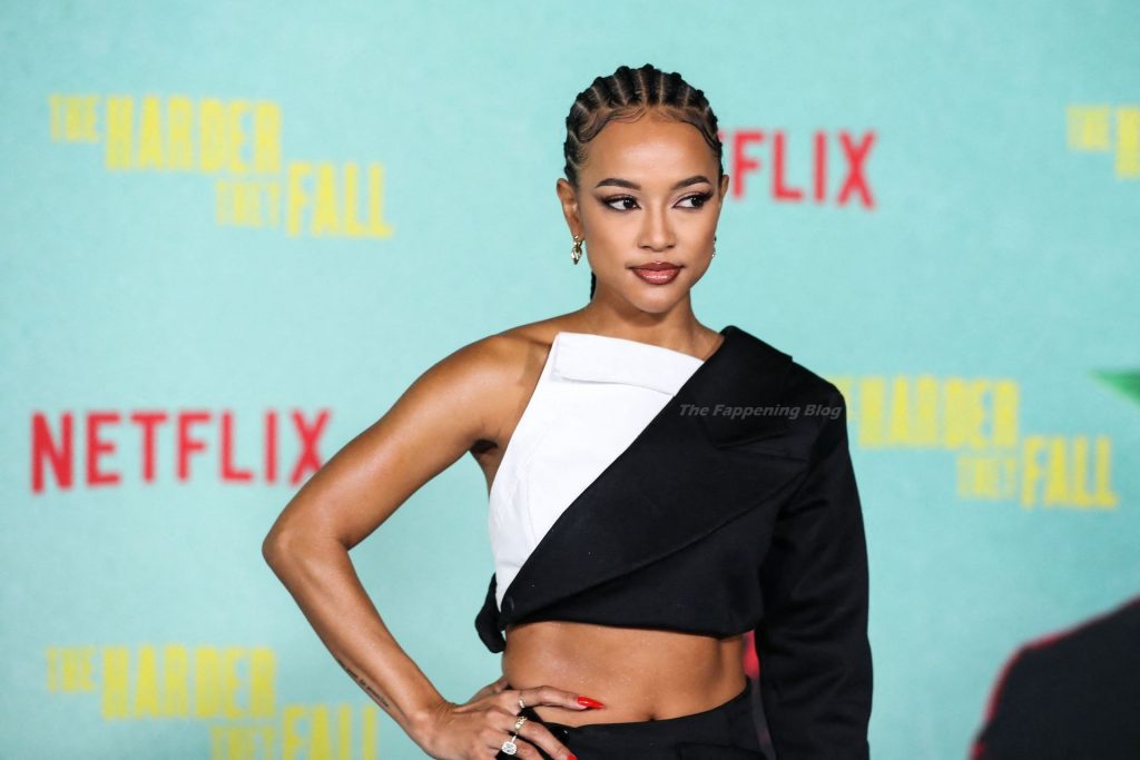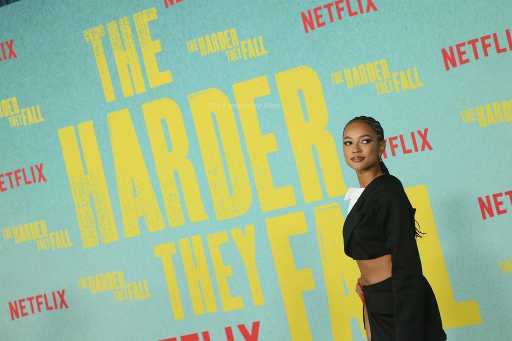 Actriz Karrueche Tran luce espectacular mientras posa en la alfombra roja del estreno en Los Ángeles de “The Harder They Fall” en el Shrine Auditorium and Expo Hall, 13/10/2021.