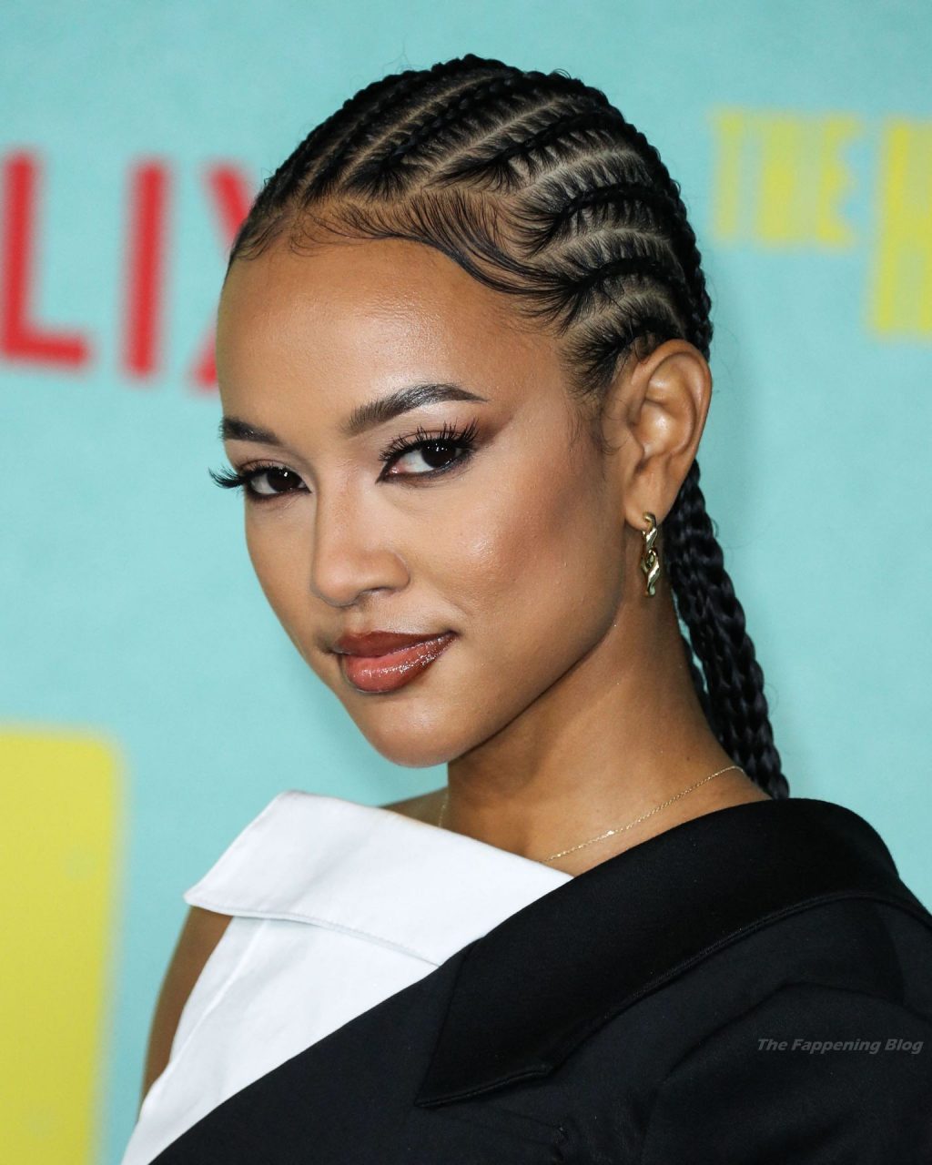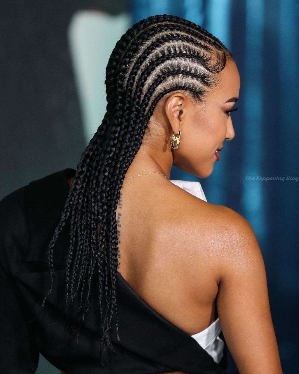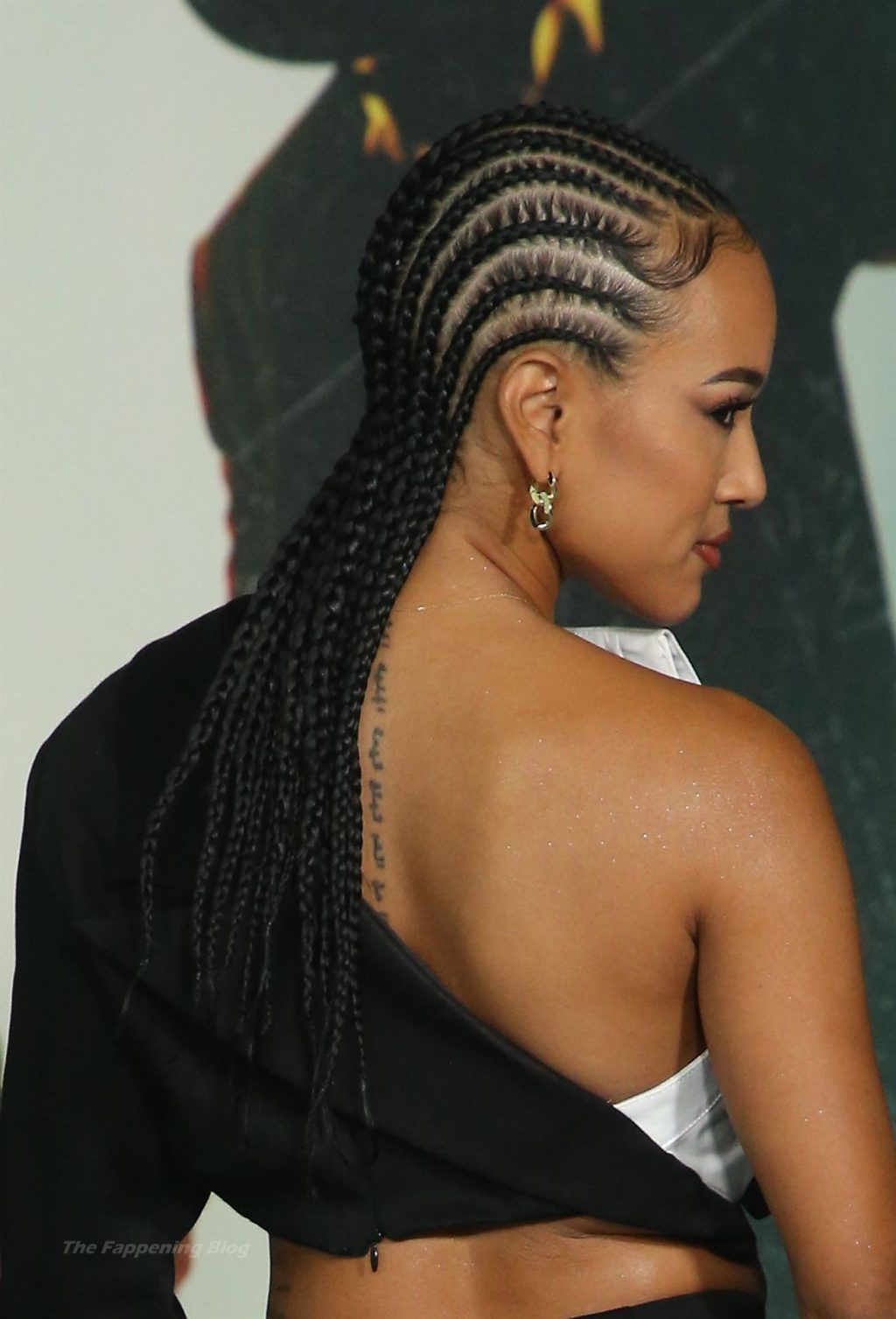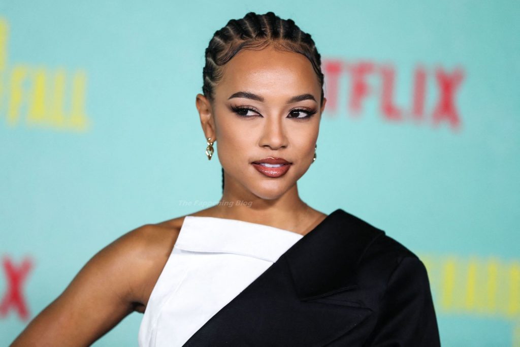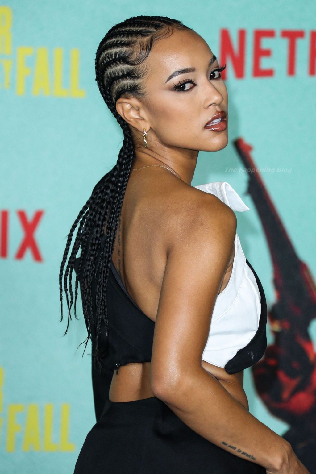 Actriz Karrueche Tran luce espectacular mientras posa en la alfombra roja del estreno en Los Ángeles de “The Harder They Fall” en el Shrine Auditorium and Expo Hall, 13/10/2021.