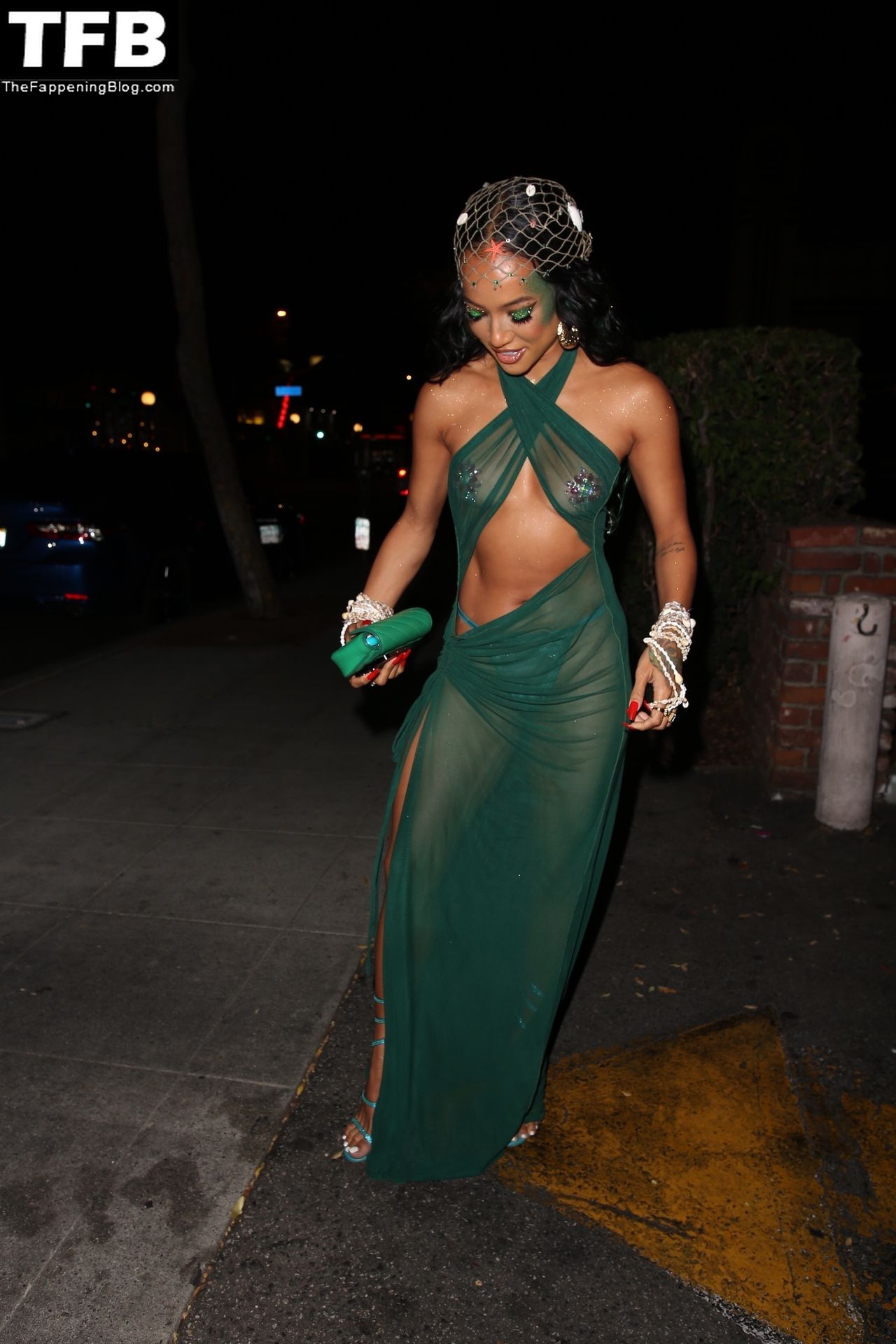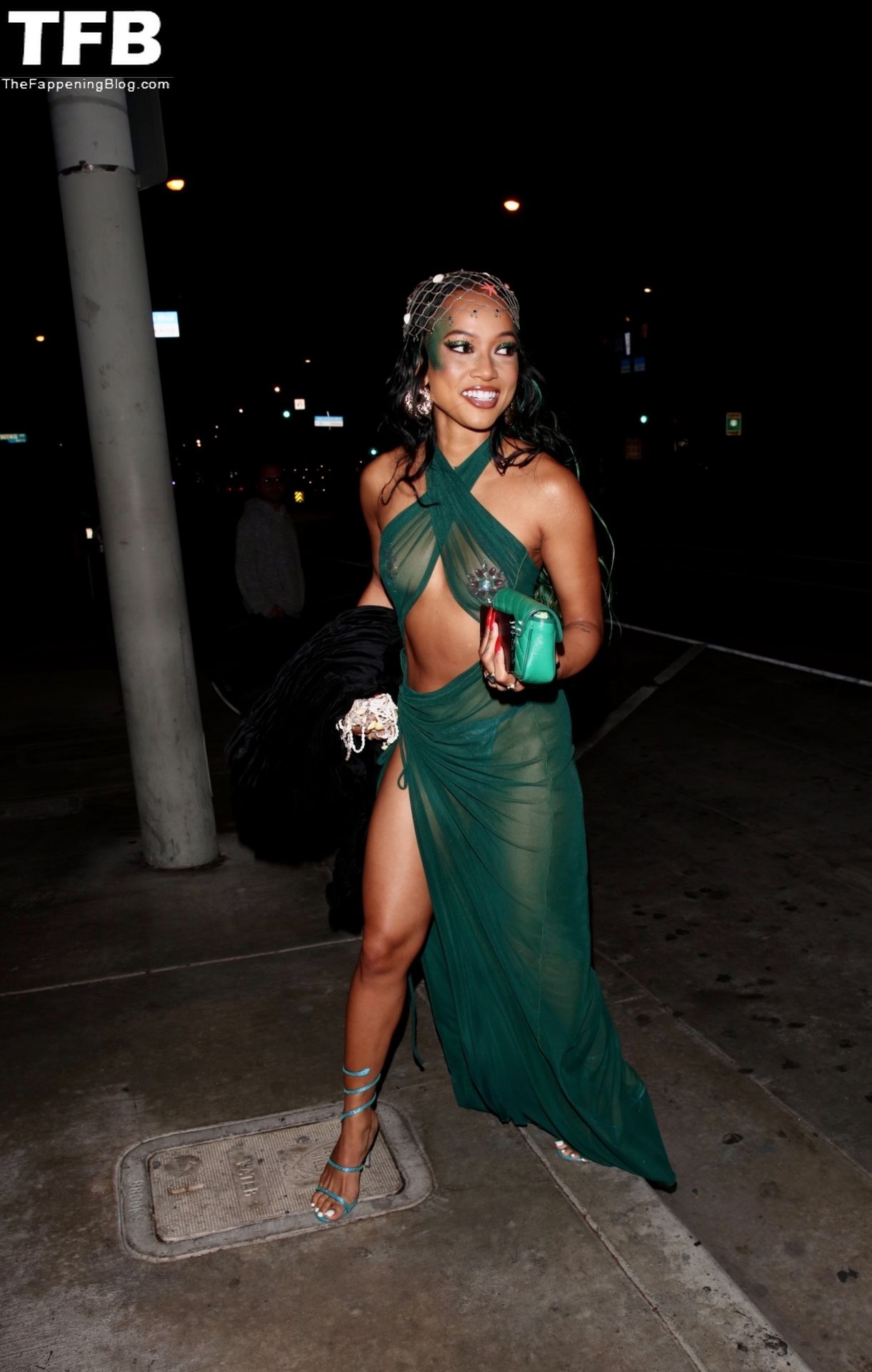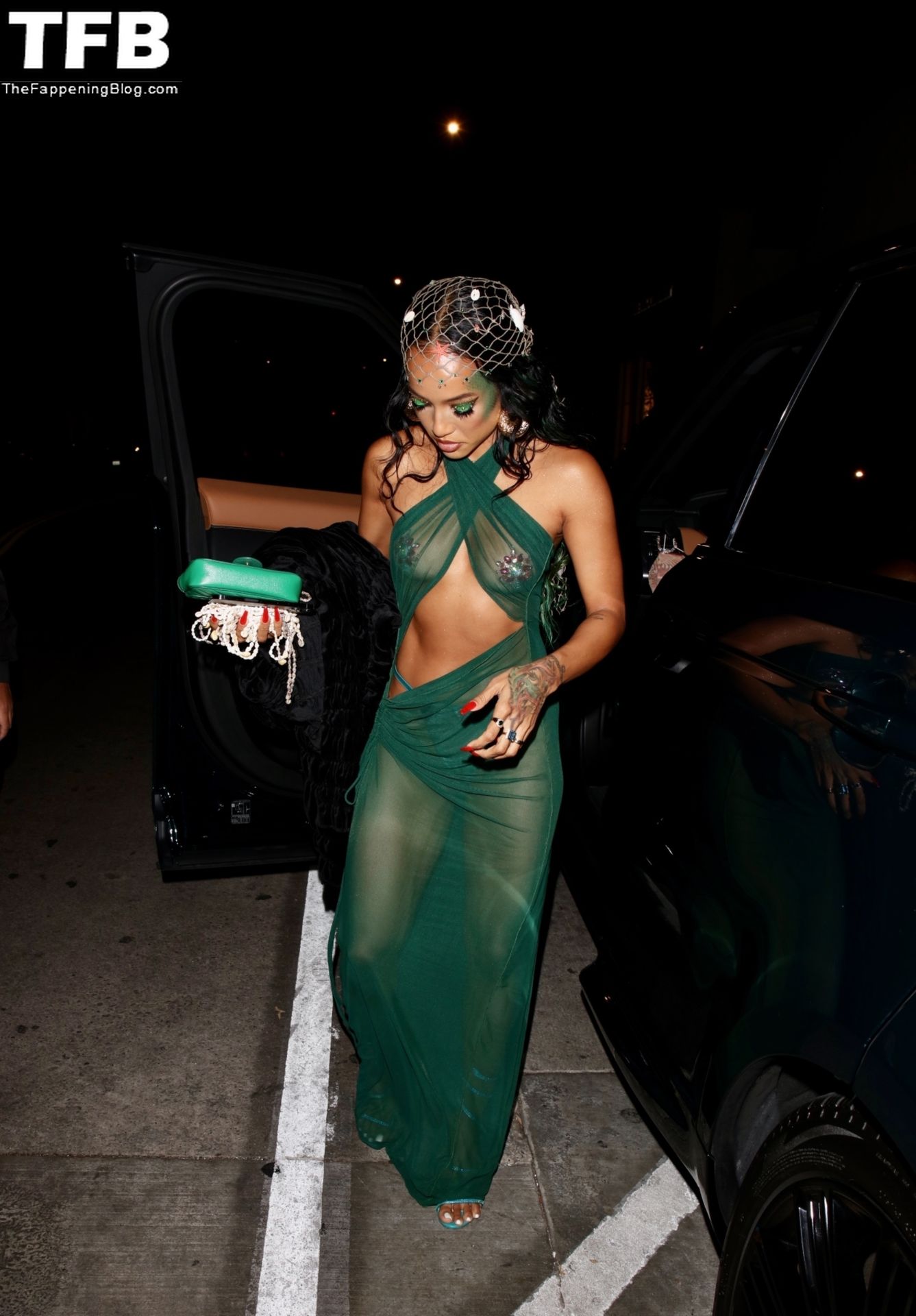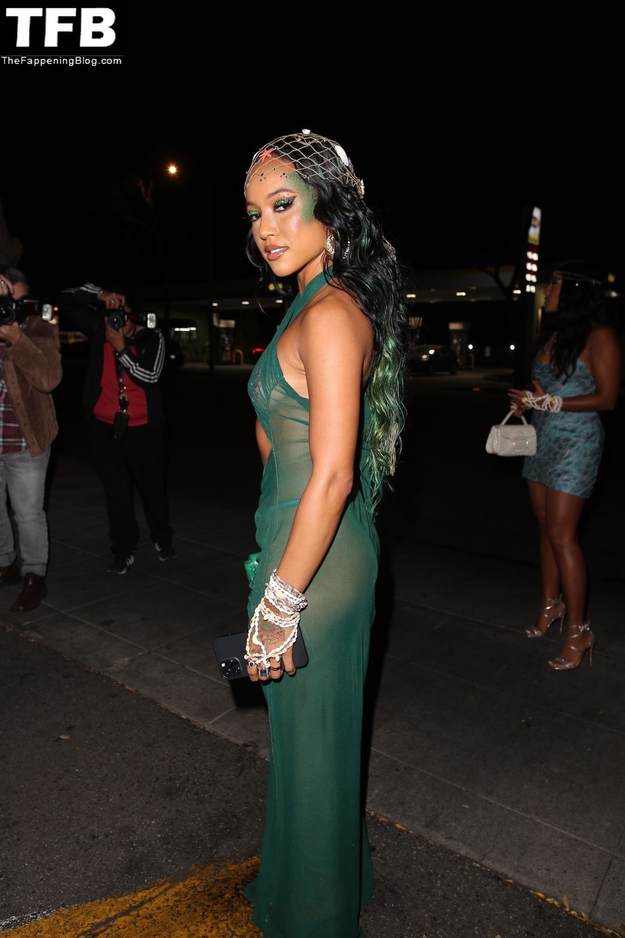 Karrueche Tran va sin sujetador bajo un vestido verde transparente mientras asiste a la fiesta de cumpleaños de Doja Cat (64 Fotos)