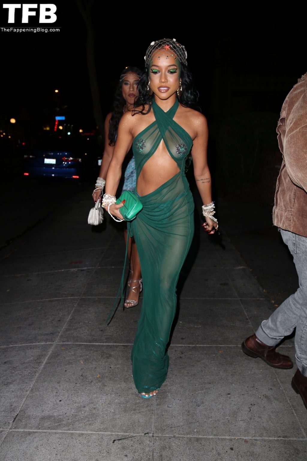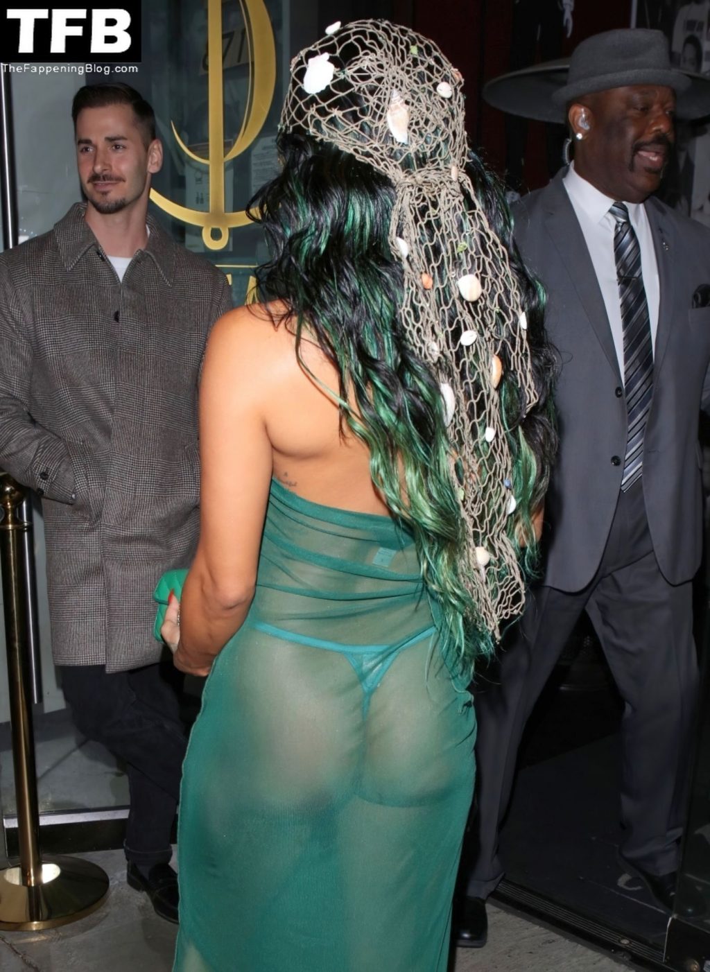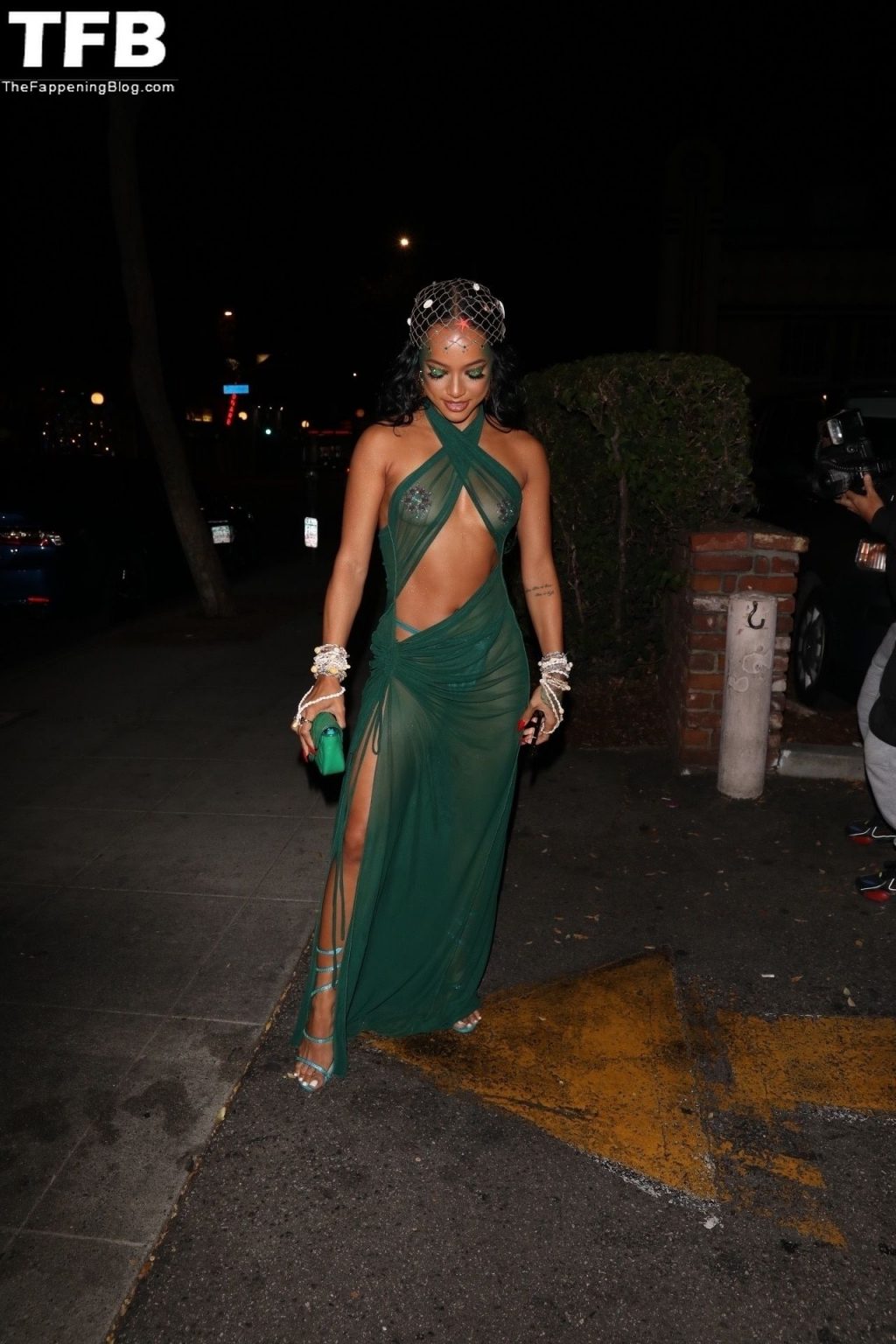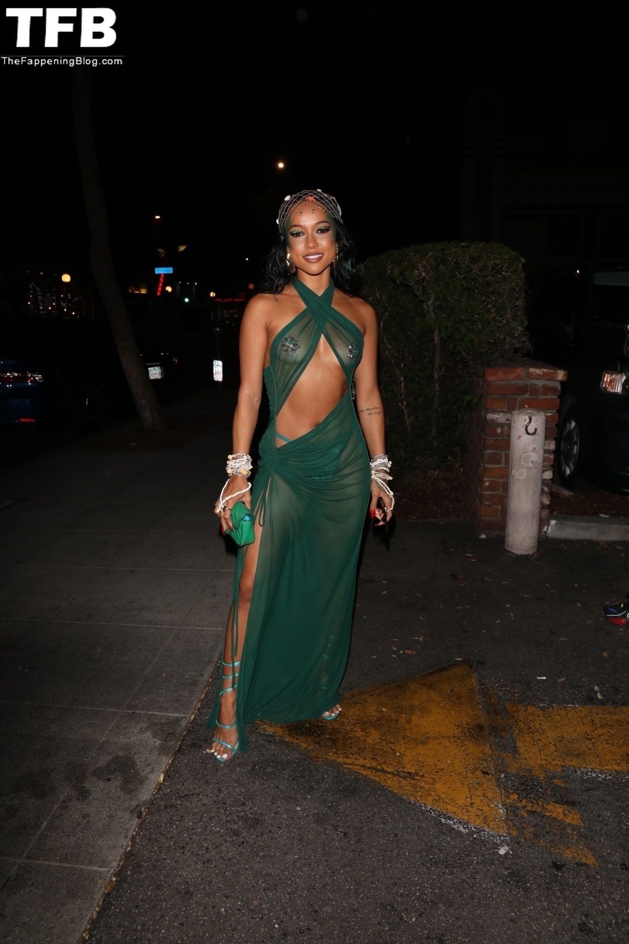 Karrueche Tran va sin sujetador bajo un vestido verde transparente mientras asiste a la fiesta de cumpleaños de Doja Cat (64 Fotos)