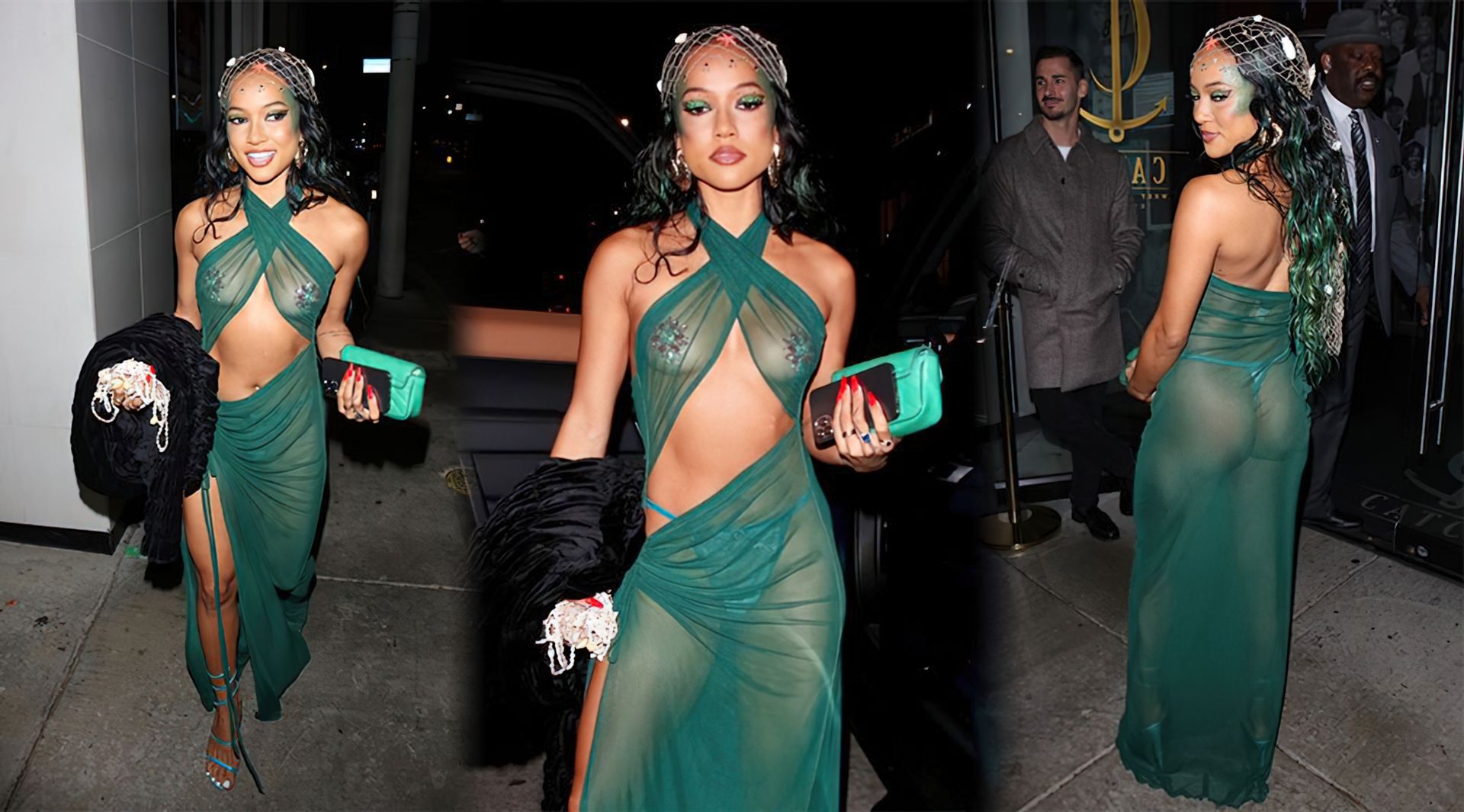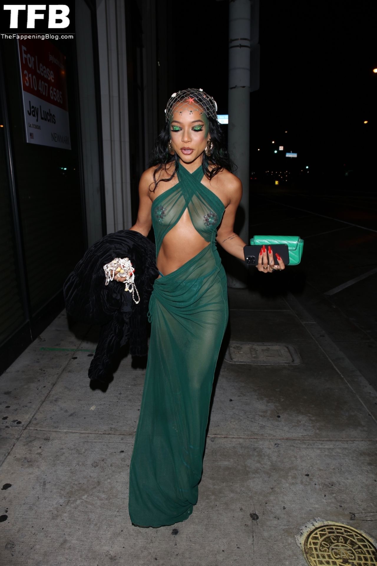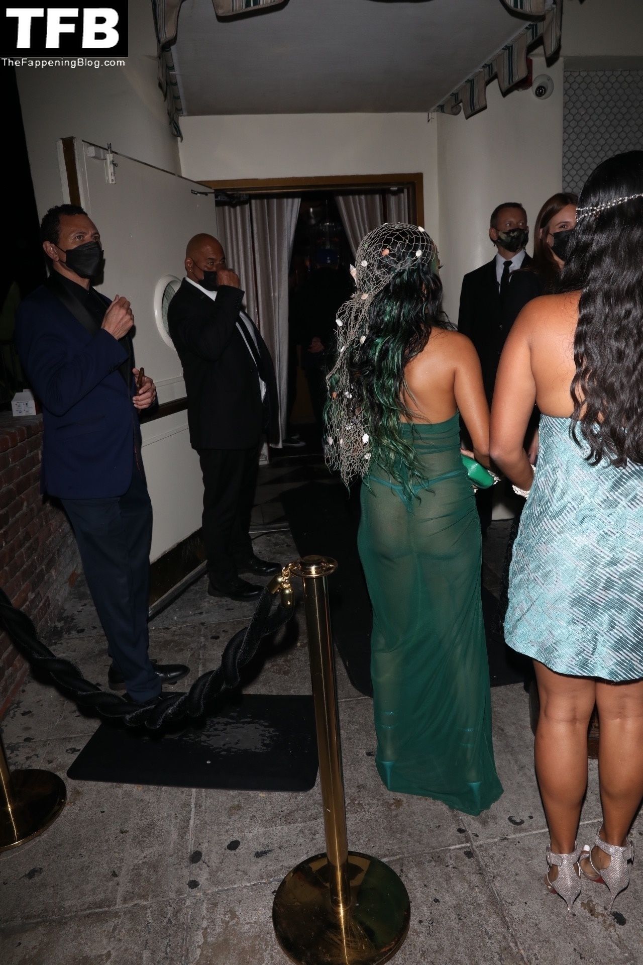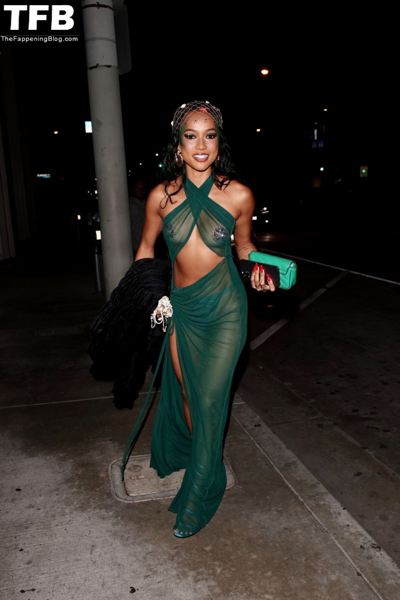 Karrueche Tran va sin sujetador bajo un vestido verde transparente mientras asiste a la fiesta de cumpleaños de Doja Cat (64 Fotos)
