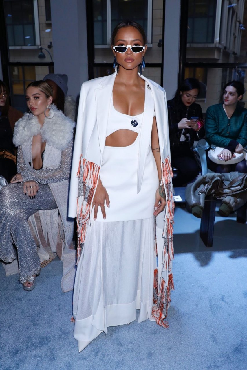 Karrueche Tran mostró su escote luciendo un conjunto blanco en el desfile de otoño/invierno 2019 de 3.1 Phillip Lim durante la Semana de la Moda de Nueva York, 11/02/2019.