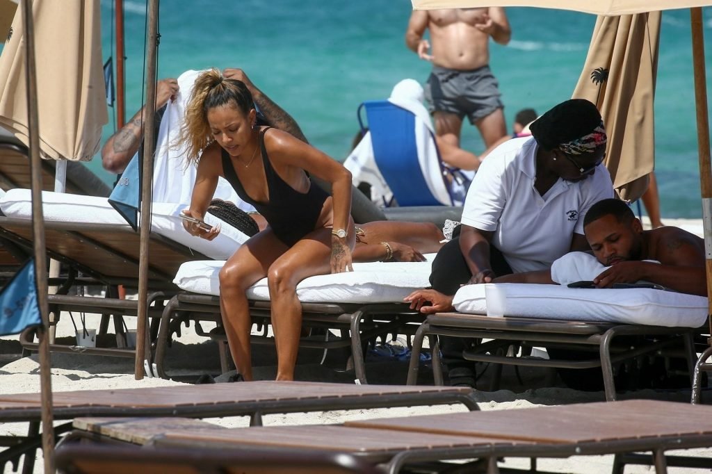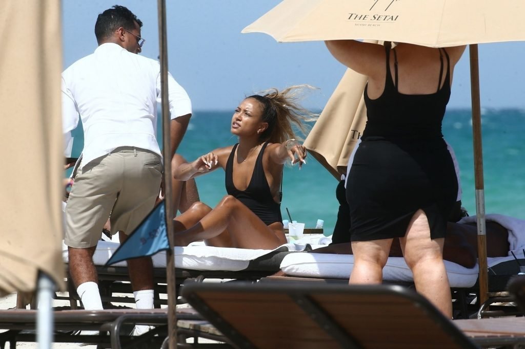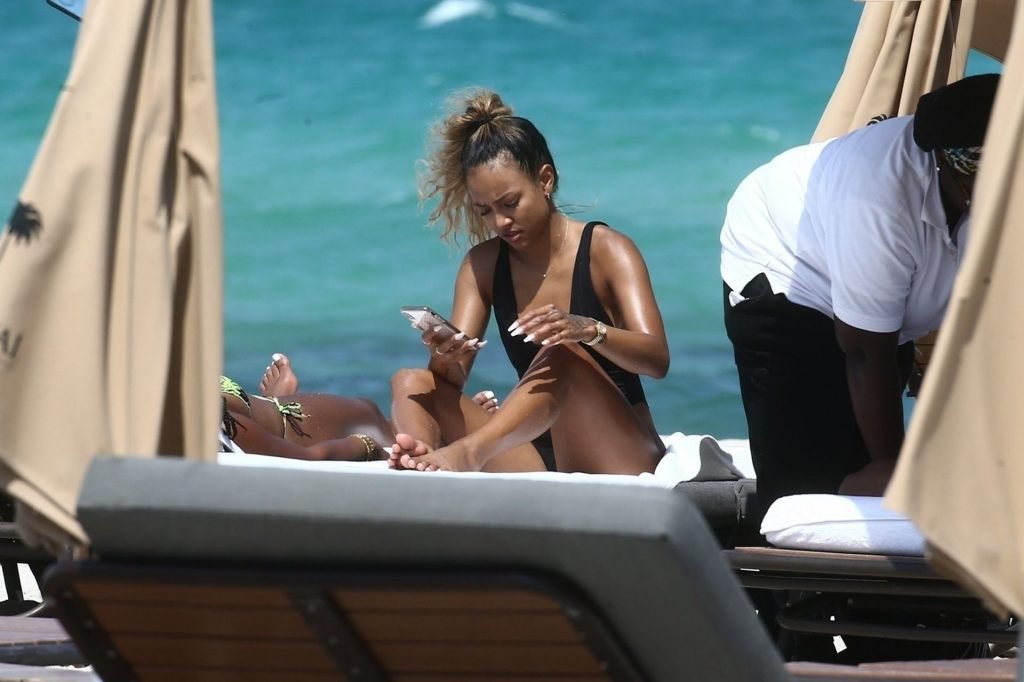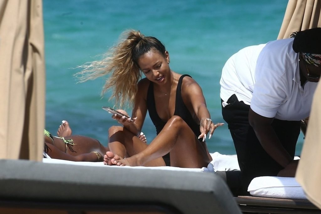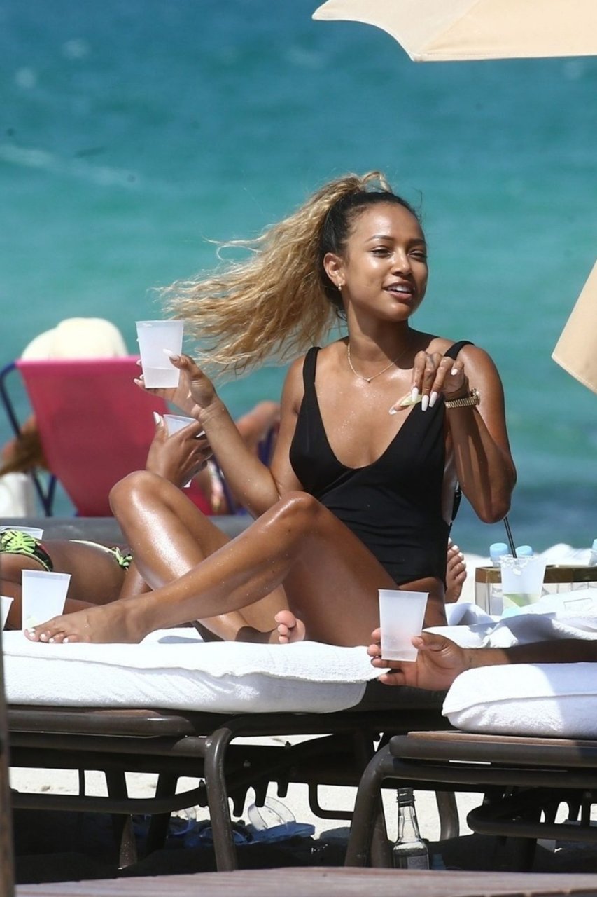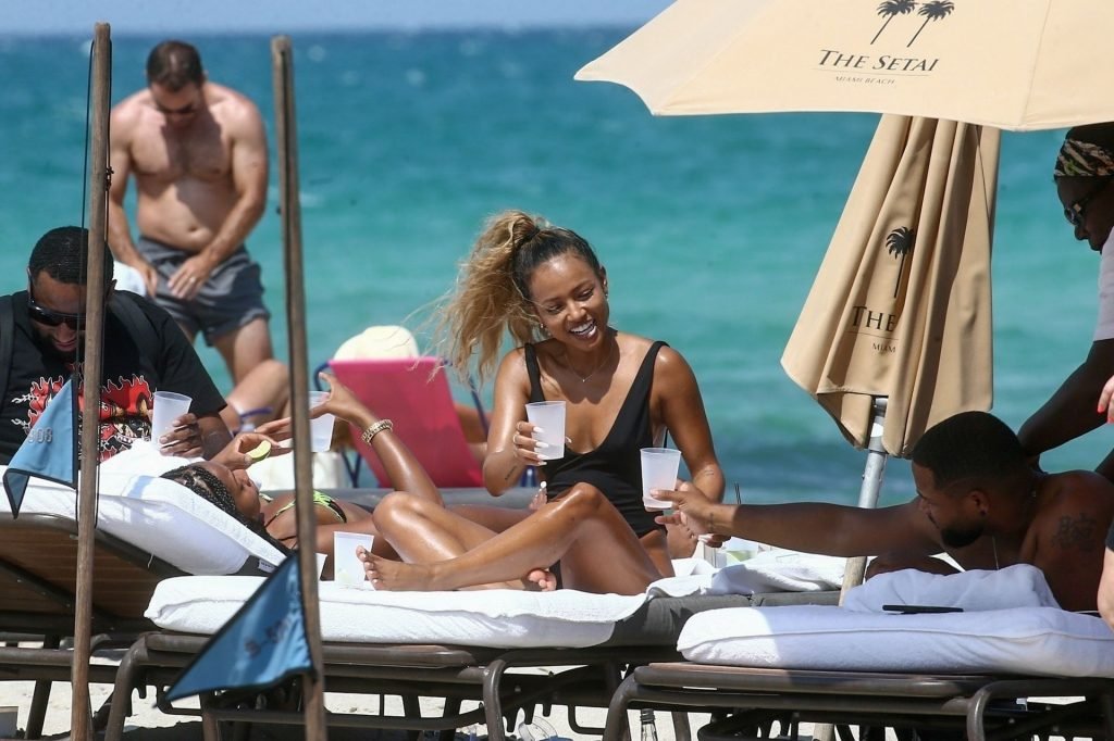 Karrueche Tran disfruta de una bebida mientras toma el sol durante un divertido viaje a la playa en Miami con amigos, 13/05/2019. Karrueche, quien actualmente protagoniza a Virginia en ‘Claws’ de TNT, mostró sus curvas con un traje de baño negro de una pieza, revelando todo su arduo trabajo en el gimnasio mientras los paparazzi tomaban fotos.