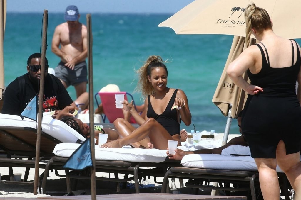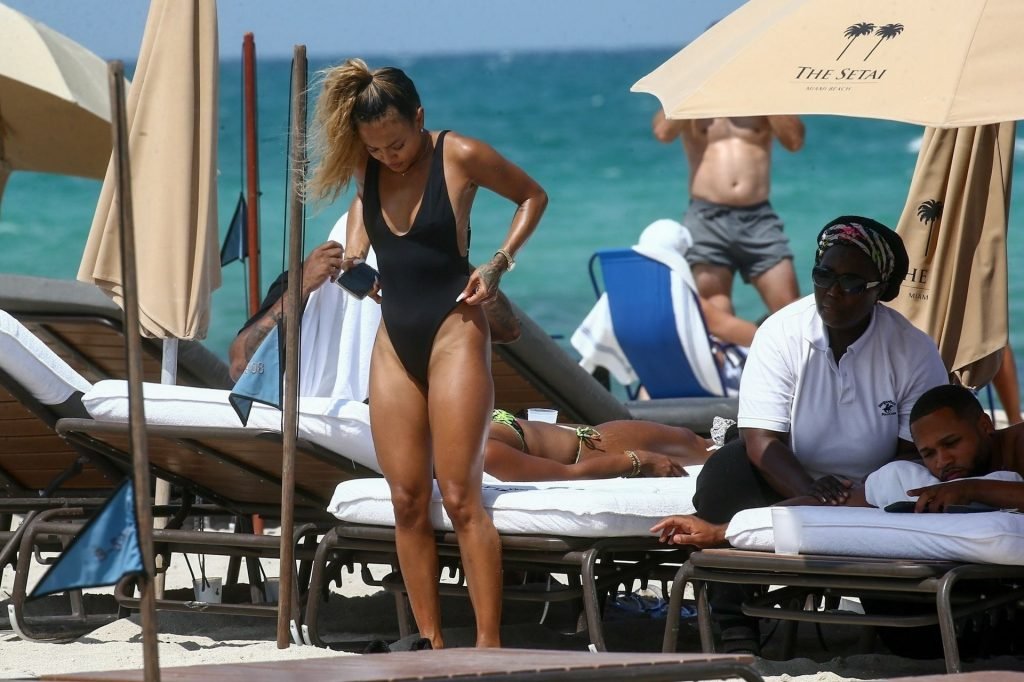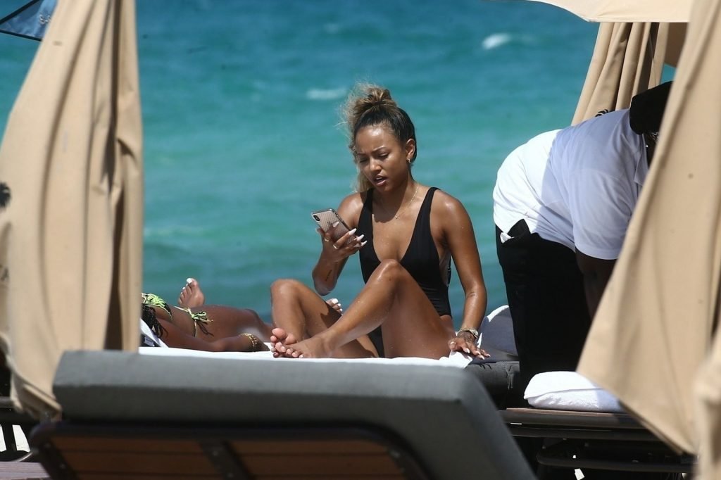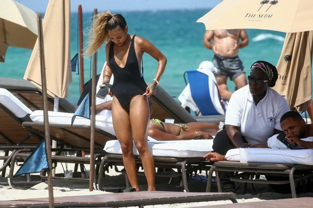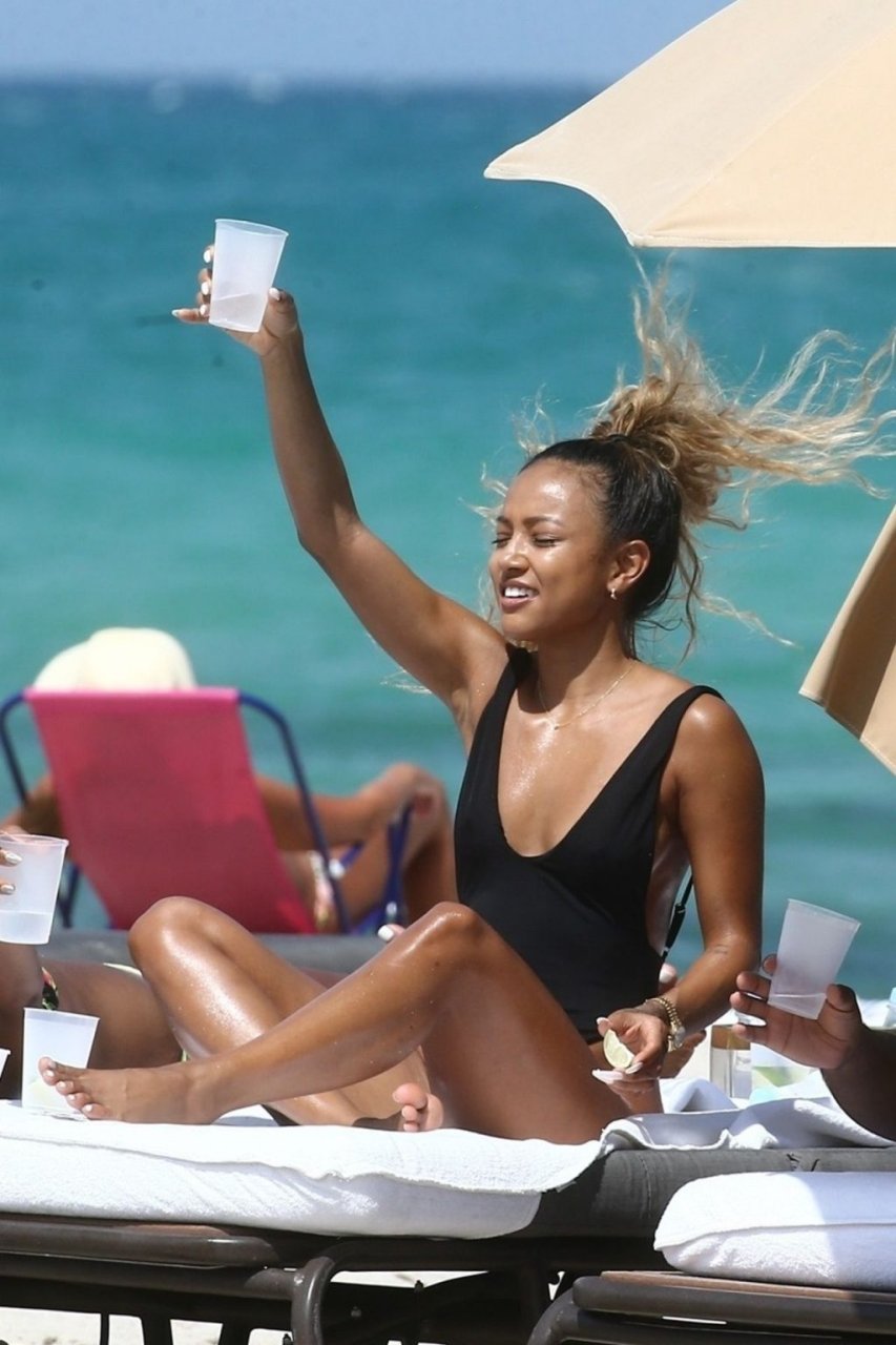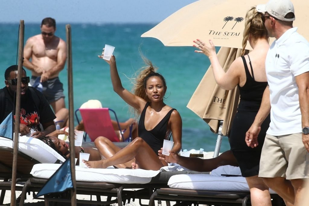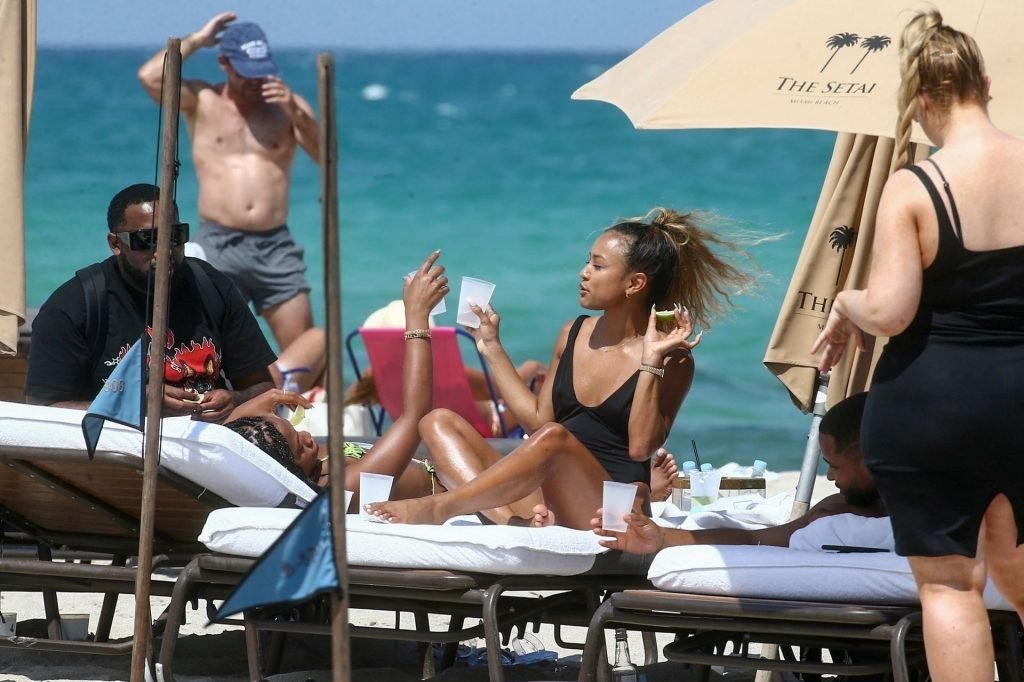 Karrueche Tran disfruta de una bebida mientras toma el sol durante un divertido viaje a la playa en Miami con amigos, 13/05/2019. Karrueche, quien actualmente protagoniza a Virginia en ‘Claws’ de TNT, mostró sus curvas con un traje de baño negro de una pieza, revelando todo su arduo trabajo en el gimnasio mientras los paparazzi tomaban fotos.