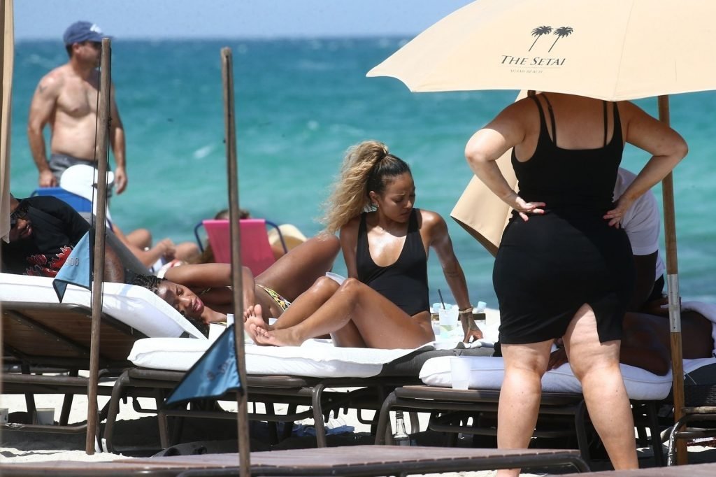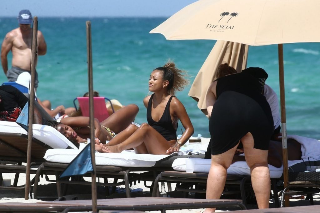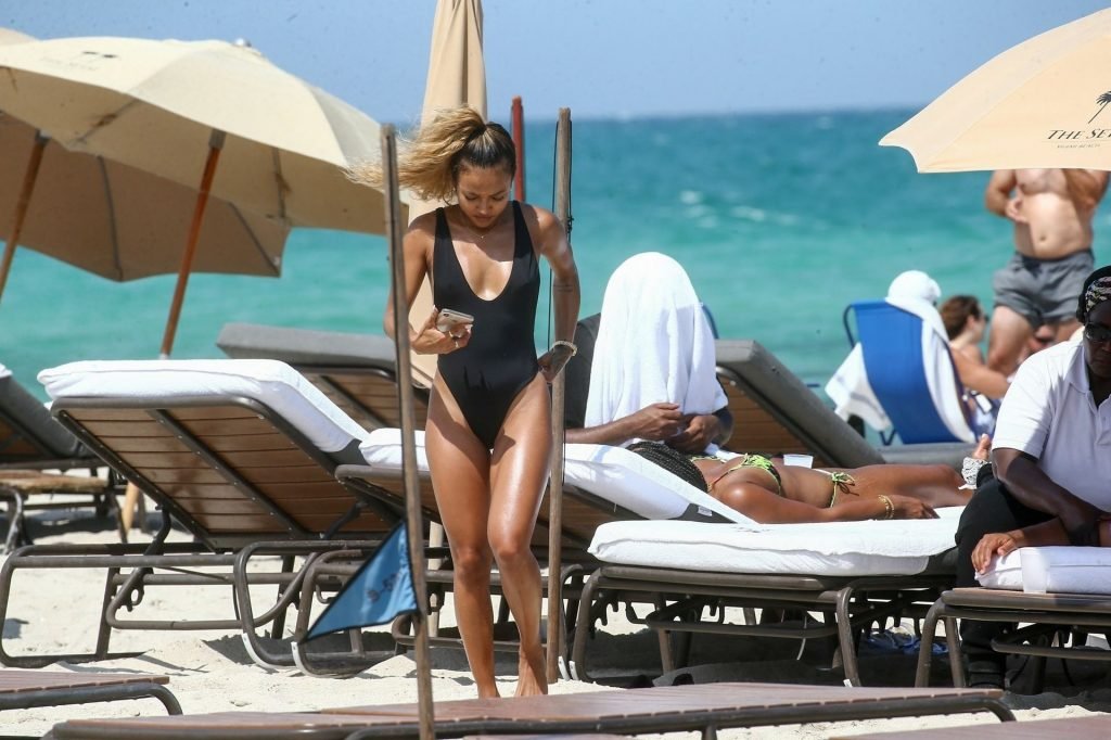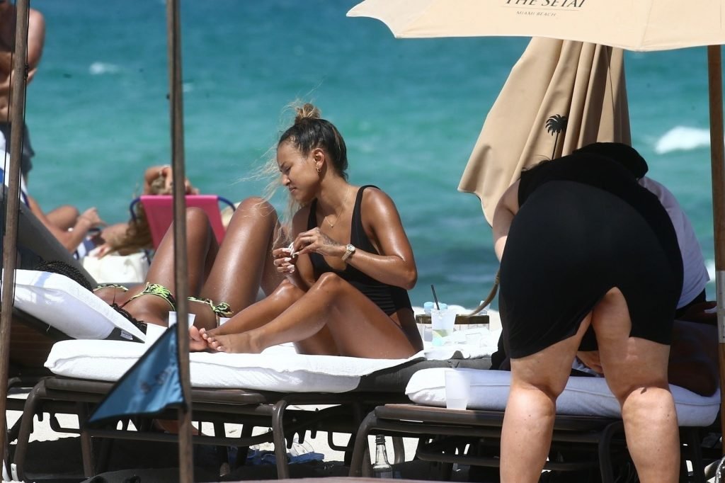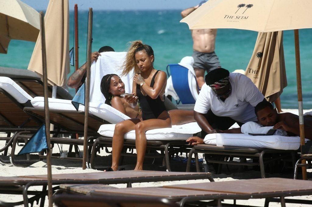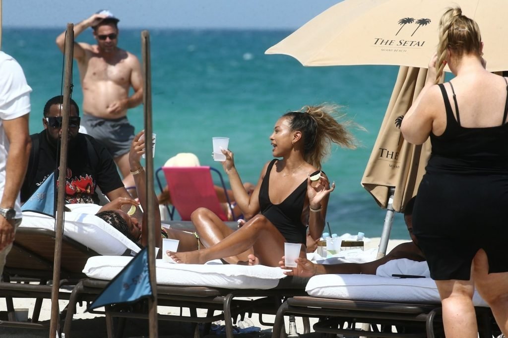 Karrueche Tran disfruta de una bebida mientras toma el sol durante un divertido viaje a la playa en Miami con amigos, 13/05/2019. Karrueche, quien actualmente protagoniza a Virginia en ‘Claws’ de TNT, mostró sus curvas con un traje de baño negro de una pieza, revelando todo su arduo trabajo en el gimnasio mientras los paparazzi tomaban fotos.