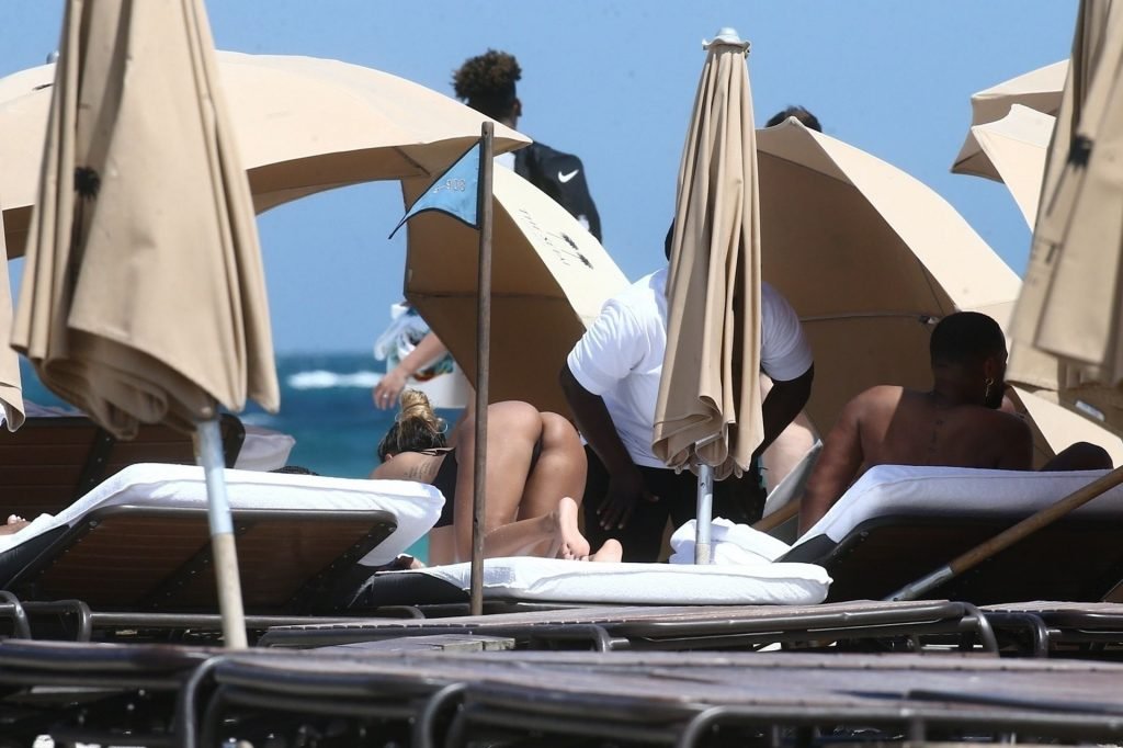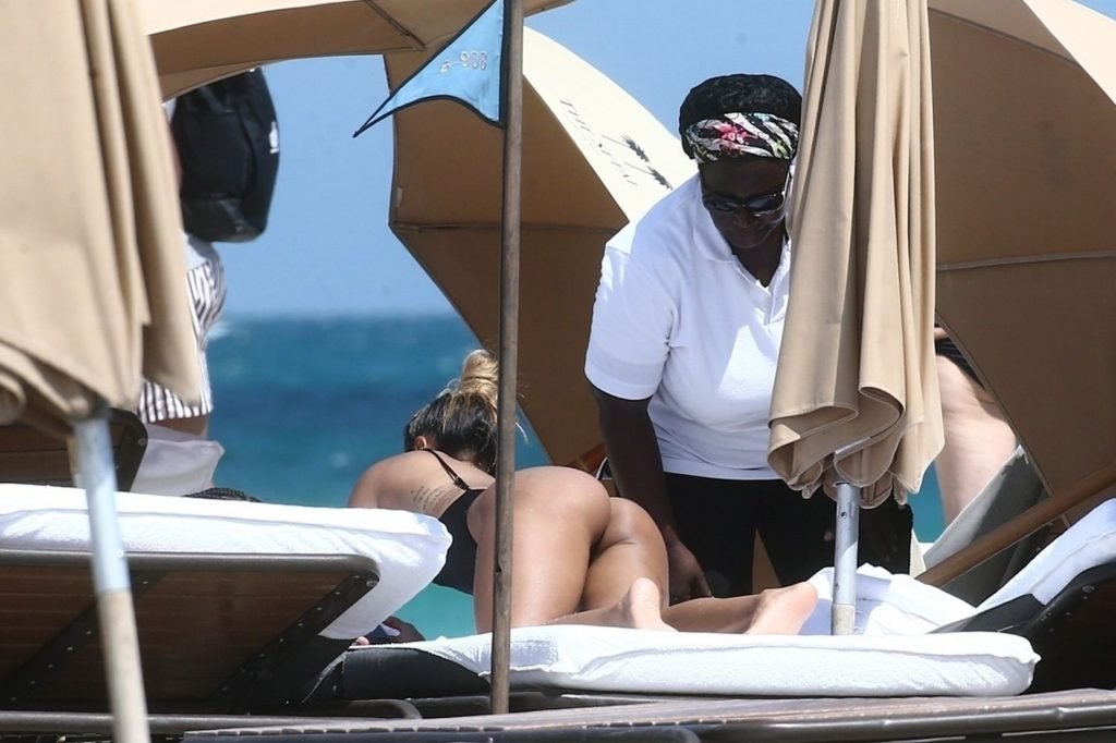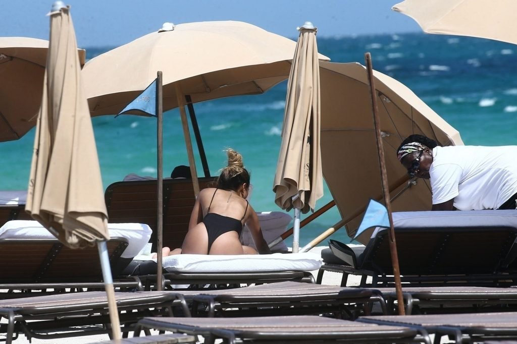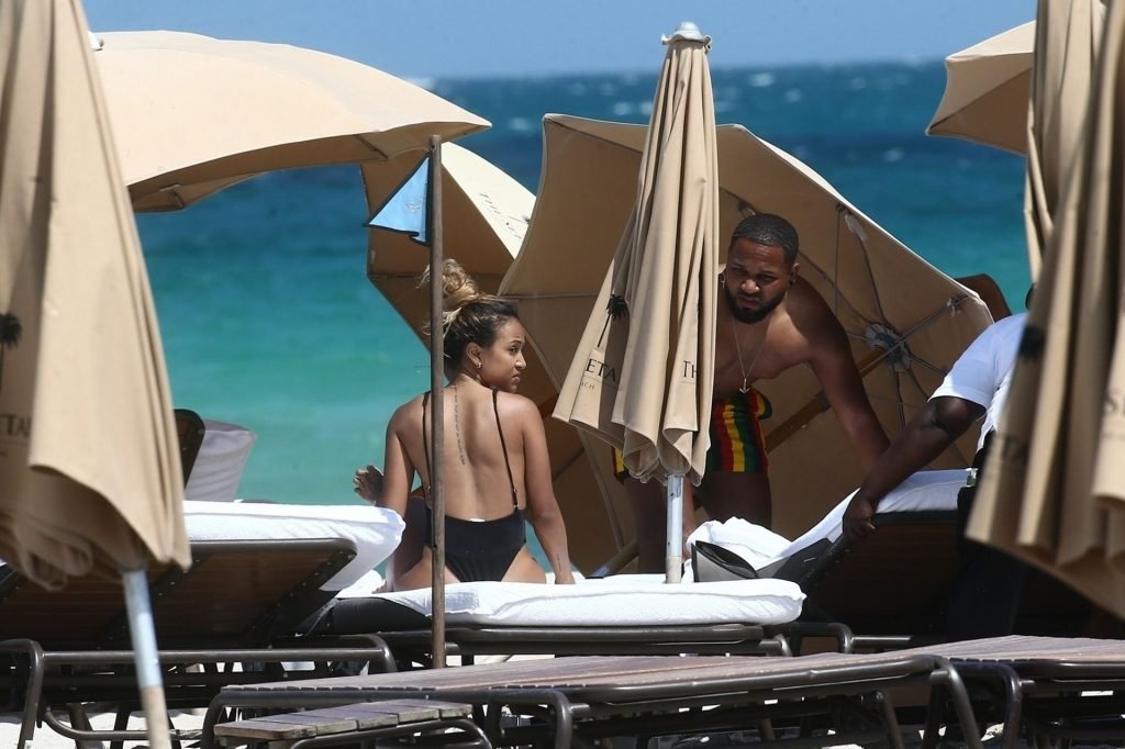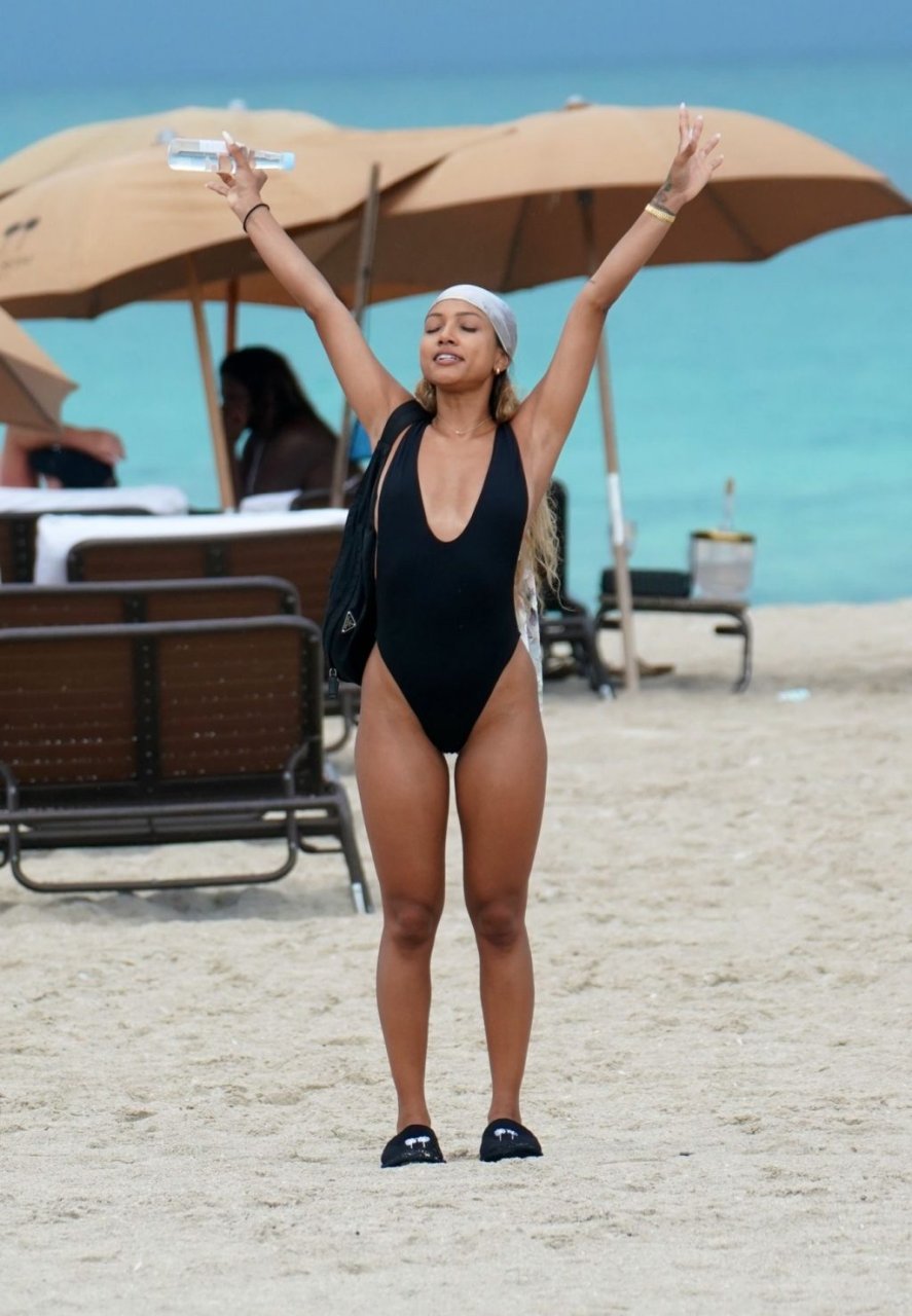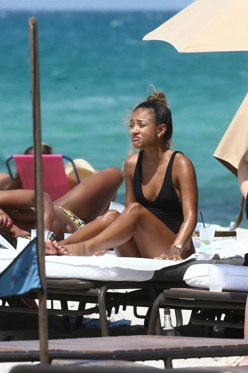 Karrueche Tran disfruta de una bebida mientras toma el sol durante un divertido viaje a la playa en Miami con amigos, 13/05/2019. Karrueche, quien actualmente protagoniza a Virginia en ‘Claws’ de TNT, mostró sus curvas con un traje de baño negro de una pieza, revelando todo su arduo trabajo en el gimnasio mientras los paparazzi tomaban fotos.