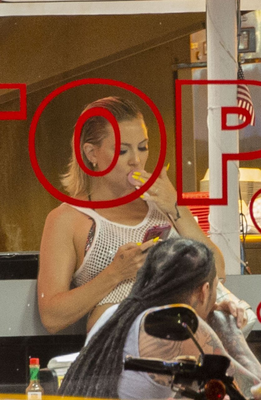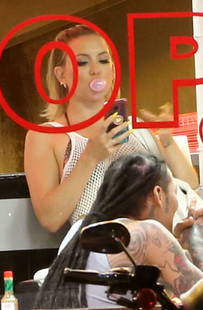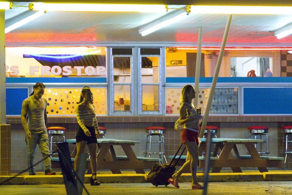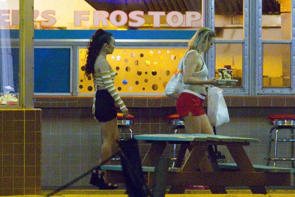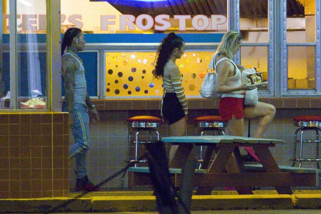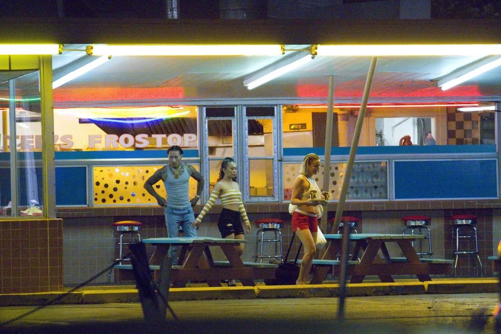 En la escena, la actriz pide hamburguesas y bebidas en la cena y coquetea con un caballero sentado en una mesa comiendo. Mona Lisa y la Luna de Sangre es una aventura fantástica que sigue a una chica con poderes inusuales y peligrosos que escapa de un asilo mental y trata de controlar sus habilidades y valerse por sí misma en Nueva Orleans, 07/08/2019.