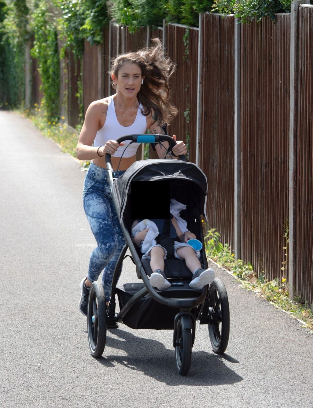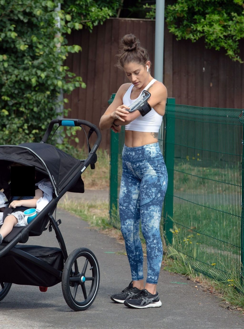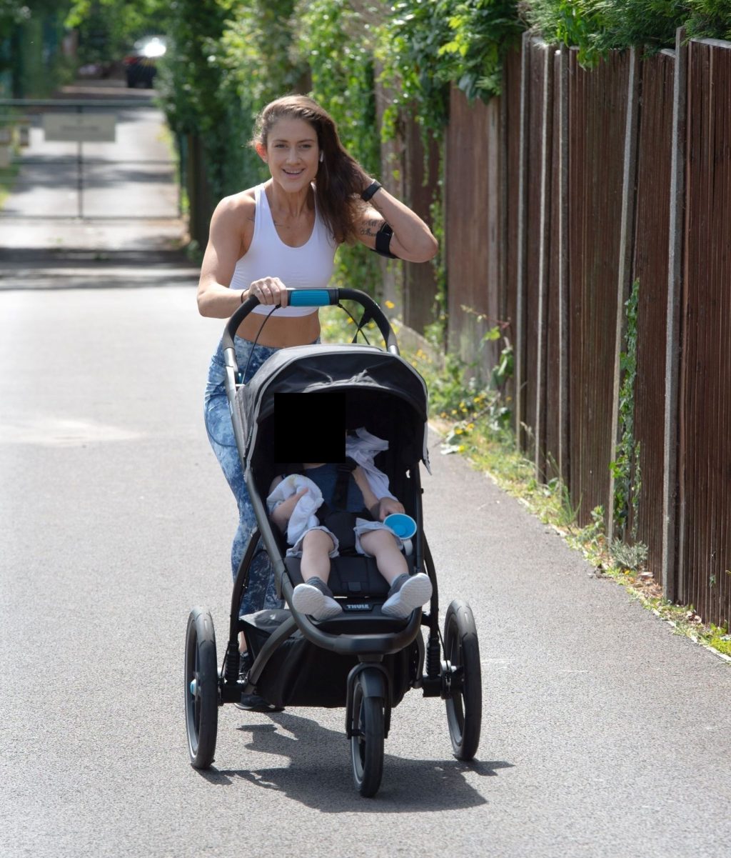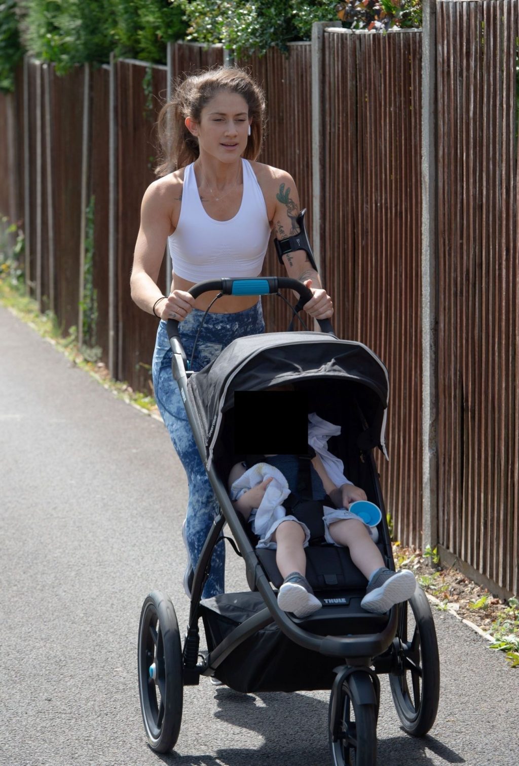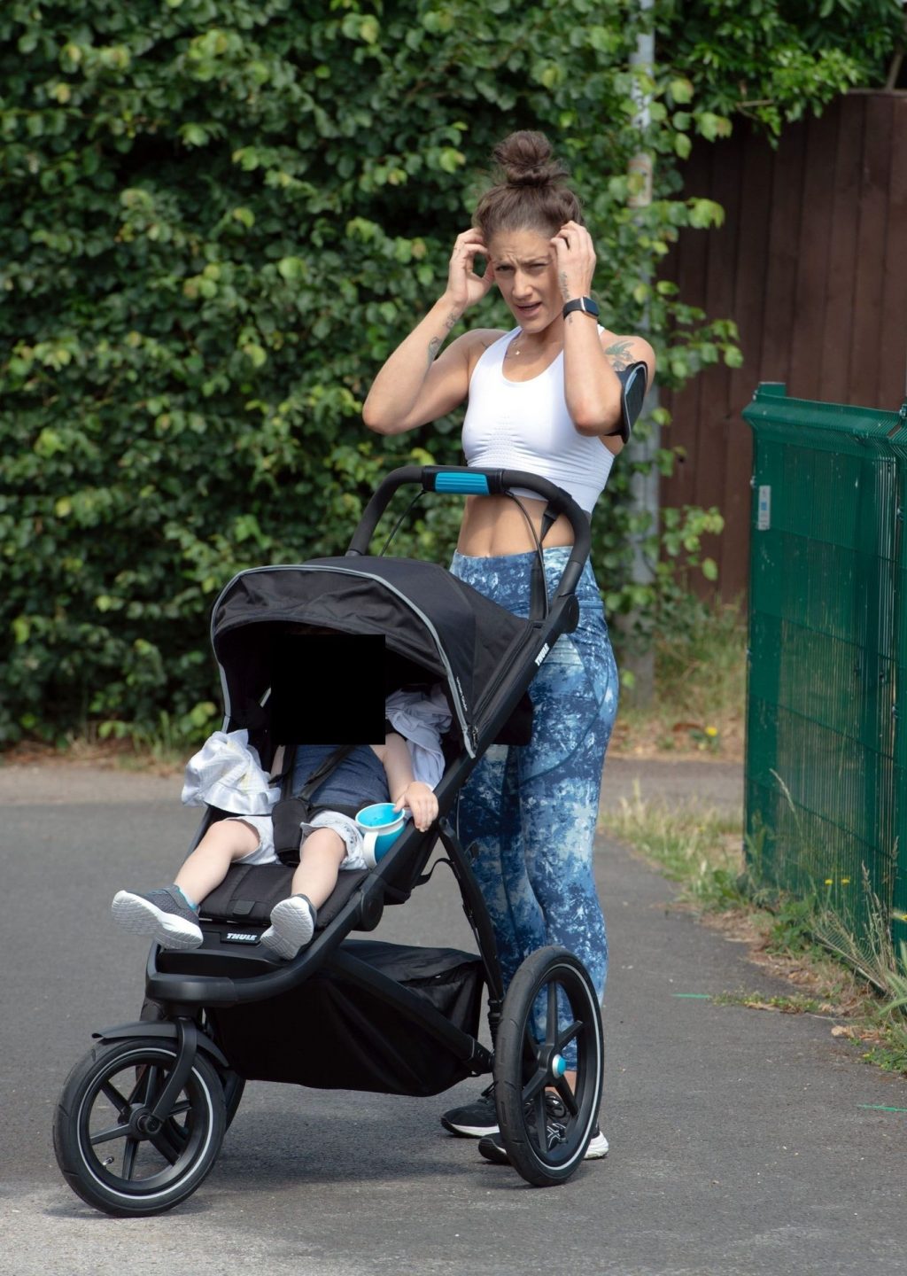 “Estrella de X-Factor” Katie Waissel presume su físico musculoso mientras pasea a su hijo Hudson por el norte de Londres, 16/06/2020. La madre soltera muestra sus abdominales impresionantes con un par de pantalones deportivos azules y una camiseta blanca mientras es vista cerca de su casa.