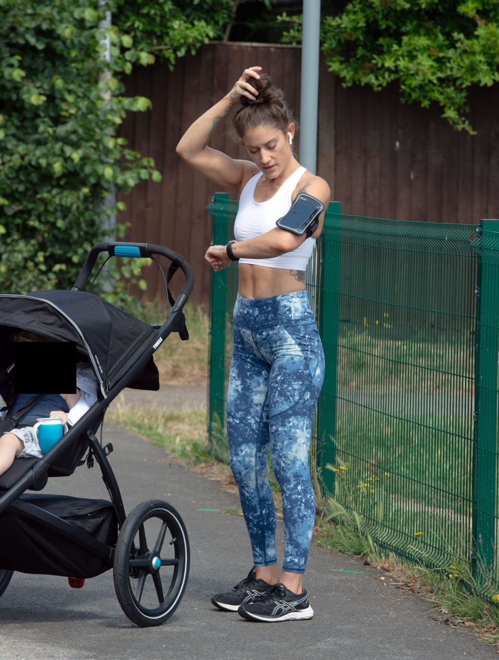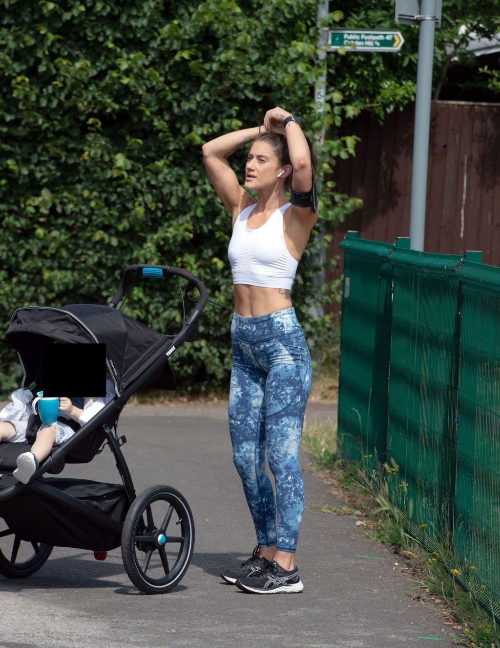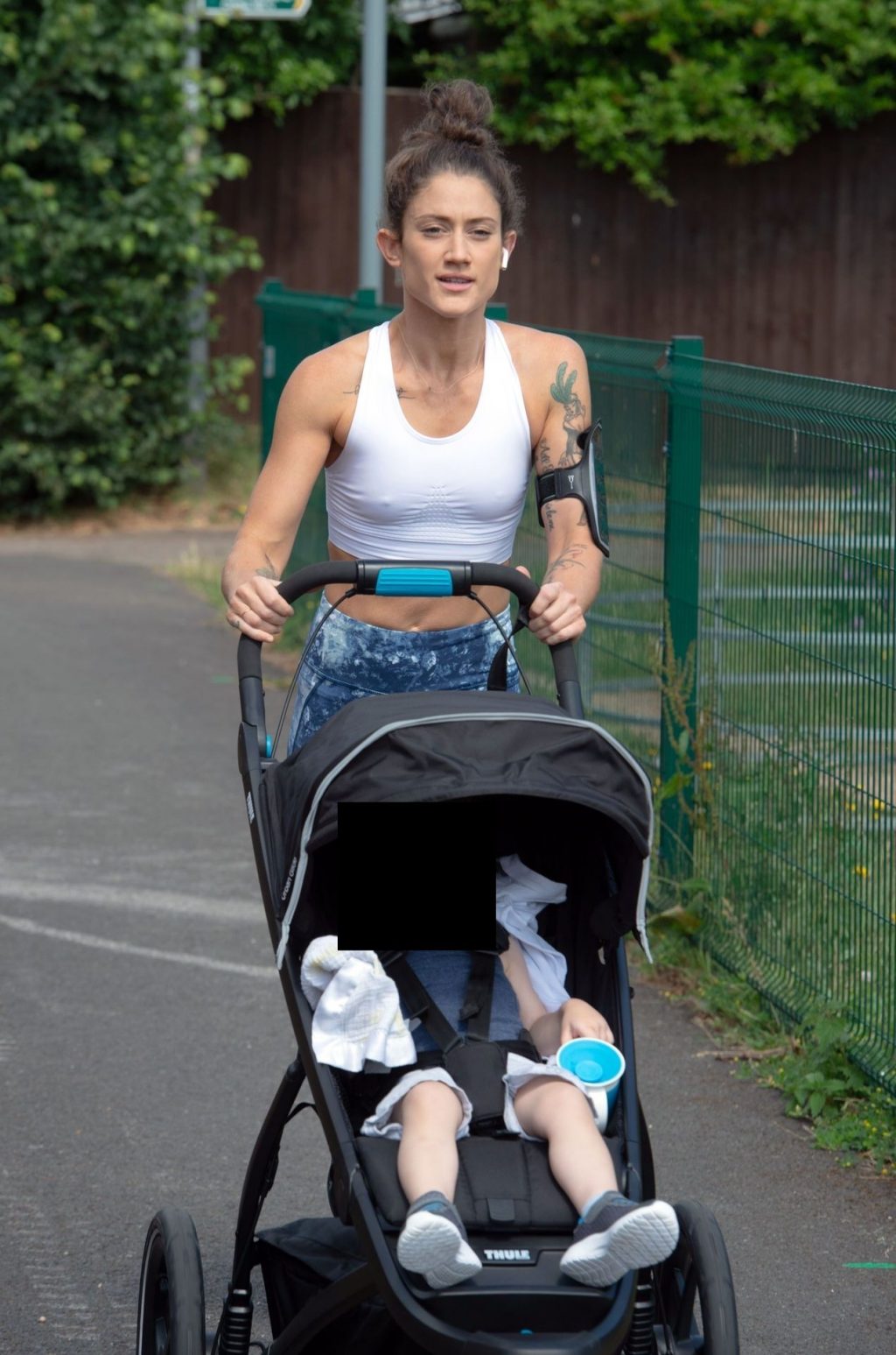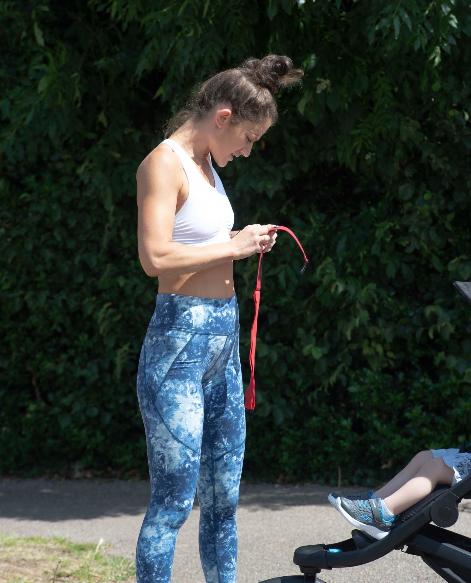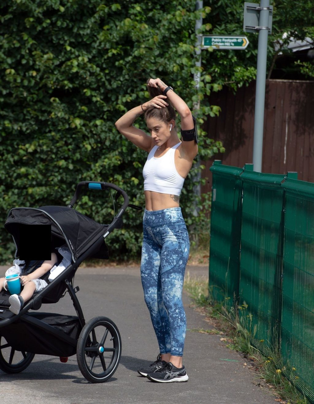 “Estrella de X-Factor” Katie Waissel presume su físico musculoso mientras pasea a su hijo Hudson por el norte de Londres, 16/06/2020. La madre soltera muestra sus abdominales impresionantes con un par de pantalones deportivos azules y una camiseta blanca mientras es vista cerca de su casa.
