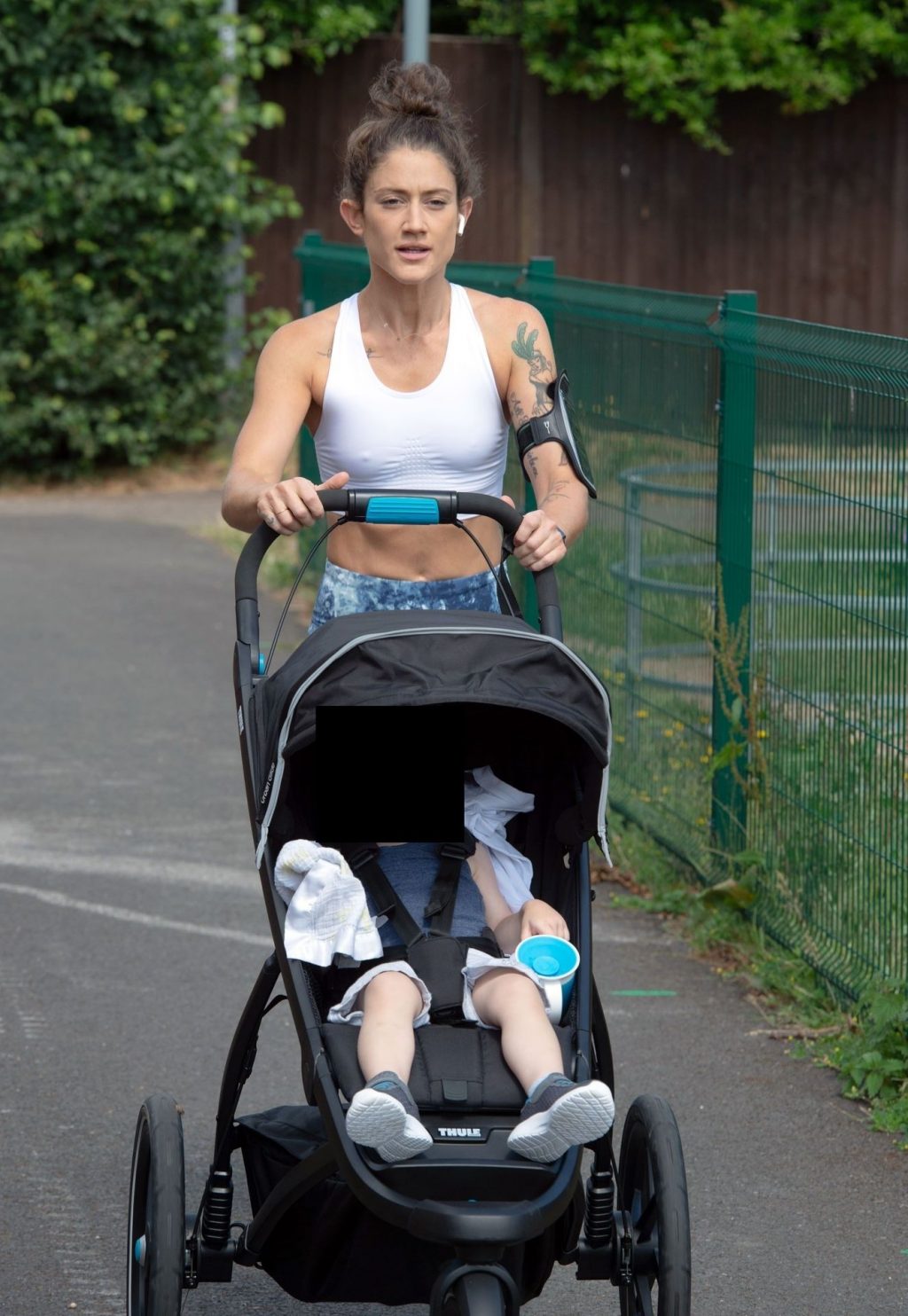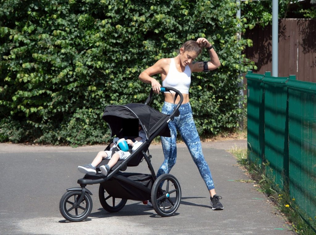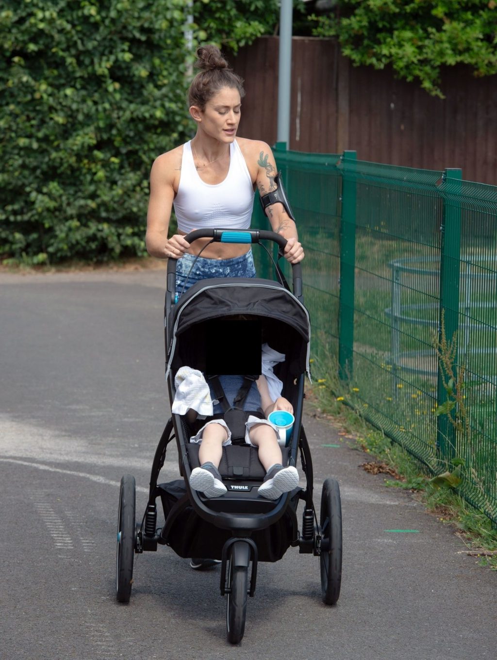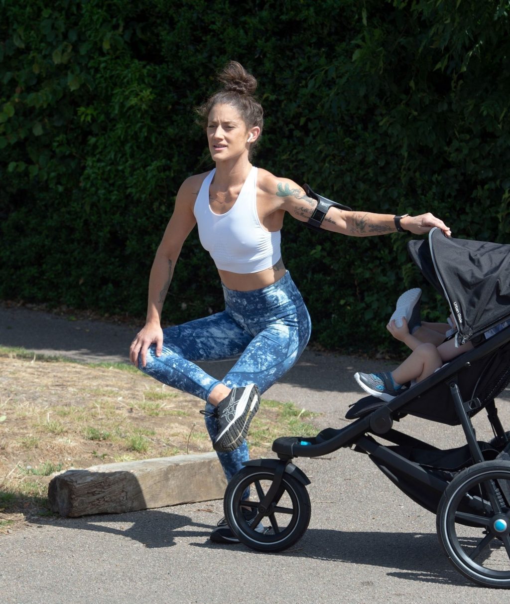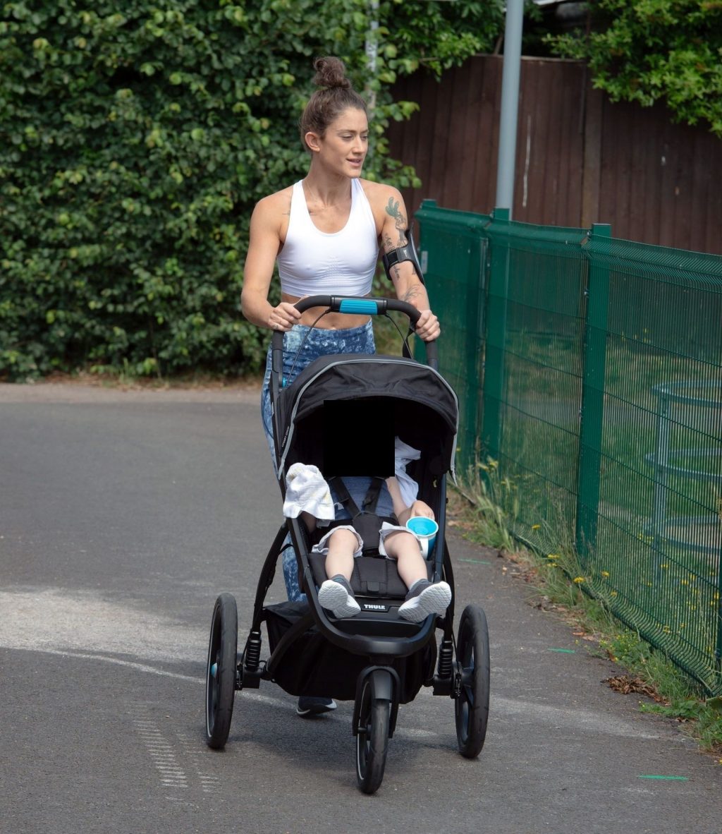“Estrella de X-Factor” Katie Waissel presume su físico musculoso mientras pasea a su hijo Hudson por el norte de Londres, 16/06/2020. La madre soltera muestra sus abdominales impresionantes con un par de pantalones deportivos azules y una camiseta blanca mientras es vista cerca de su casa.