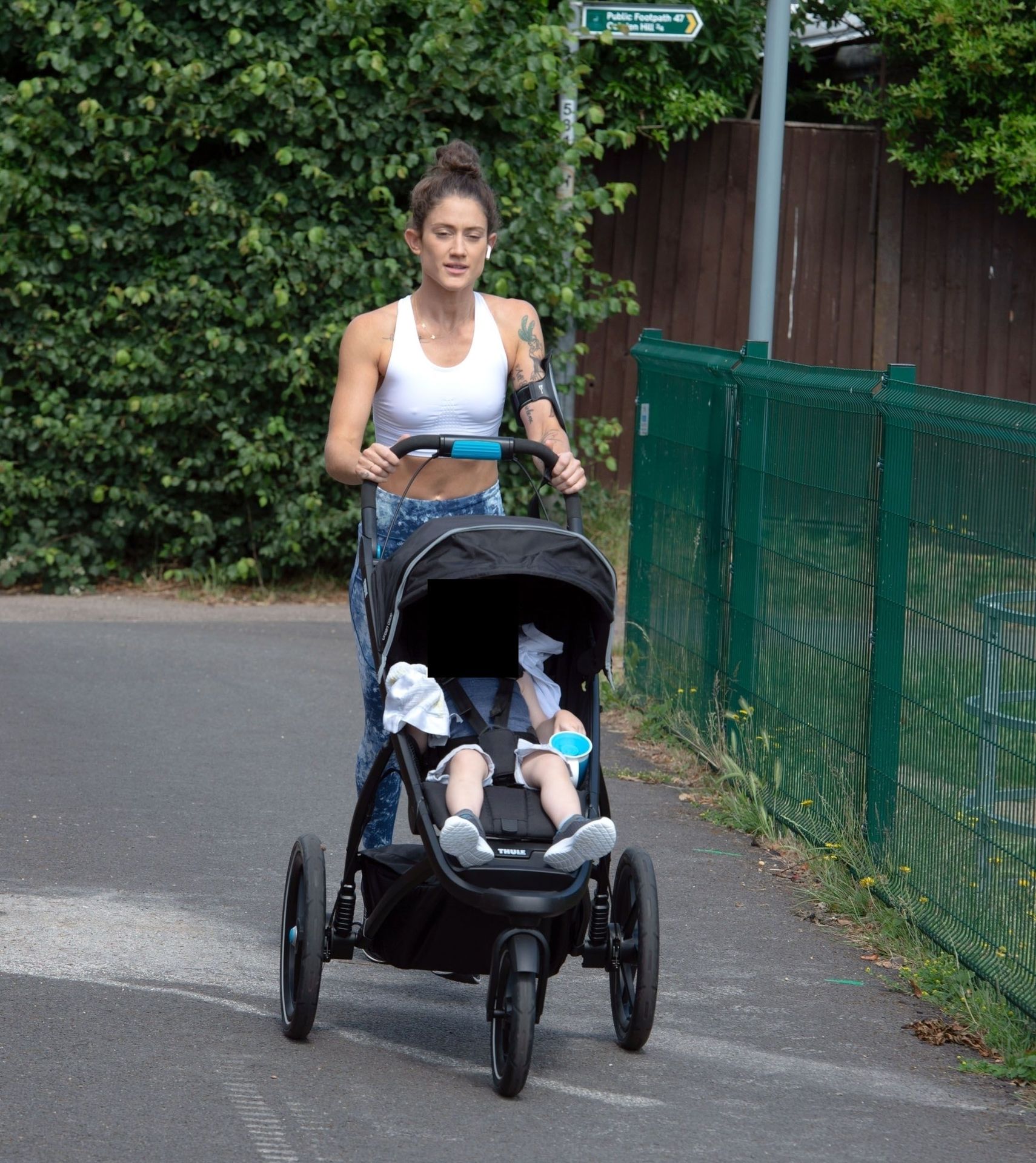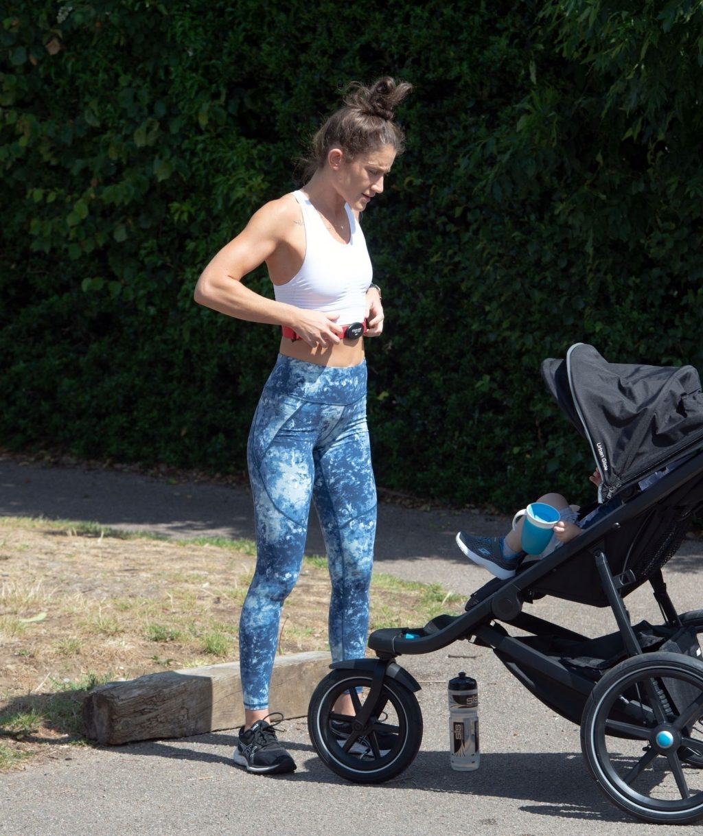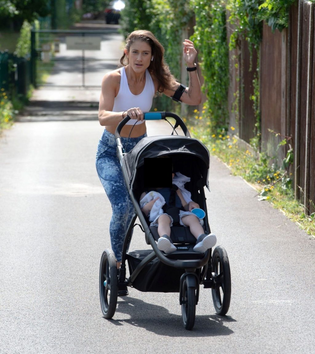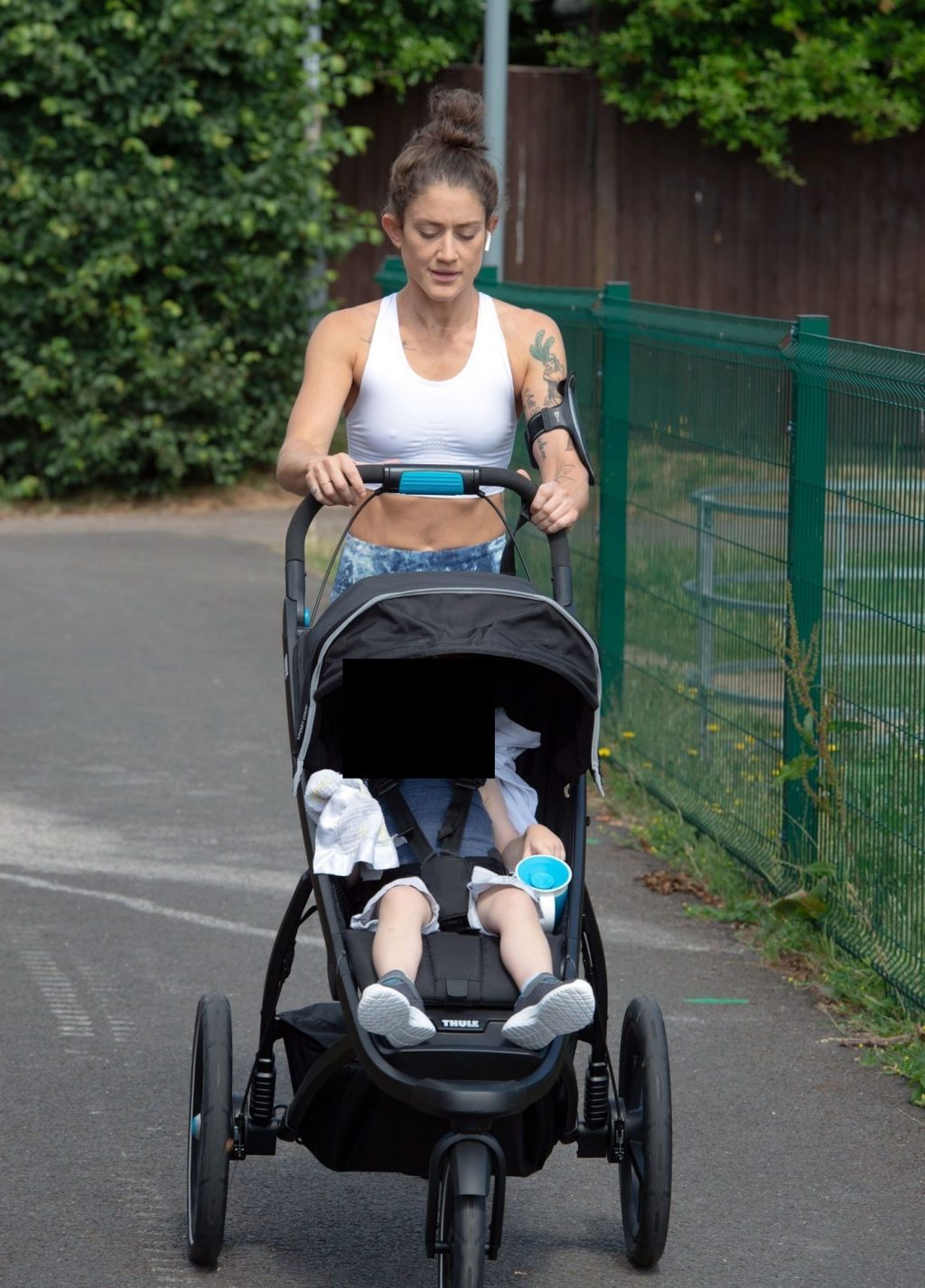 “Estrella de X-Factor” Katie Waissel presume su físico musculoso mientras pasea a su hijo Hudson por el norte de Londres, 16/06/2020. La madre soltera muestra sus abdominales impresionantes con un par de pantalones deportivos azules y una camiseta blanca mientras es vista cerca de su casa.