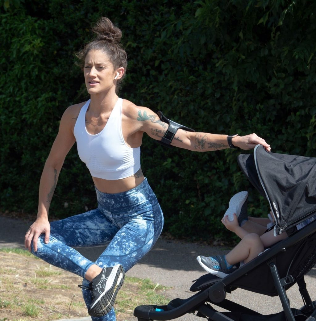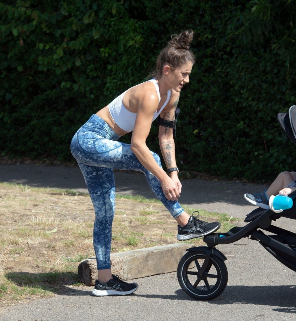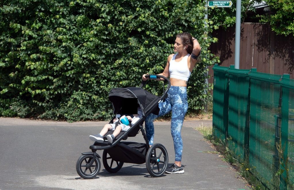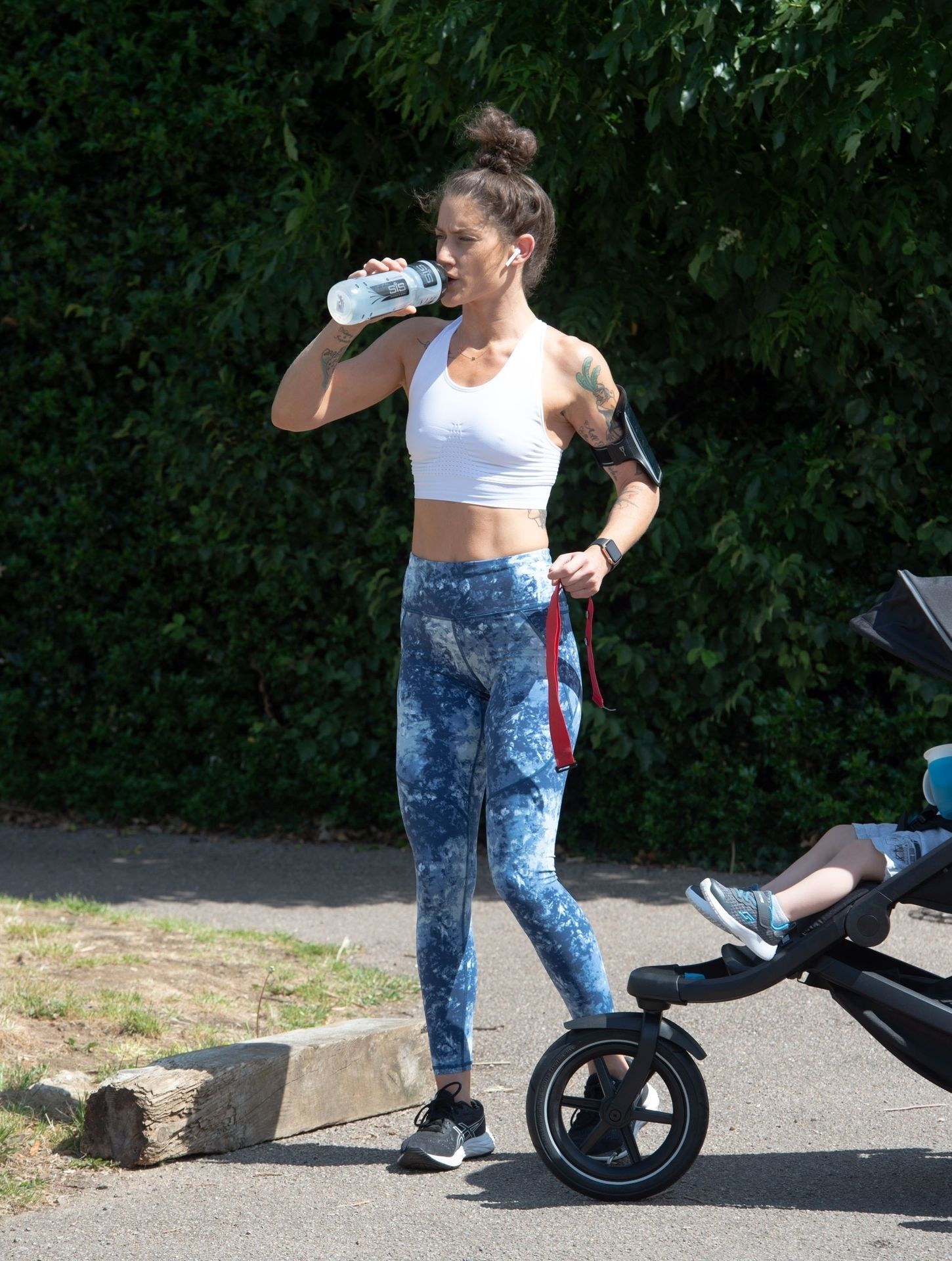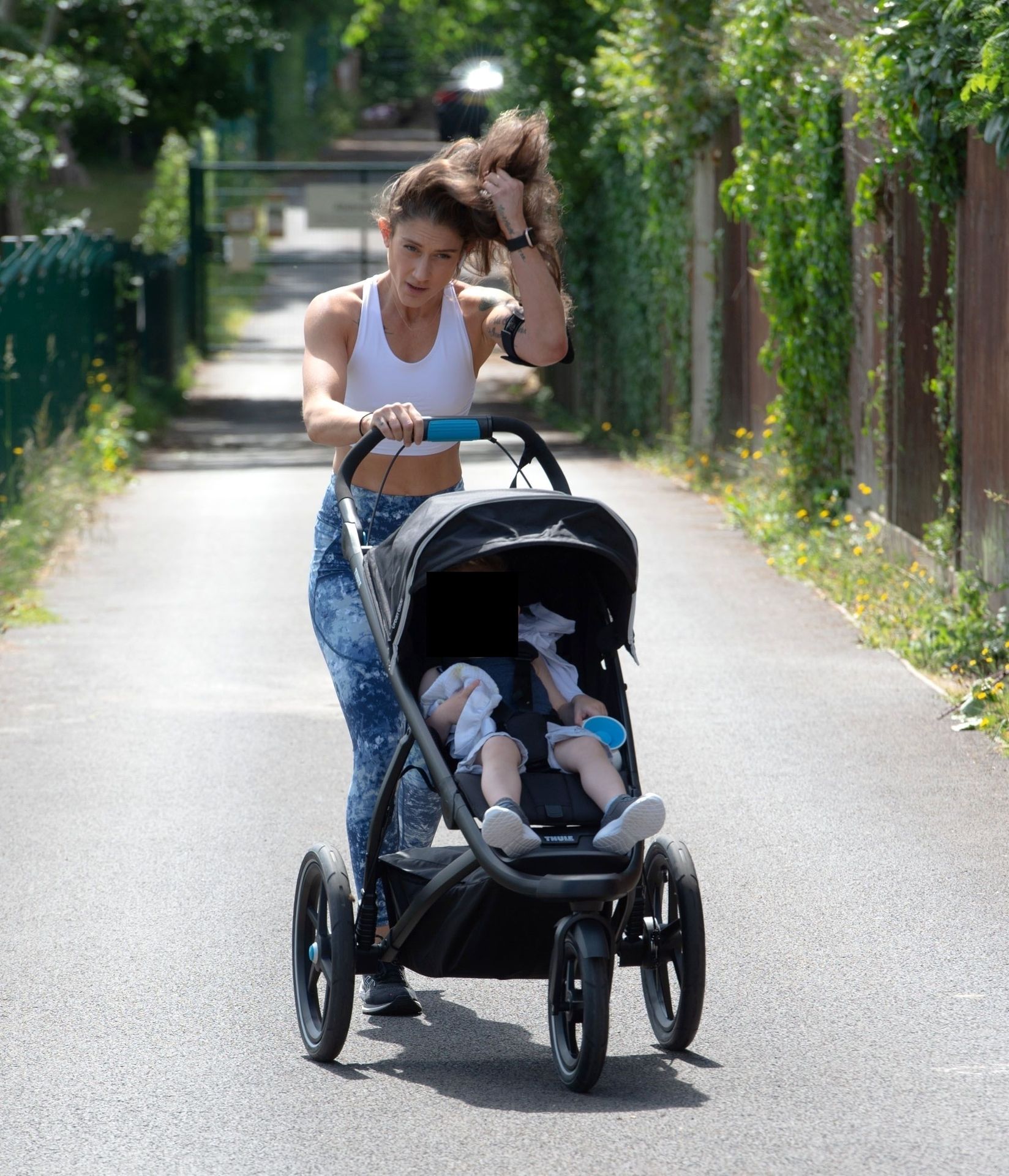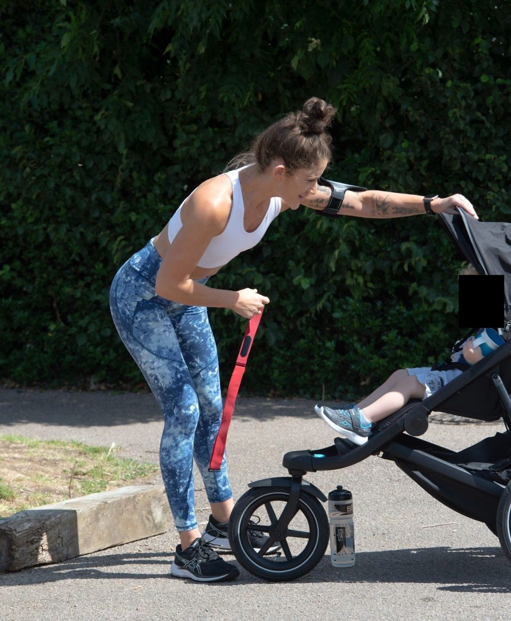 “Estrella de X-Factor” Katie Waissel presume su físico musculoso mientras pasea a su hijo Hudson por el norte de Londres, 16/06/2020. La madre soltera muestra sus abdominales impresionantes con un par de pantalones deportivos azules y una camiseta blanca mientras es vista cerca de su casa.