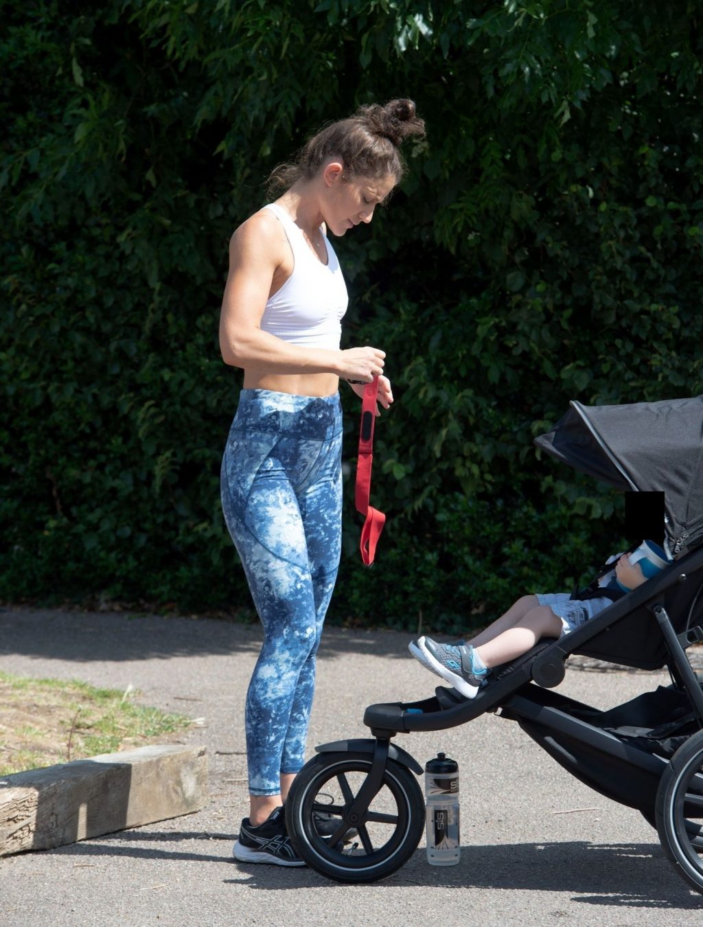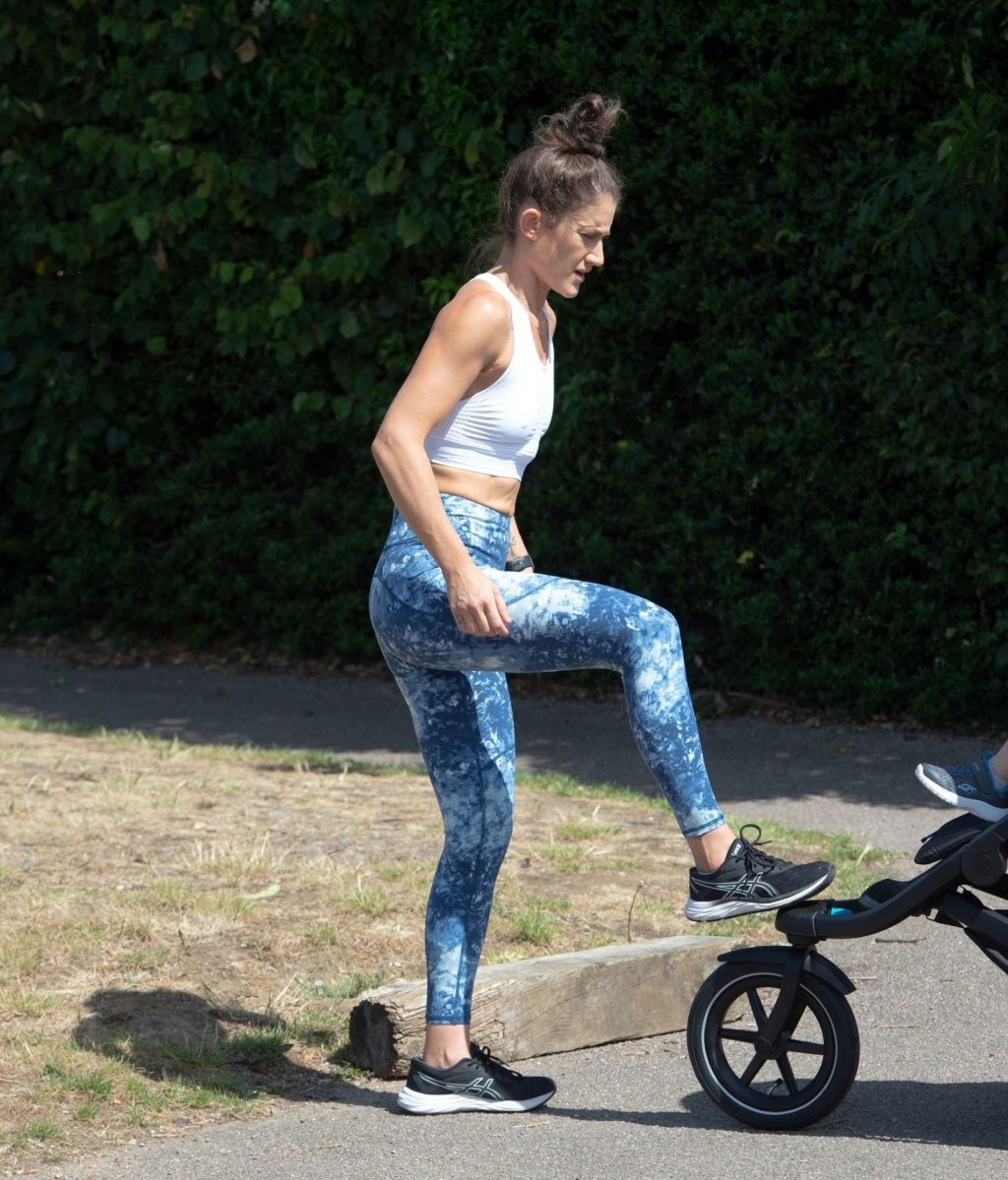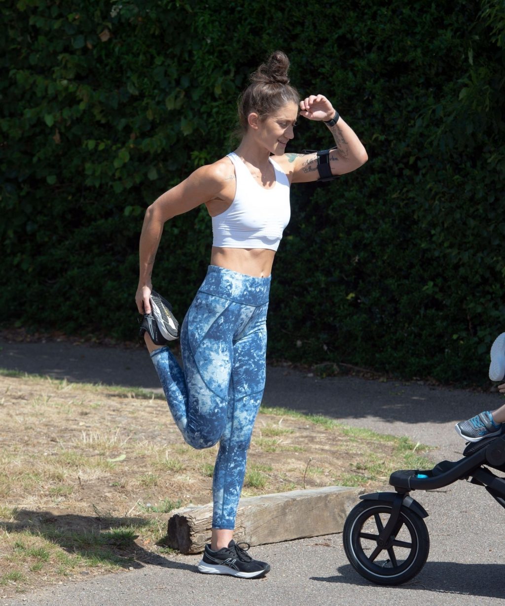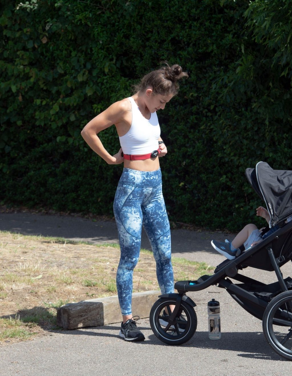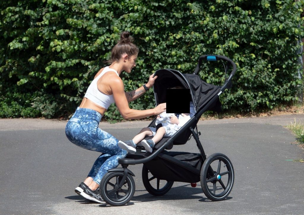 “Estrella de X-Factor” Katie Waissel presume su físico musculoso mientras pasea a su hijo Hudson por el norte de Londres, 16/06/2020. La madre soltera muestra sus abdominales impresionantes con un par de pantalones deportivos azules y una camiseta blanca mientras es vista cerca de su casa.