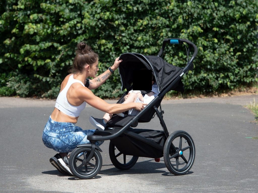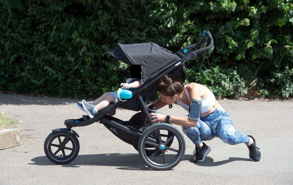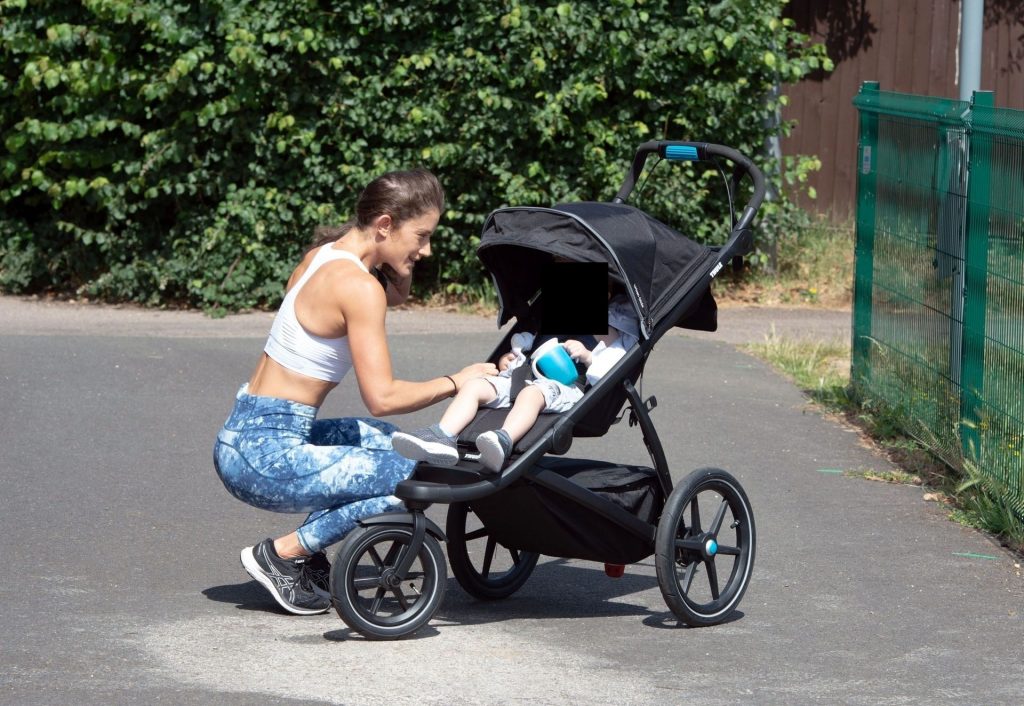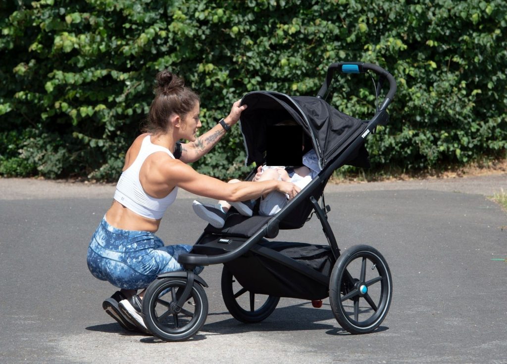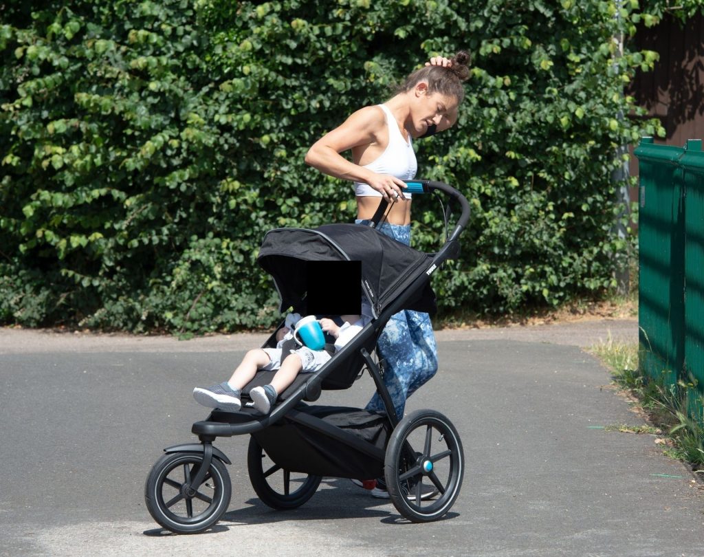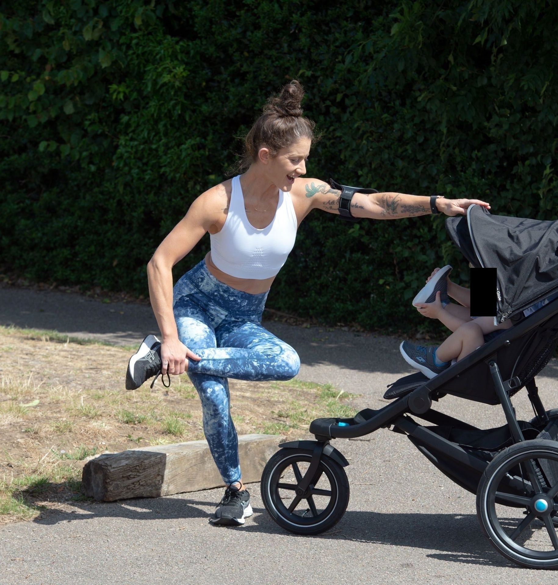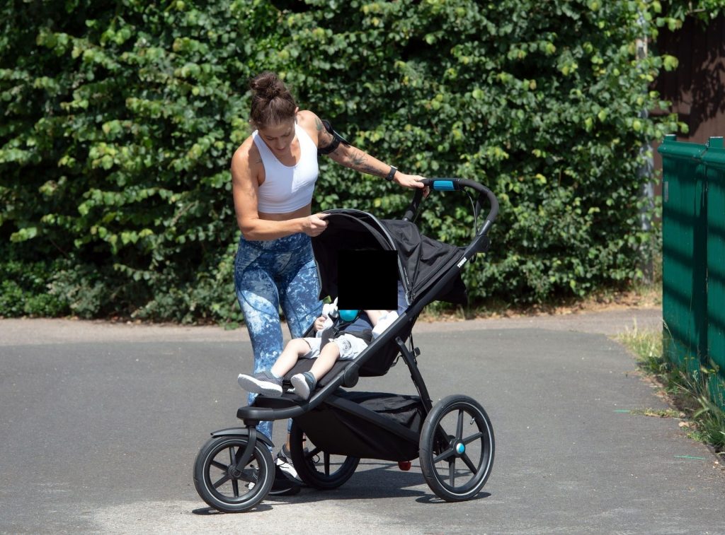 “Estrella de X-Factor” Katie Waissel presume su físico musculoso mientras pasea a su hijo Hudson por el norte de Londres, 16/06/2020. La madre soltera muestra sus abdominales impresionantes con un par de pantalones deportivos azules y una camiseta blanca mientras es vista cerca de su casa.