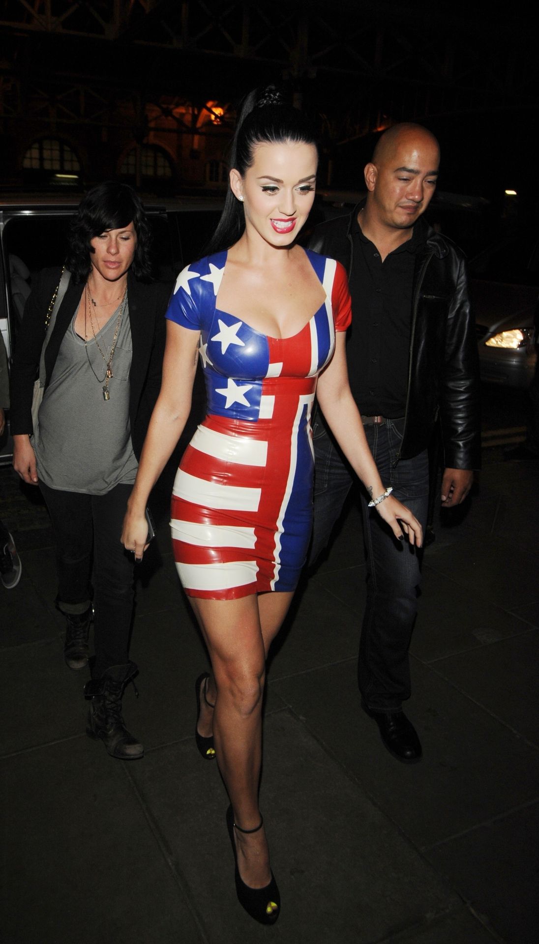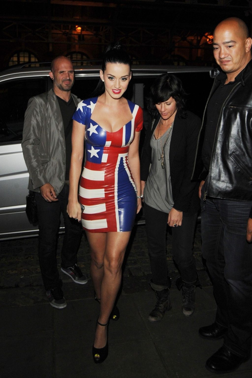 Cantante Katy Perry fue vista en Nobu Berkley usando un vestido de PVC que mostraba medio una bandera americana y medio la Union Jack en Londres, 12/06/2010.