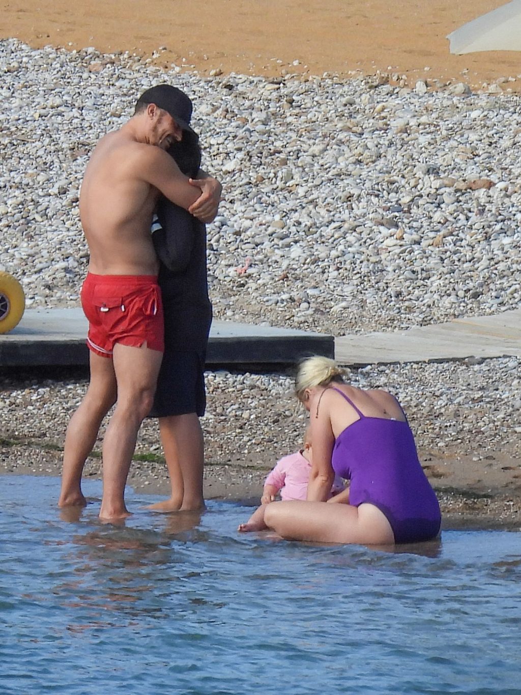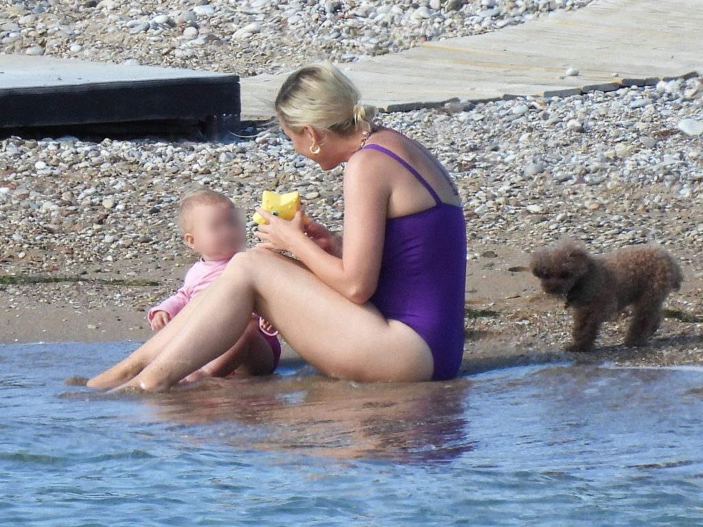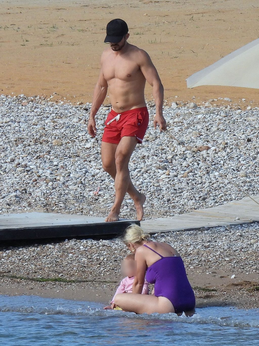 La megaestrella del pop, de 36 años, lució un llamativo traje de una pieza mientras tomaba el sol y se daba un baño mientras la familia se relajaba en el Peloponeso.