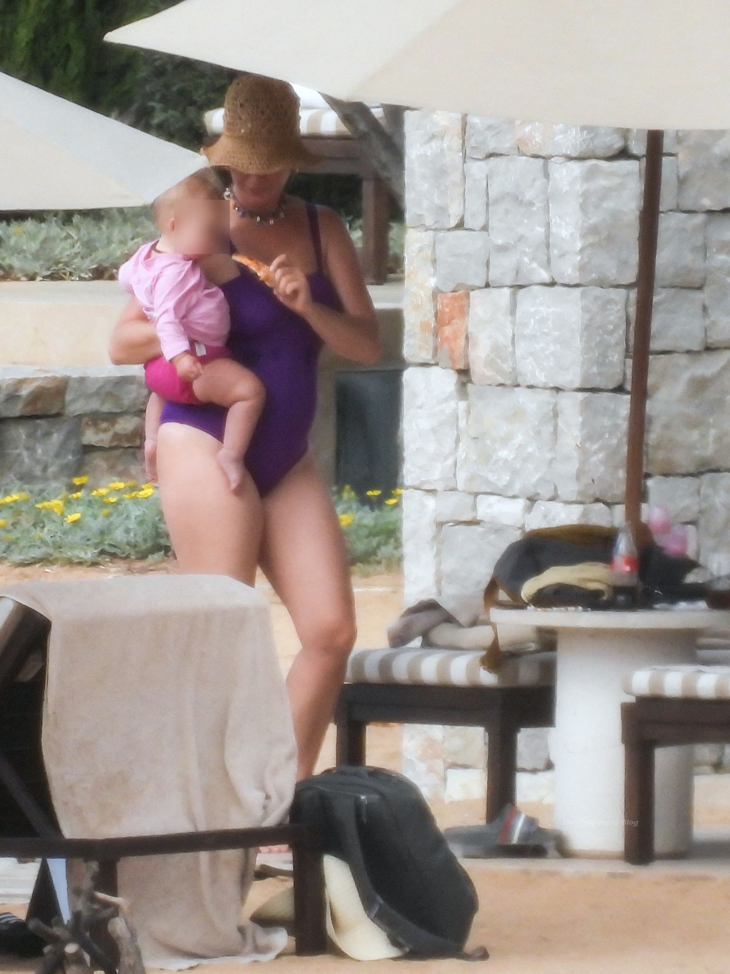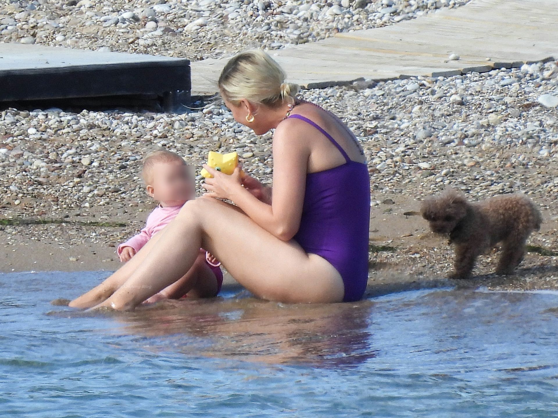 La megaestrella del pop, de 36 años, lució un llamativo traje de una pieza mientras tomaba el sol y se daba un baño mientras la familia se relajaba en el Peloponeso.