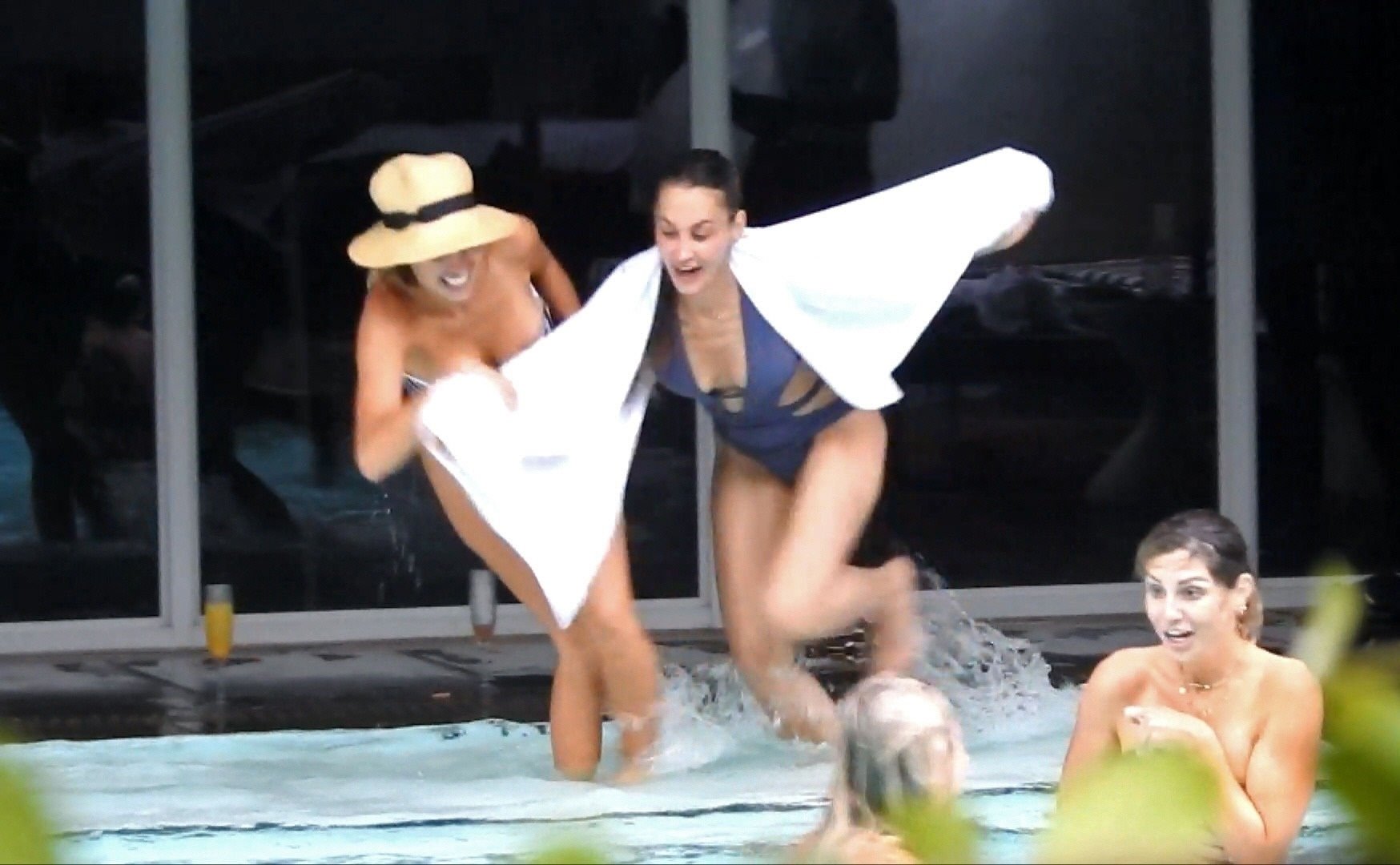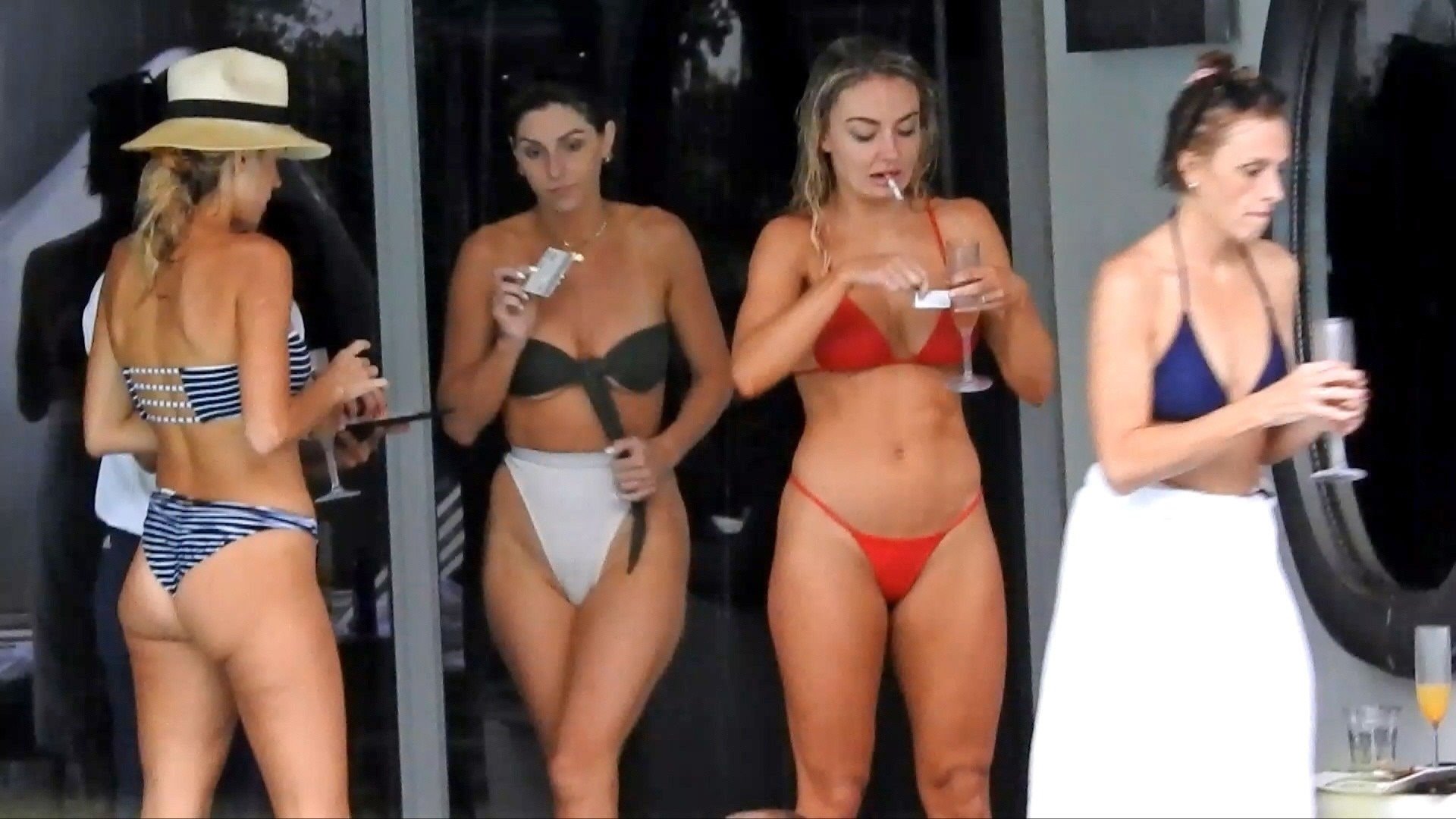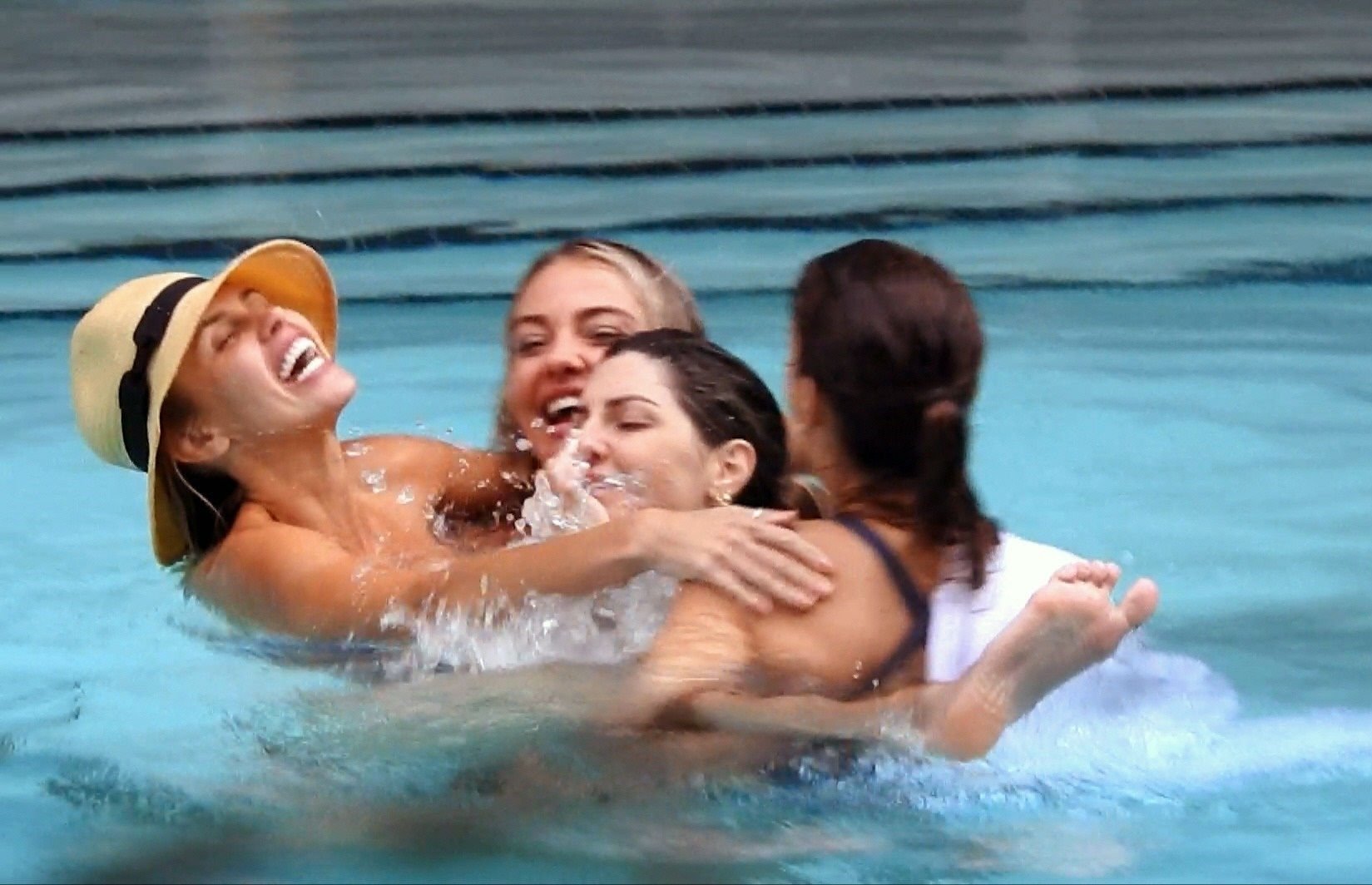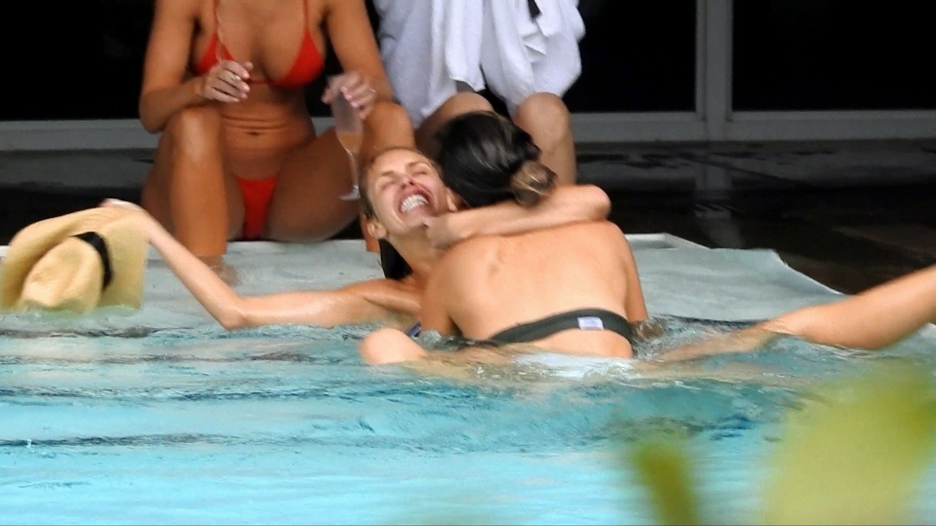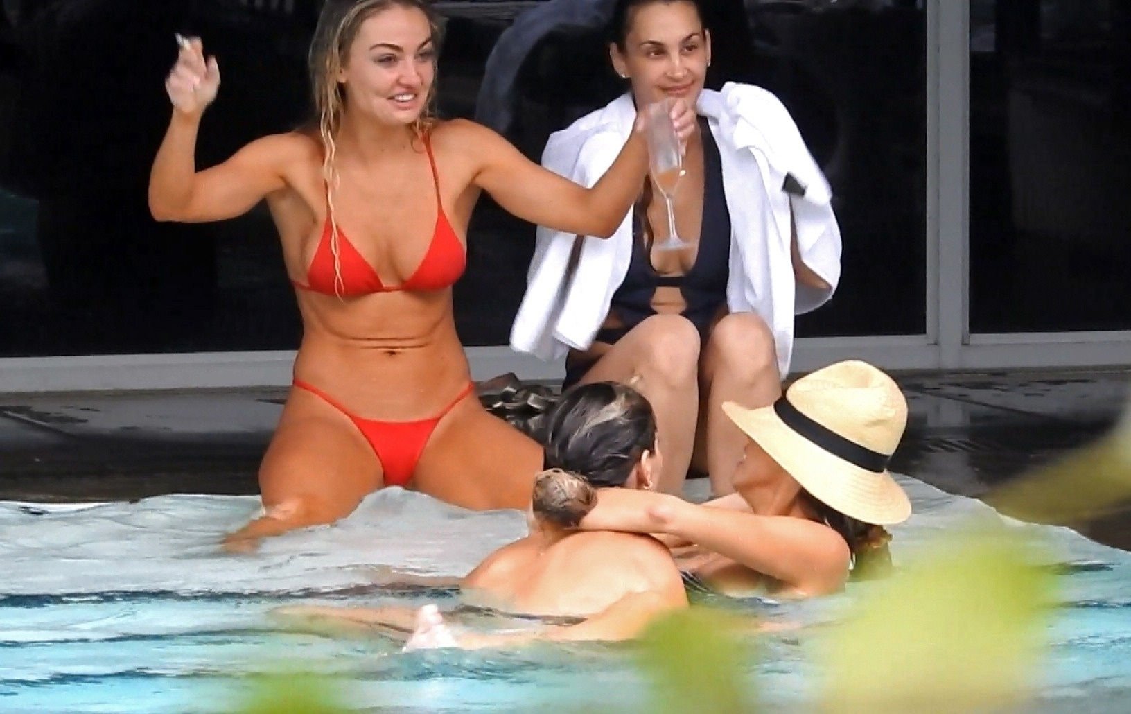 Se la ve riendo, bailando, nadando y abrazando a su adorable grupo de despedida de soltera, todas con bikinis. Se les ve en un abrazo grupal muy cercano dentro de la piscina, y una de las chicas mostró sus pechos y pezón. Su amiga cercana, la bomba rubia y DJ Brooke Evers, lució fantástica con un bikini rojo, y Kayla publicó todos los nombres de las chicas en su Instagram.