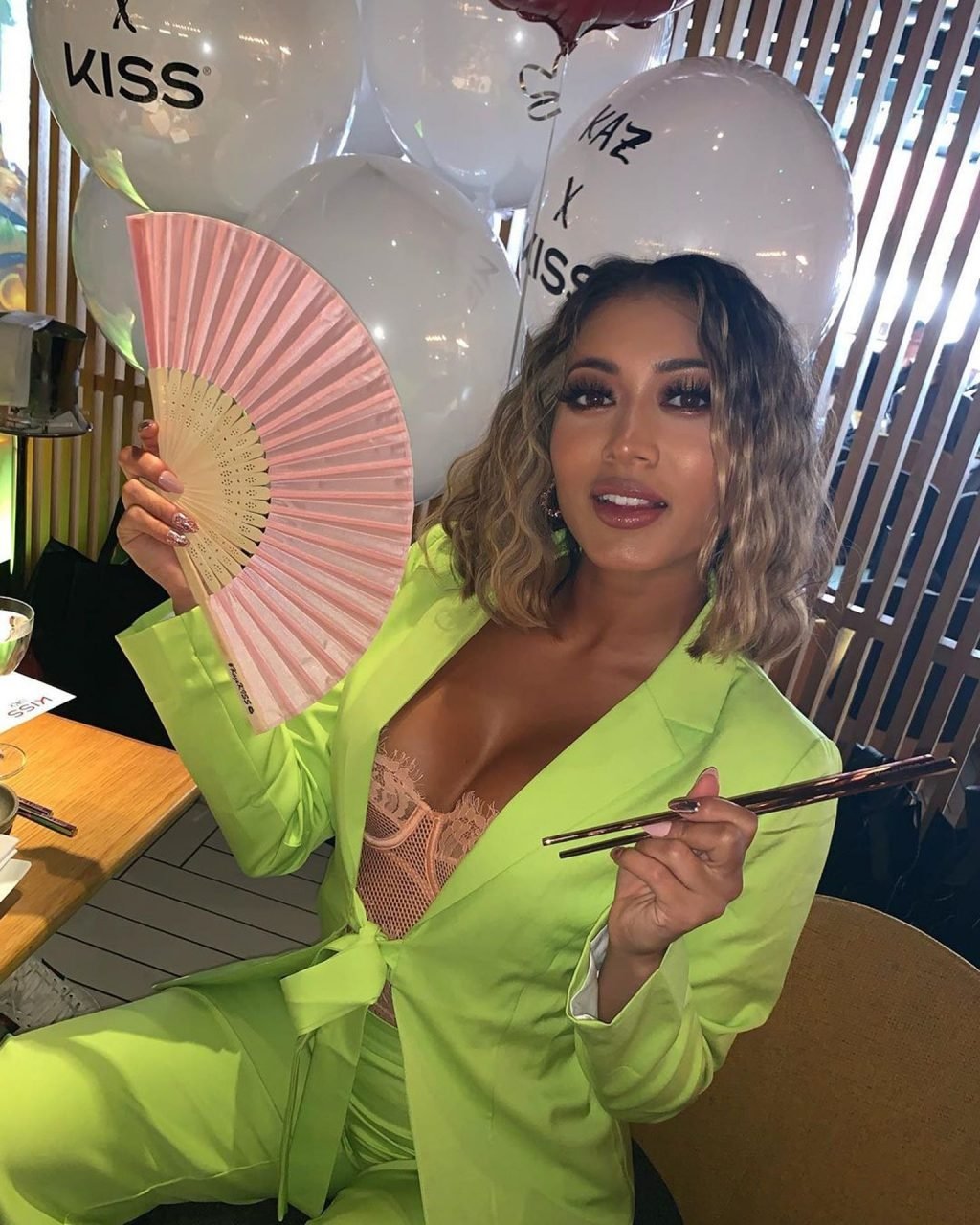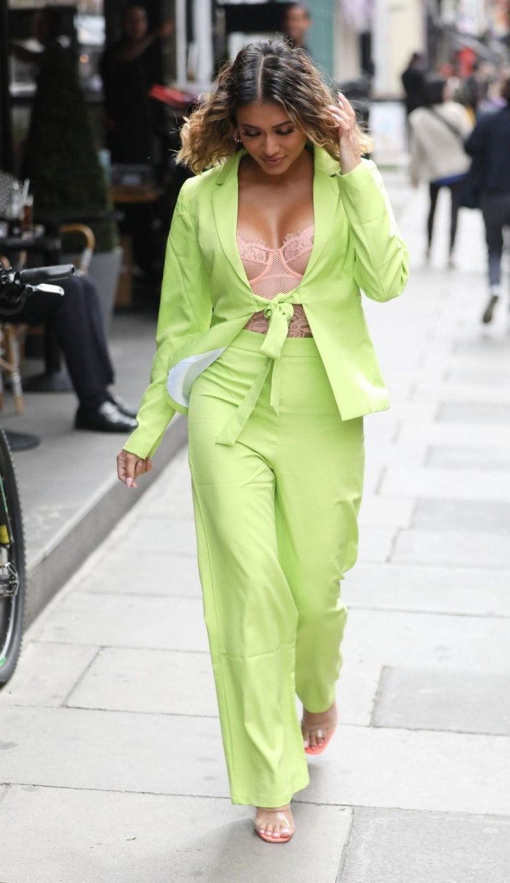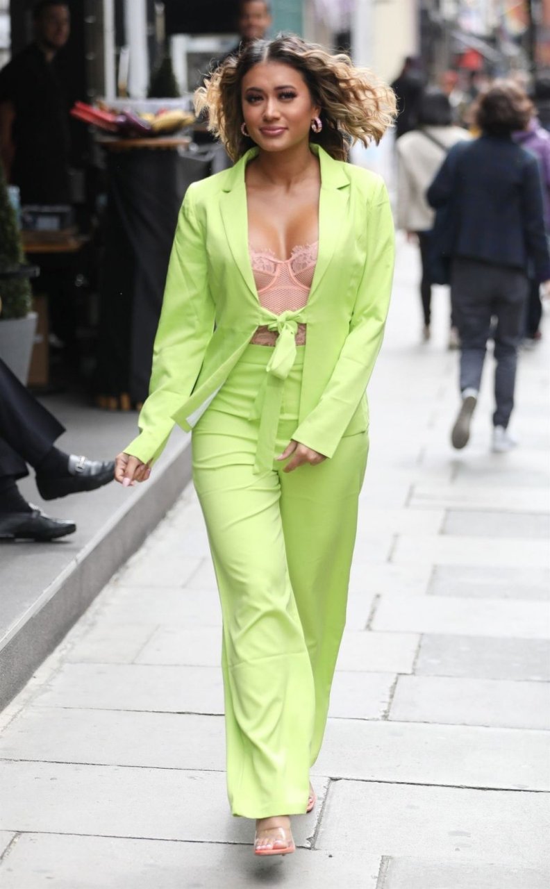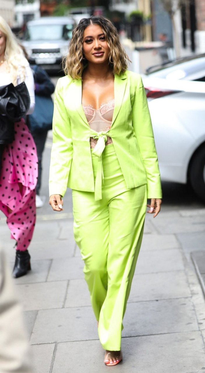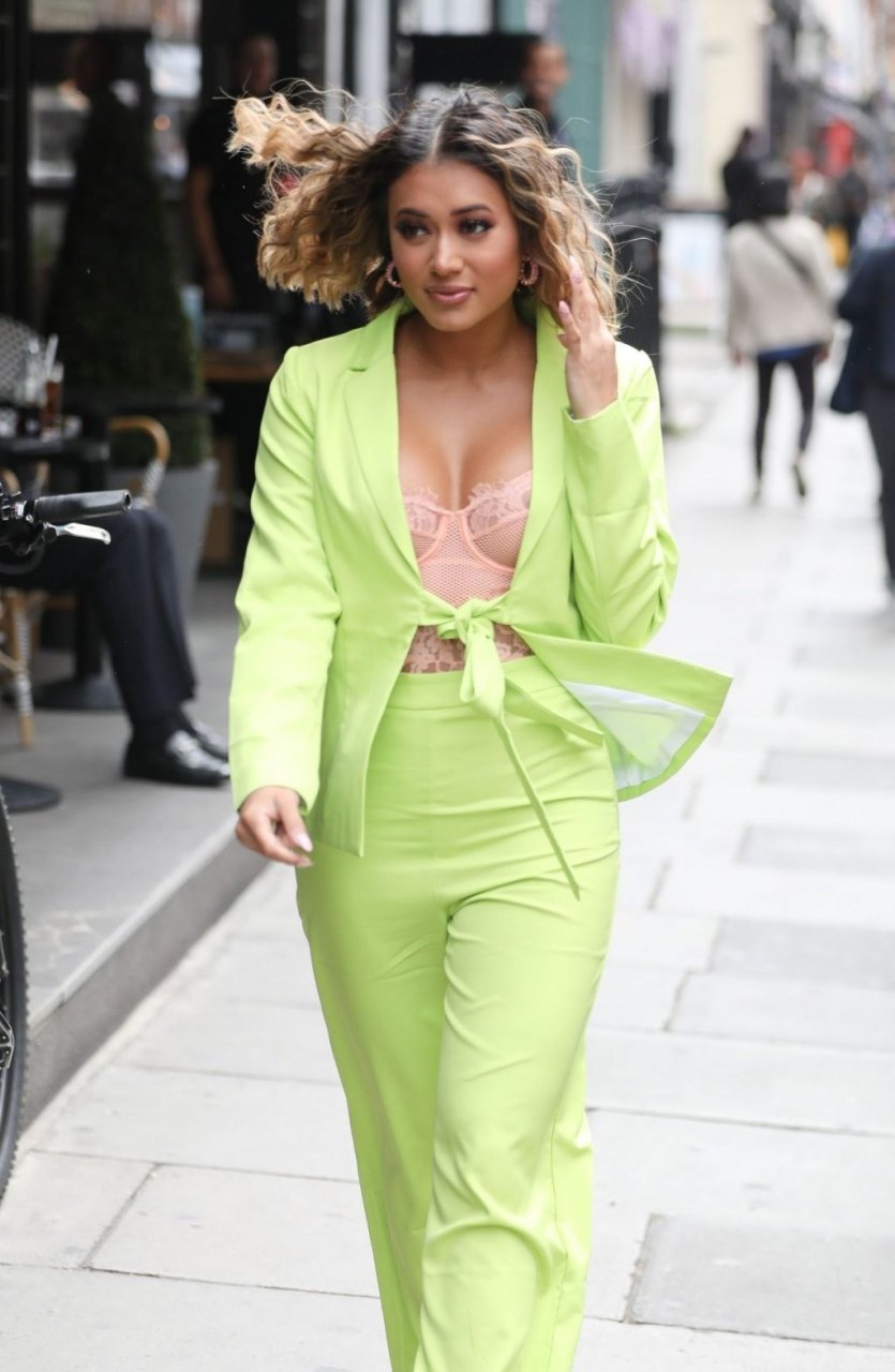 Sexy estrella de “Love Island” Kazimir “Kaz” Crossley muestra un sexy sujetador de encaje rosa bajo un traje de pantalón al llegar al restaurante Chotto Matte en Londres, 29/05/2019.