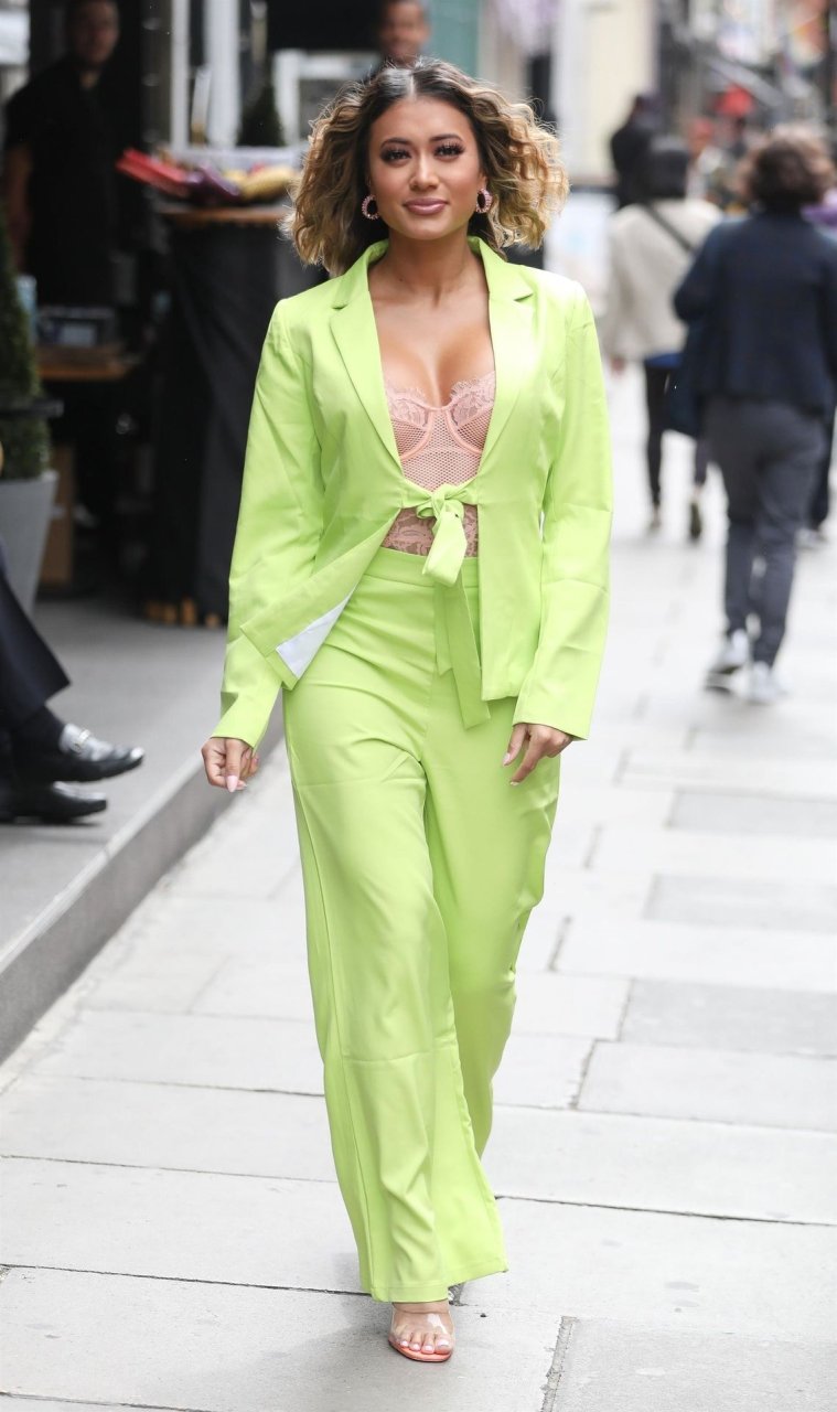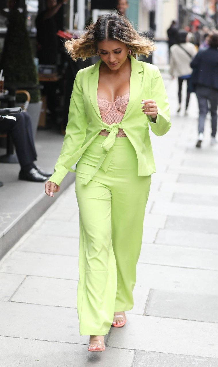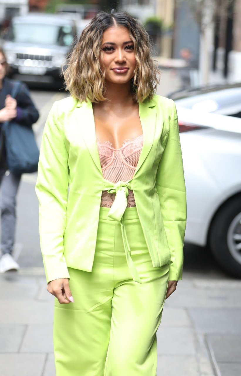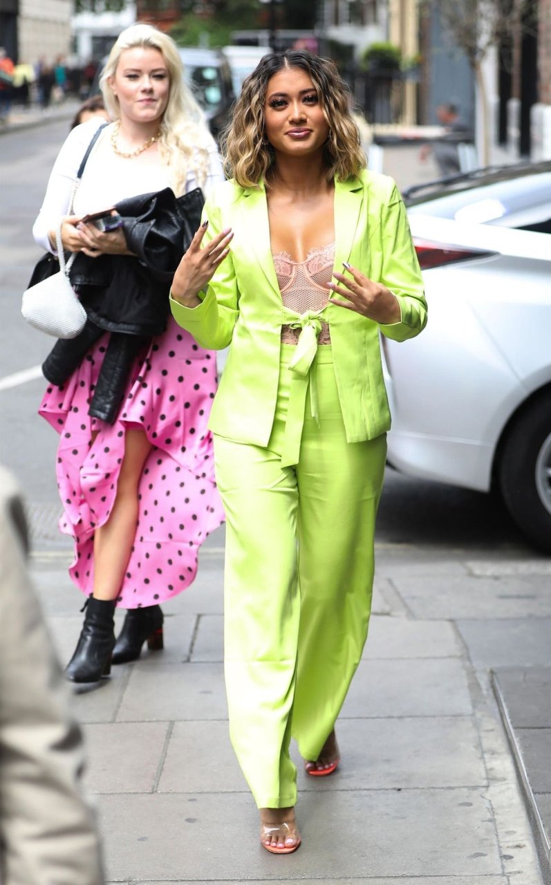 Sexy estrella de “Love Island” Kazimir “Kaz” Crossley muestra un sexy sujetador de encaje rosa bajo un traje de pantalón al llegar al restaurante Chotto Matte en Londres, 29/05/2019.